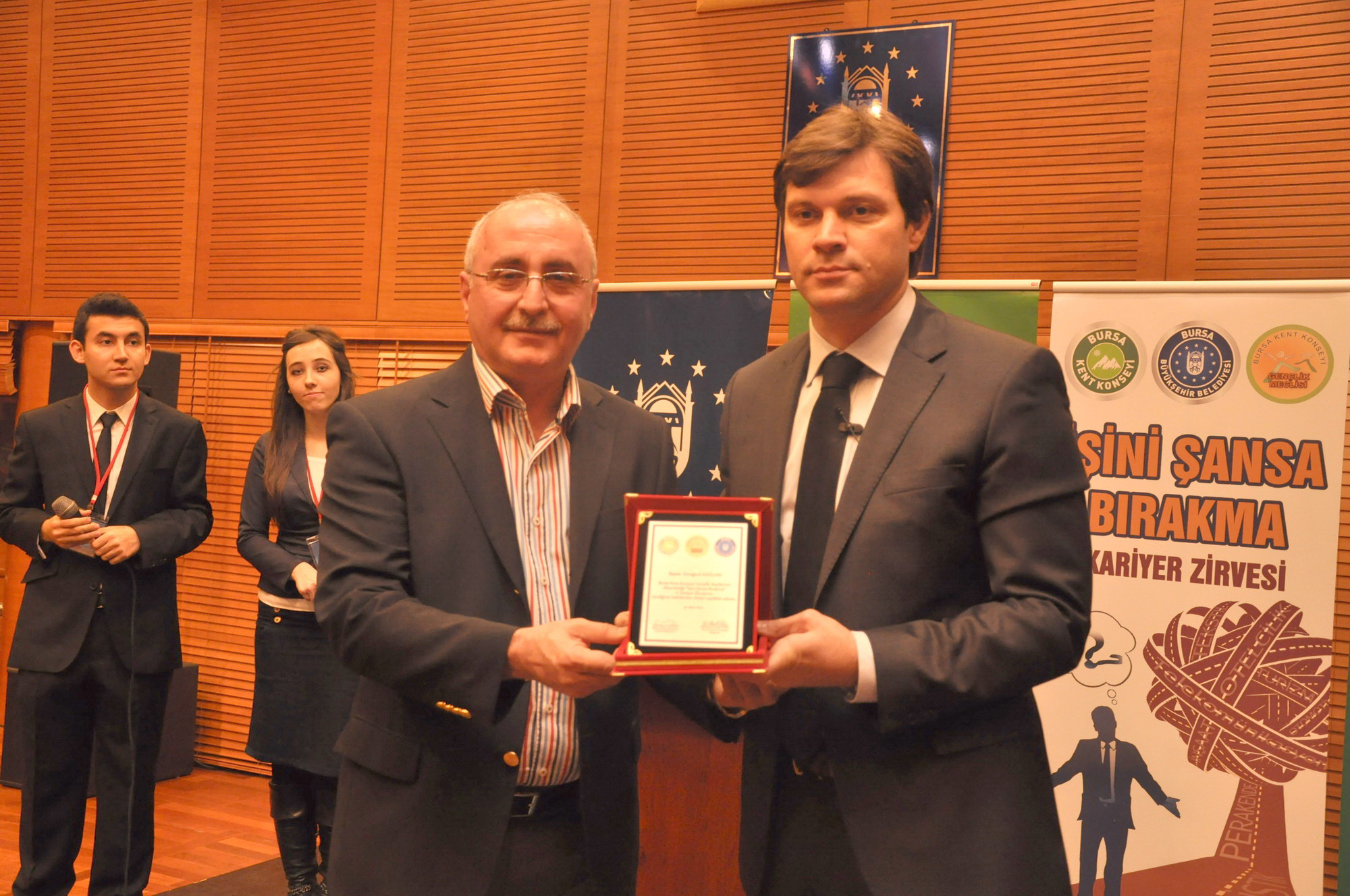 Seminerin ardından Bursa Kent Konseyi Başkanı Semih Pala tarafından Ertuğrul Sağlam’a günün anısına plaket takdim edildi.