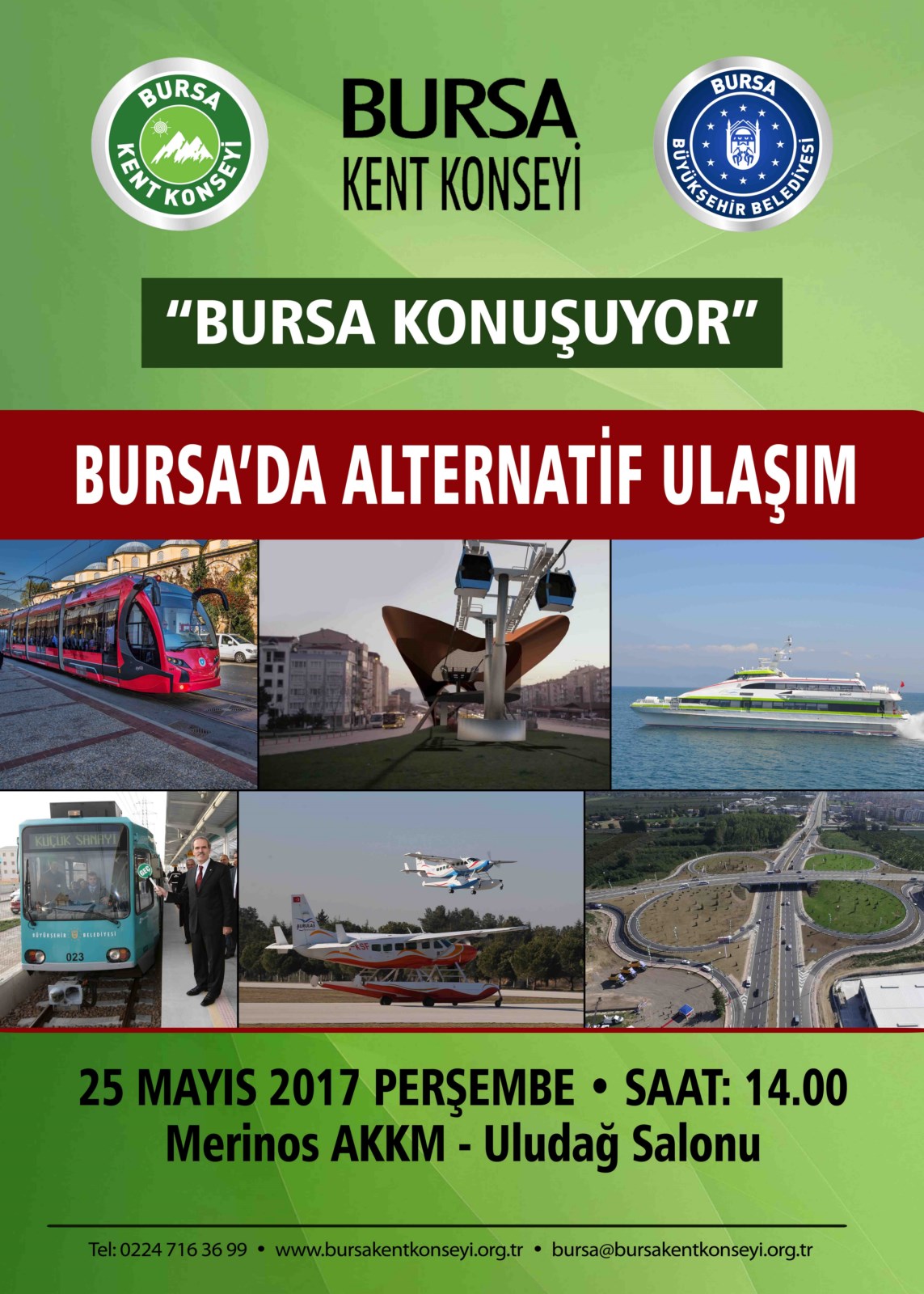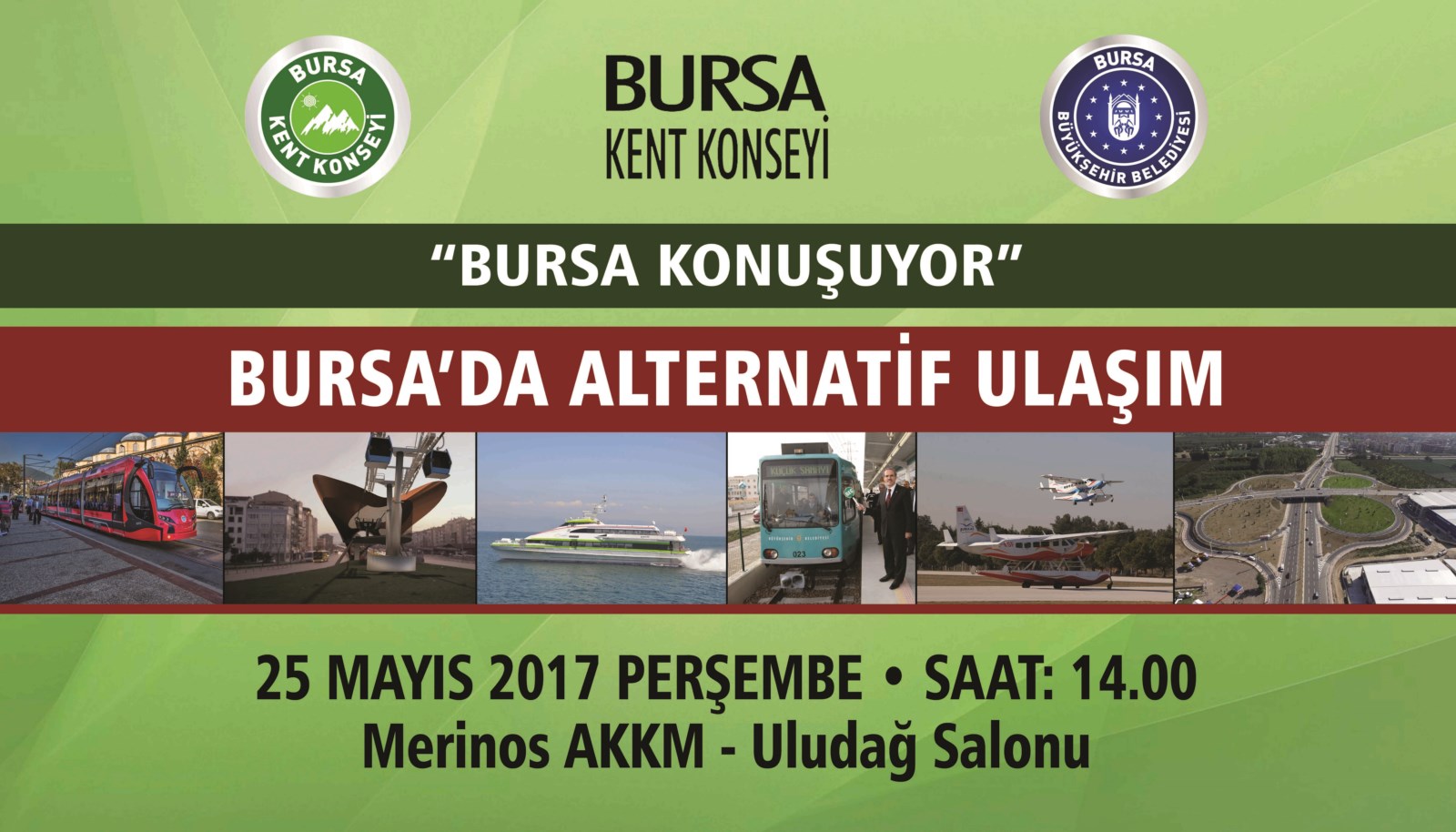Bursa Kent Konseyi’nin düzenlediği ‘Bursa Konuşuyor’ toplantısının bu kez gündemi ‘Bursa’da Alternatif Ulaşım’. 25 Mayıs Perşembe günü saat 14.00’da Atatürk Kongre Kültür Merkezi’ (Merinos AKKM) Uludağ Salonu’nda düzenlenecek olan toplantıda, konu masaya yatırılacak.