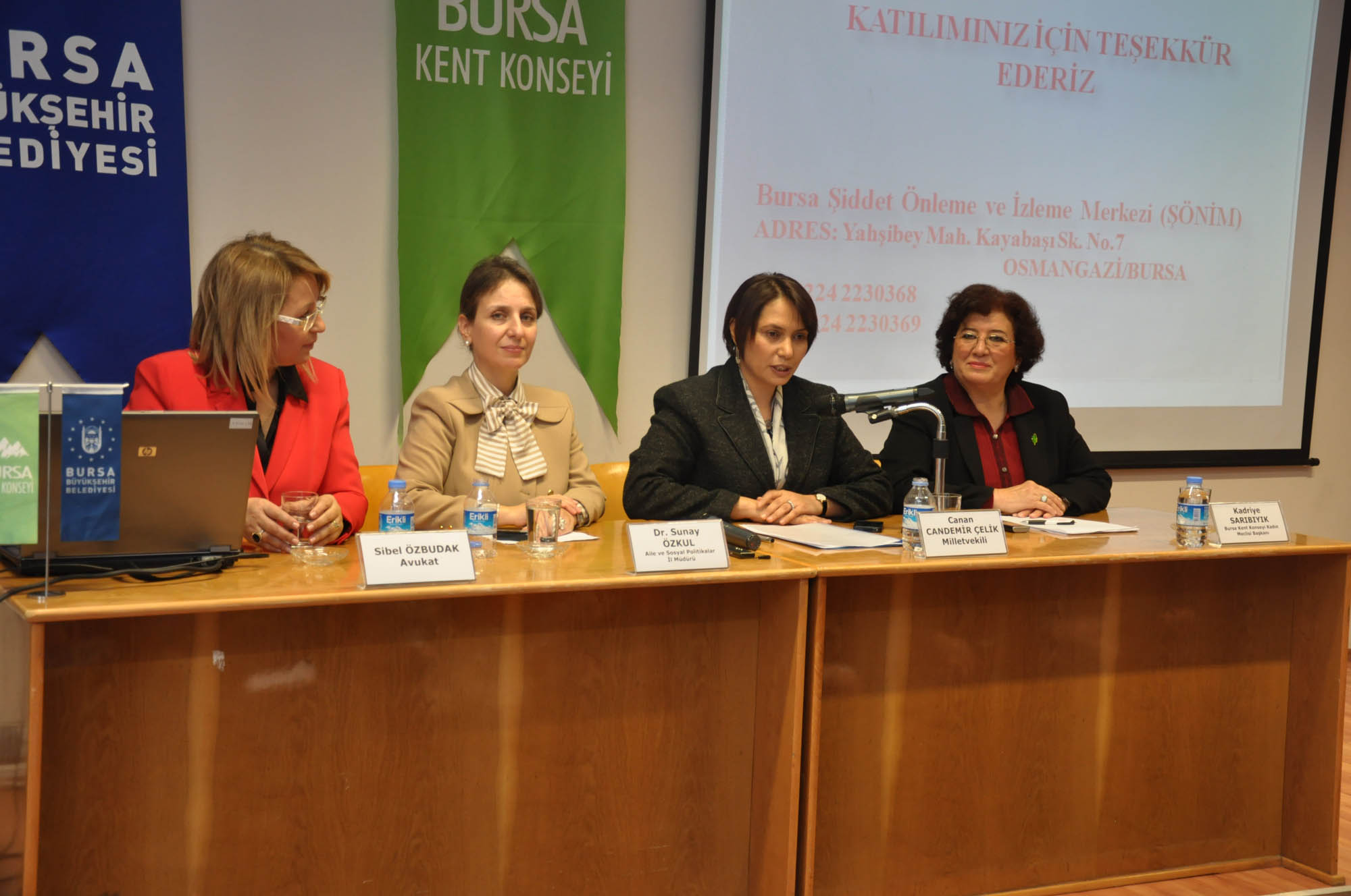 Bursa Aile ve Sosyal Politikalar İl Müdürü Dr. Sünay Özkul, Bursa Şiddet Önleme ve İzleme Merkezi (ŞÖNİM) hakkında kadınlara bilgi verdi. Kadınların arasında hala sıkıntılara duyarsız kalan bir kesimin olduğunu söyleyen Özkul, “Bursa’da şiddete uğrayan kadınların oranı ülke ortalamasının altında, fakat birçok kadın ilgili yerlere başvurmuyor. Kadının Statüsü Genel Müdürlüğü kurulmasıyla birlikte kadına yönelik şiddetin önüne geçilmesi amacıyla yasal önlemler alındı” dedi.