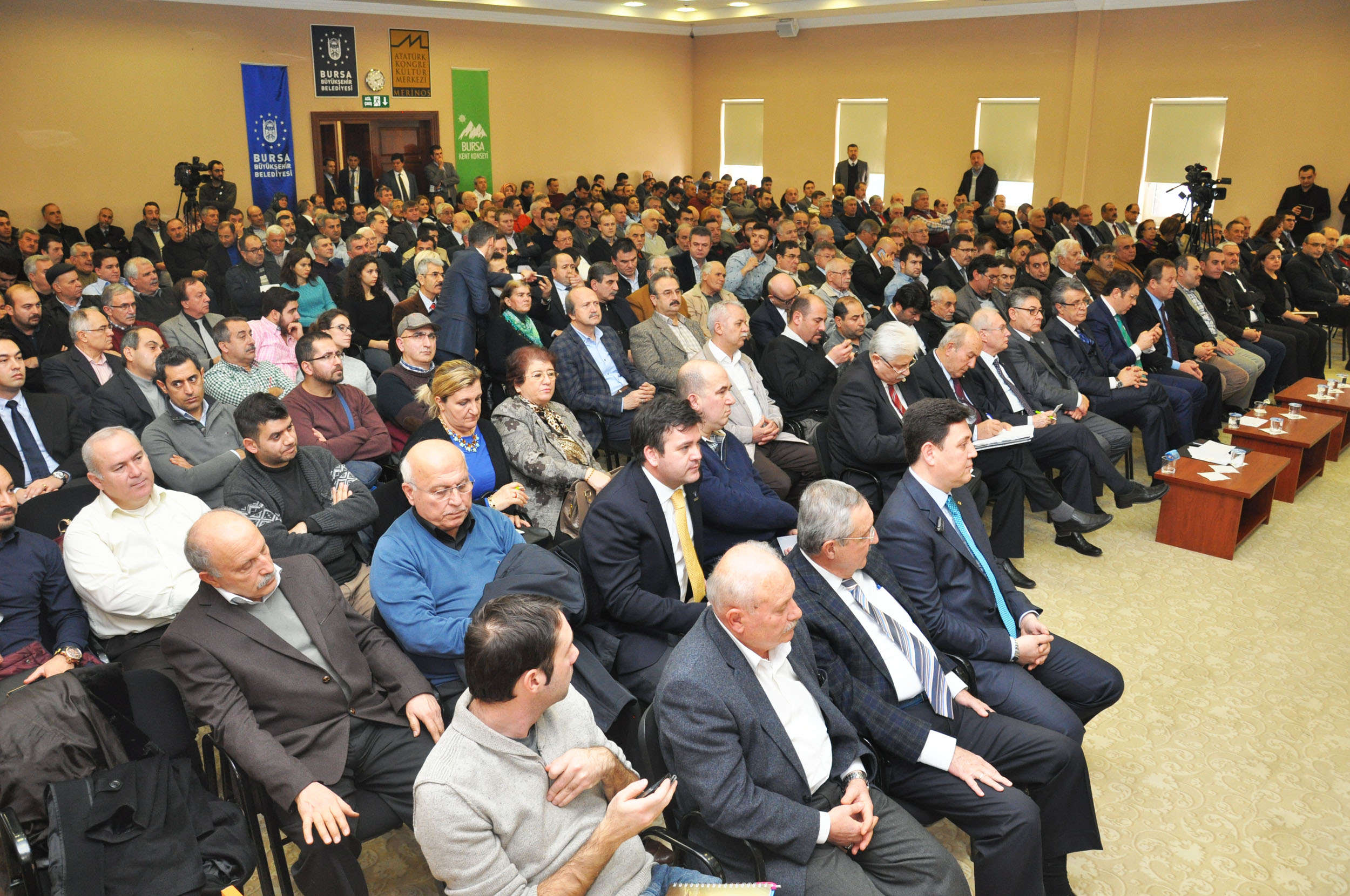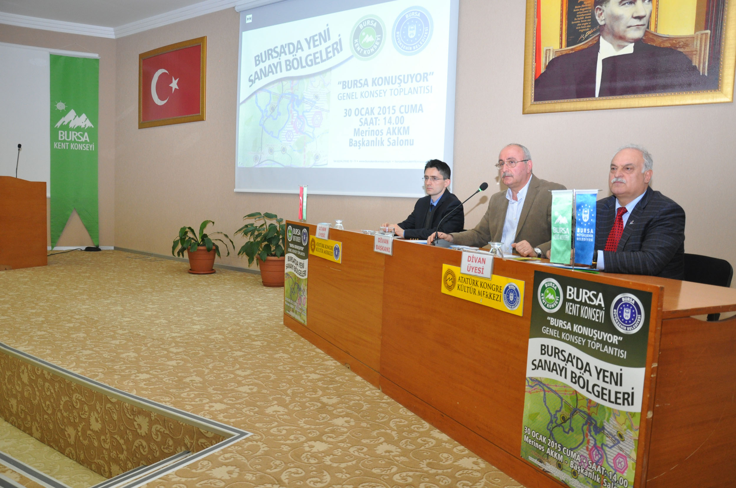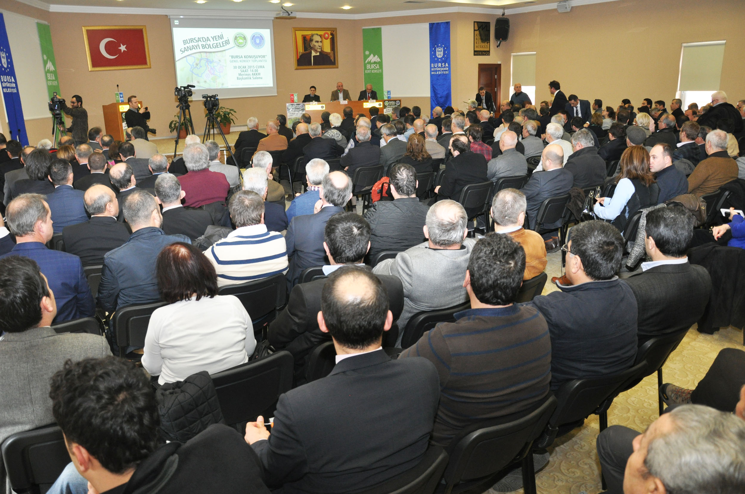 Atatürk Kongre Kültür Merkezi (Merinos AKKM) Başkanlık Salonu’nda düzenlenen ‘Bursa Konuşuyor-Bursa Yeni Sanayi Bölgeleri’ toplantısı, iş adamları, sanayiciler, meslek odalarının, ticaret ve sanayi odalarının, sivil toplum kuruluşlarının temsilcilerinin ve vatandaşların katılımıyla yapıldı. Toplantının Divan Başkanlığı’nı BKK Başkanı Semih Pala, Divan üyeliklerini ise BKK Genel Sekreter Yardımcısı Cüneyt Acar ve BKK Yürütme Kurulu üyesi Recep Yıldırım yaptı.