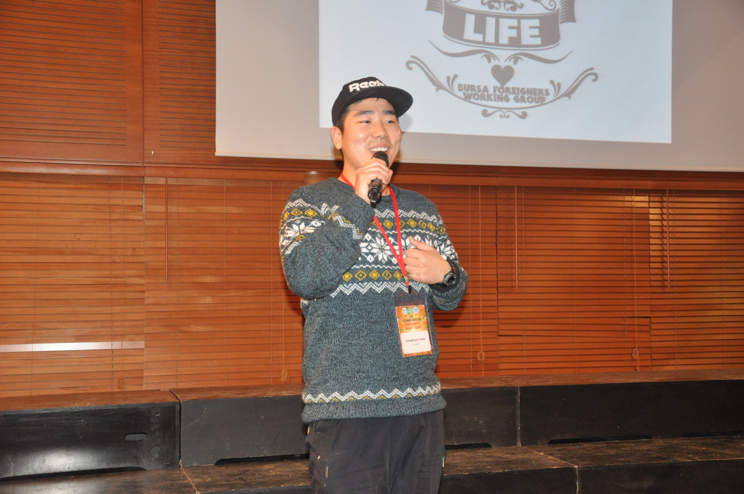 Koreli Jonghyun Kim ise, kendisini Bursa’ya davet eden BKK Yabancılar Çalışma Grubu’na teşekkür etti. Korece merhabanın nasıl denildiğini salondakilere öğreten Kim’in, “Korece merhaba ‘Anyang’ diye söylenir. Artık Koreli görünce ‘Konniçiva’ demeyin” demesi gülüşmelere neden oldu. Geçen sene Türkiye’ye geldiğini, 15 şehri gezdiğini söyleyen Kim, en çok Bursa’yı sevdiğini belirtti. Bursa’da yaşamak istediğini ifade eden Kim, bir Kore restoranı açmayı düşündüğünü dile getirdi. Kim, konuşmasını Türkçe ‘Kardeşim, Eyvallah’ diyerek bitirdi.