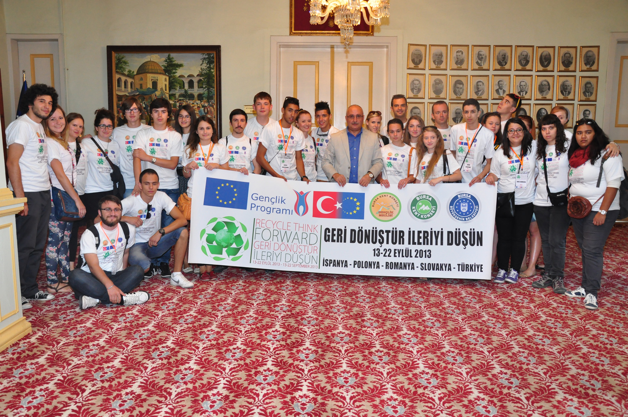 BKK Başkanı ve aynı zamanda Büyükşehir Belediye Başkanı Danışmanı olan Semih Pala, BKK Gençlik Meclisi’nin Avrupa Birliği Gençlik Programları Eylem 1.1 ‘Geriye Dönüştür, İleriyi Düşün’ (Recycle Think Forward) projesi kapsamında şehirde ağırladığı 30 yabancı genci, Tarihi Belediye Binası’nda konuk etti. Slovakya, Romanya, Polonya ve İspanya’dan gelen gençlere tarihi binanın odalarını ve Meclis Salonu’nu gezdiren Pala, binanın tarihi geçmişiyle ilgili bilgiler verdi.