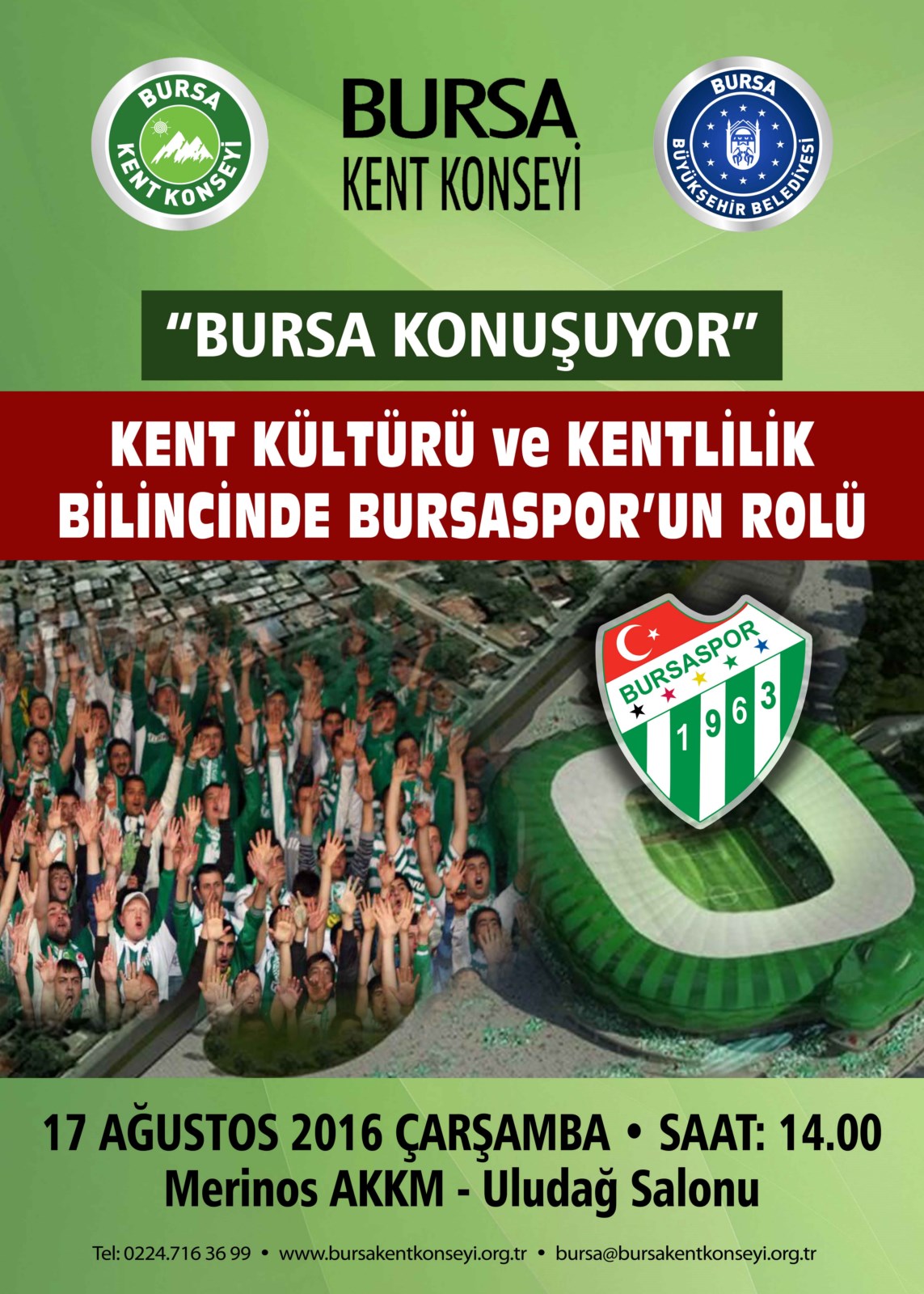 Bursa Kent Konseyi’nin düzenlediği ‘Bursa Konuşuyor’ toplantısının bu kez gündemi “Kent Kültürü ve Kentlilik Bilinci’nde Bursaspor’un Rolü”. 17 Ağustos Çarşamba günü saat 14.00’da Atatürk Kongre Kültür Merkezi’ (Merinos AKKM) Uludağ Salonu’nda düzenlenecek olan toplantının konuşmacıları Bursa Büyükşehir Belediyesi Başkanı Recep Altepe, Bursaspor Kulübü Başkanı Ali Ay ve Teknik Direktörü Hamza Hamzaoğlu ile Kastamonu Üniversitesi’nden Yard. Doç. Dr. Ersoy Soydan olacak. Toplantının moderatörlüğünü ise Bursa Kent Konseyi Başkanı Hasan Çepni üstlenecek.
