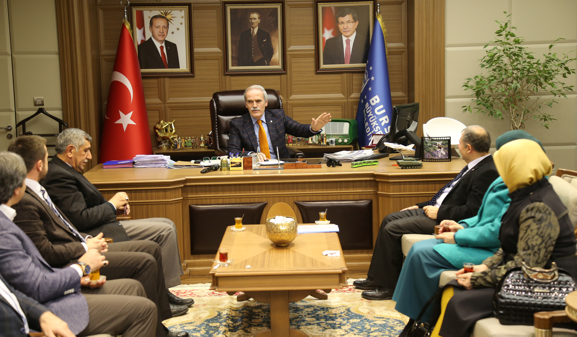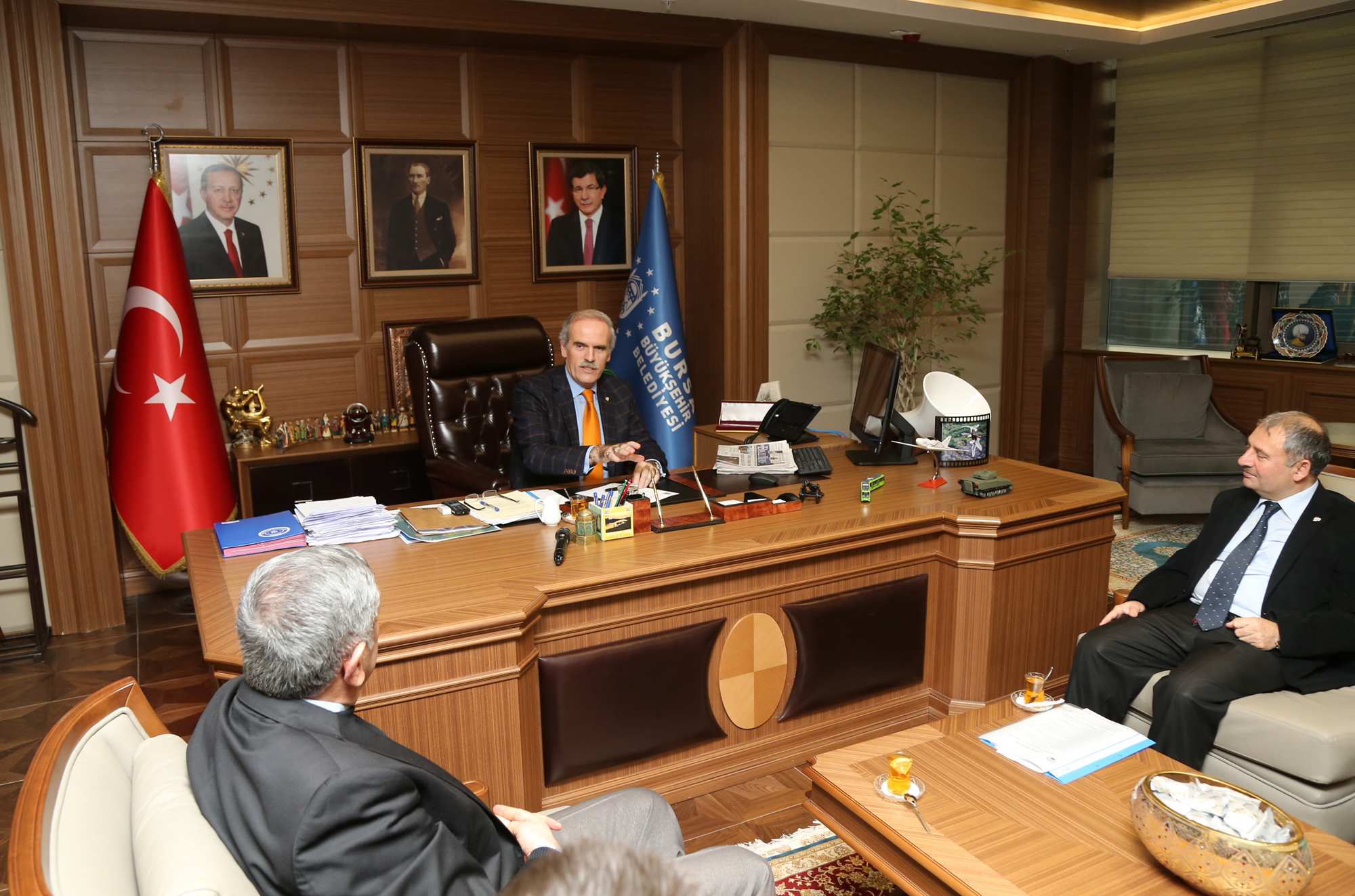 Büyükşehir Belediyesi’nin Ankara Yolu Zafer Mahallesi mevkiine yapılan yeni belediye binası ziyaretçilerini ağırlamaya devam ediyor. ‘Hayırlı olsun’ kapsamında gerçekleşen ziyaretlerin sonuncusunda, Büyükşehir Belediye Başkanı Recep Altepe, Kestel Belediye Başkanı Yener Acar ve AK Parti İlçe Başkanı Necmettin Ekinci ile çalışma arkadaşlarıyla bir araya geldi. Sıcak bir atmosferde gerçekleşen görüşmede gündemi, Bütünşehir uygulaması ve ilçelere yapılan yatırımlar oluşturdu.