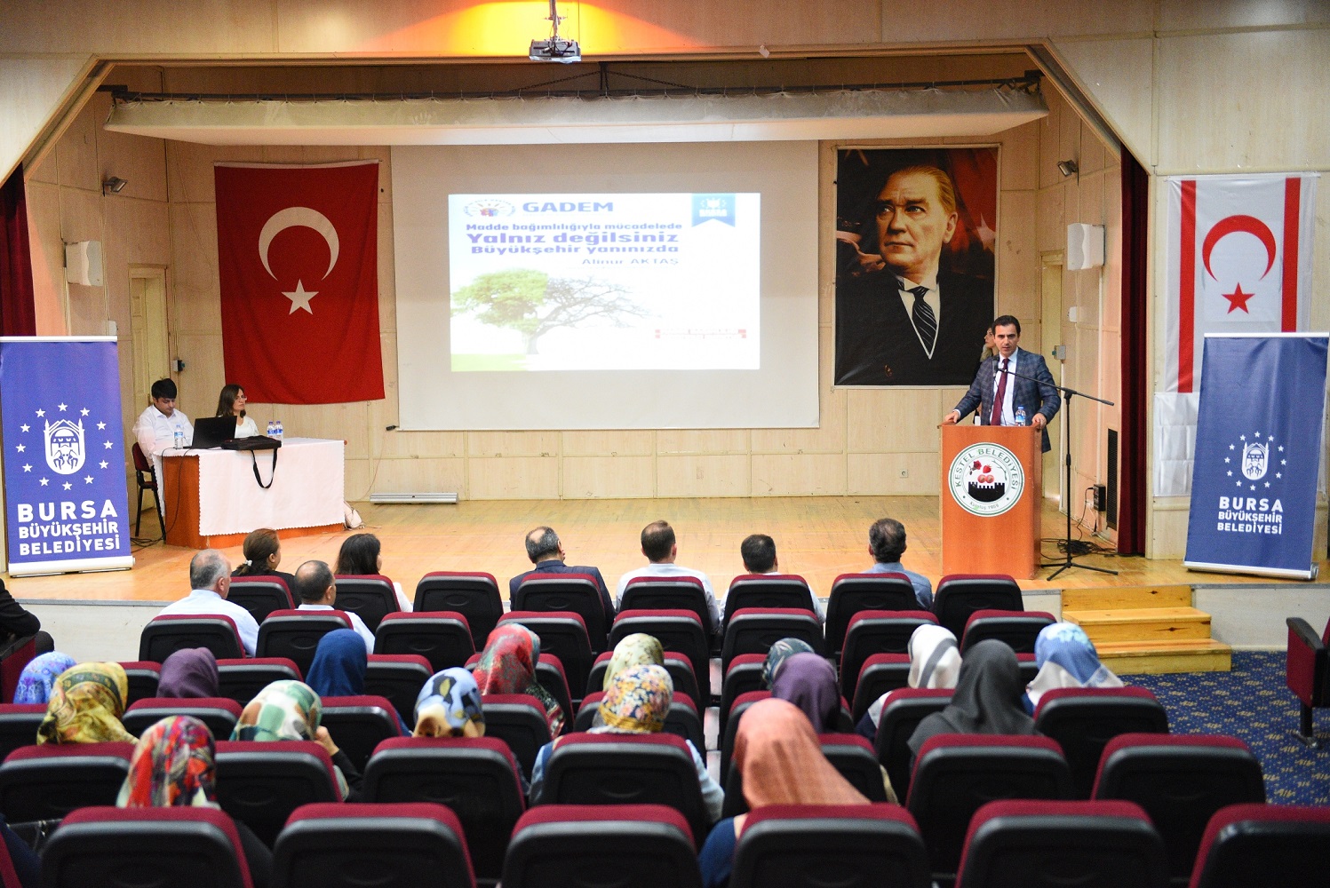 ‘Madde Bağımlılığıyla Mücadelede Yalnız Değilsiniz. Büyükşehir Yanınızda’ sloganıyla Kestel Kültür Merkezi’nde ilçe halkına yönelik olarak gerçekleşen toplantıya, Büyükşehir Belediyesi Sağlık İşleri Dairesi Başkanı Mehmet Fidan, Kestel Kaymakamı Ahmet Karakaya ve İlçe Müftüsü Arif Yeşiloğlu da katıldı. Programda önce protokol konuşmaları yapıldı. Ardından; GADEM Uzmanı Hülya Özkan Timur tarafından katılımcılara, alkol ve madde bağımlılığıyla mücadeleye yönelik bilgiler aktarıldı.