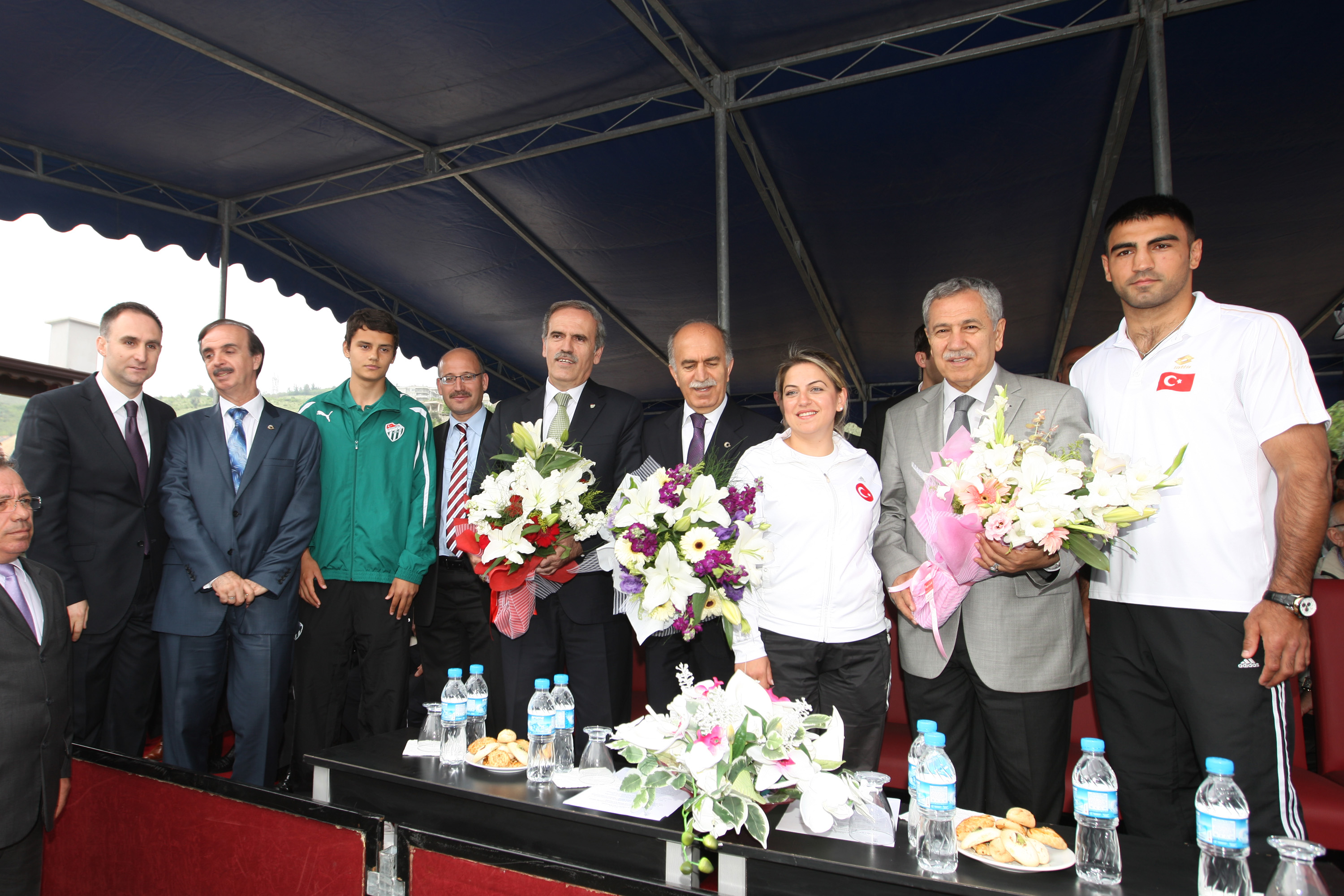 Konuşmaların ardından Başbakan Yardımcısı Bülent Arınç, Londra Olimpiyatlarında Türkiye’yi temsil edecek olan Büyükşehir Belediyesporlu boksçu Bahram Muzaffer, Atıcı Nihan Kantarcı ve Avrupa Şampiyonu olan Bursaspor U15 takımının oyuncularına altın ve eşofman takımı hediye etti.