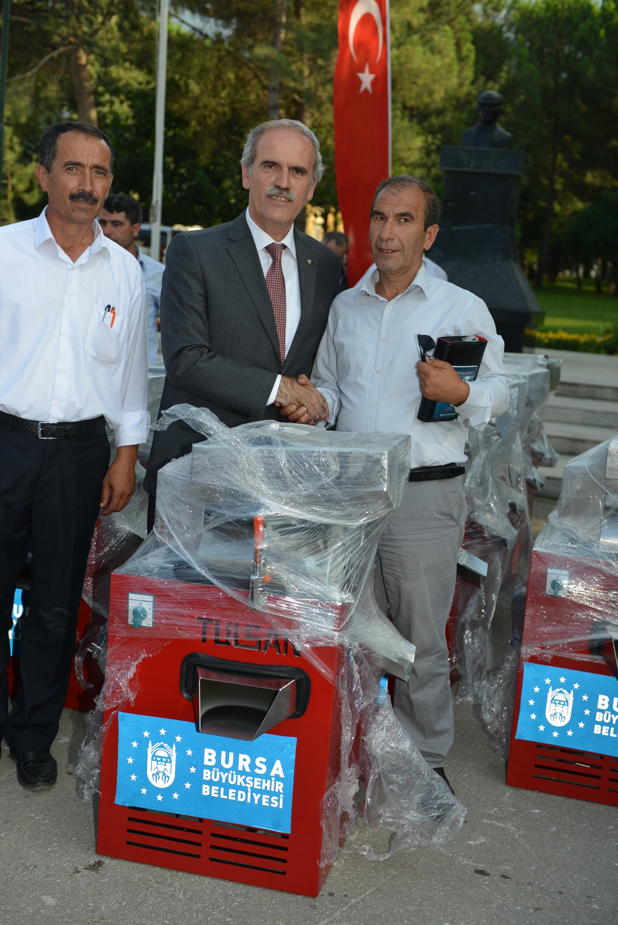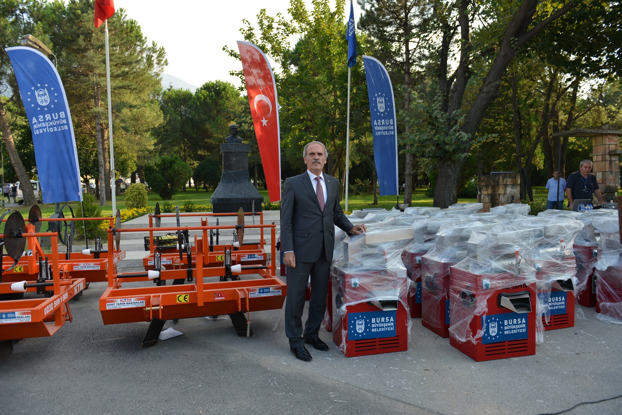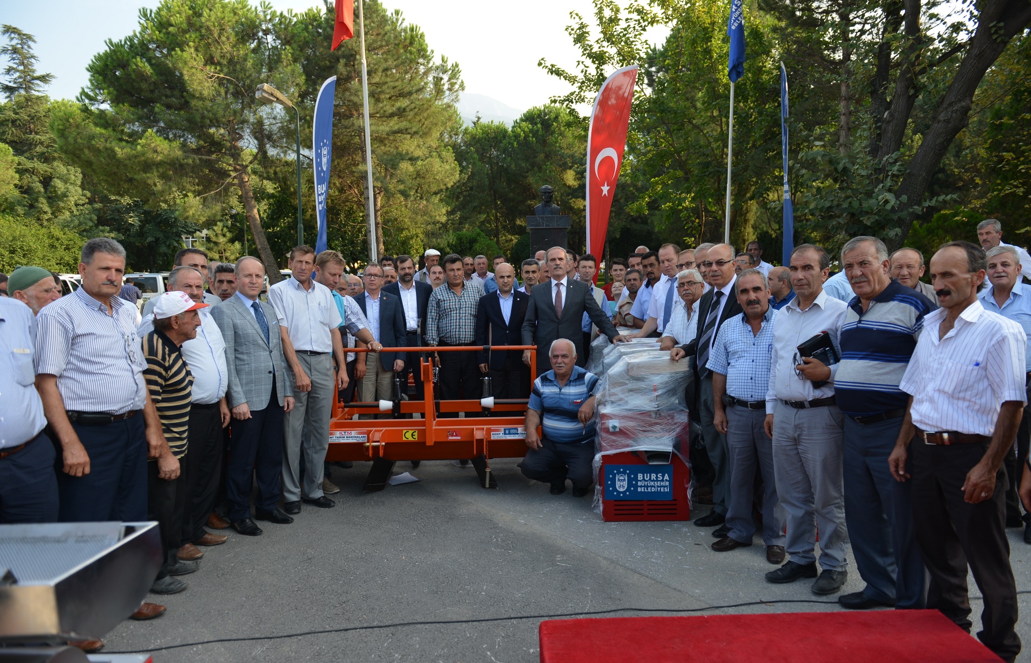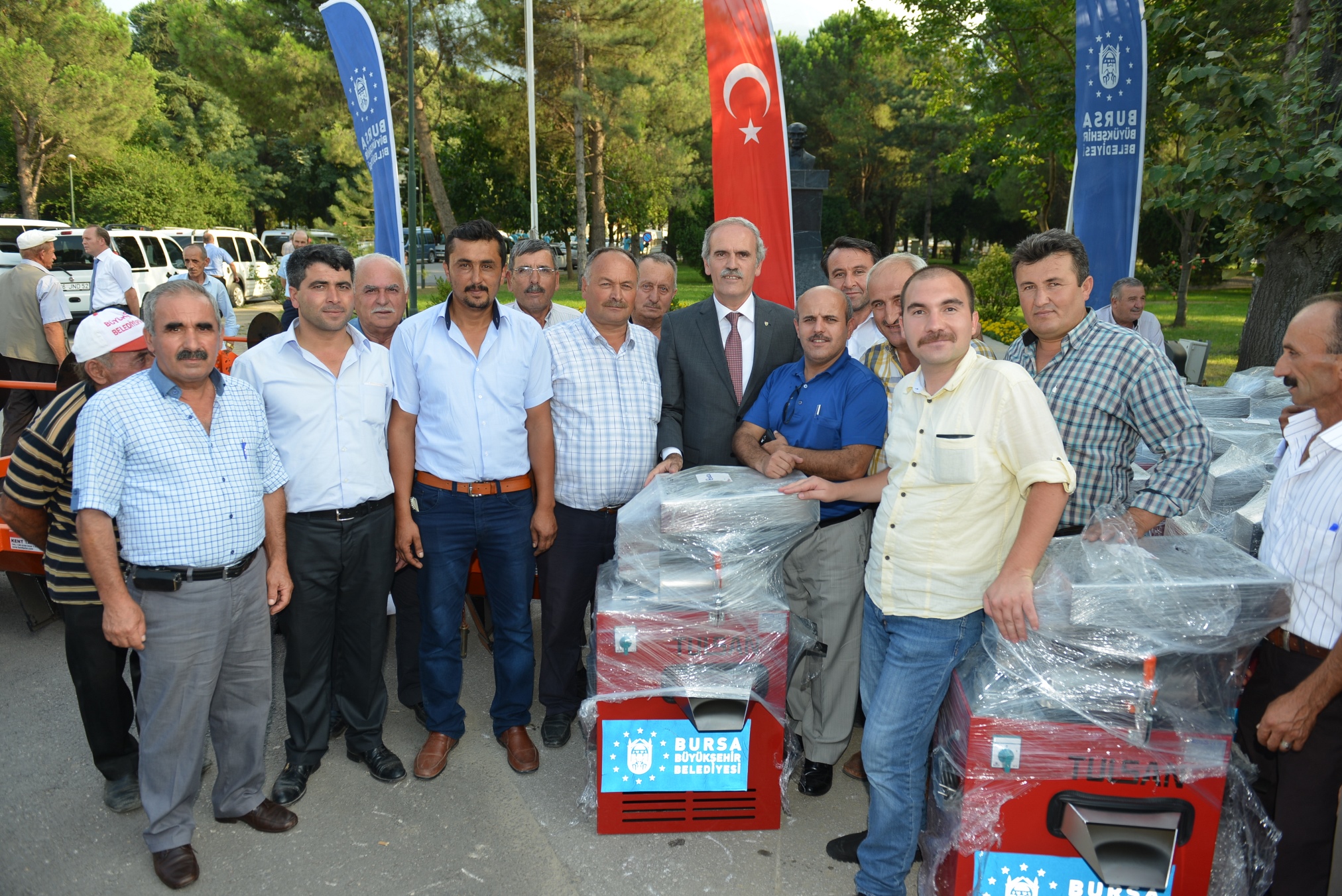 Osmangazi, Orhaneli, Harmancık, Büyükorhan ve Keles ilçeleri için çilek üretimindeki verimin artırılması için satın alınan 5 adet malt serme makinası, Büyükşehir Belediyesi’ne ait Arabayatağı yerleşkesinde düzenlenen törenle yetkililere teslim edildi. 46 çiftçiye salça makinasının da verildiği tören, şölen havasında gerçekleşti.