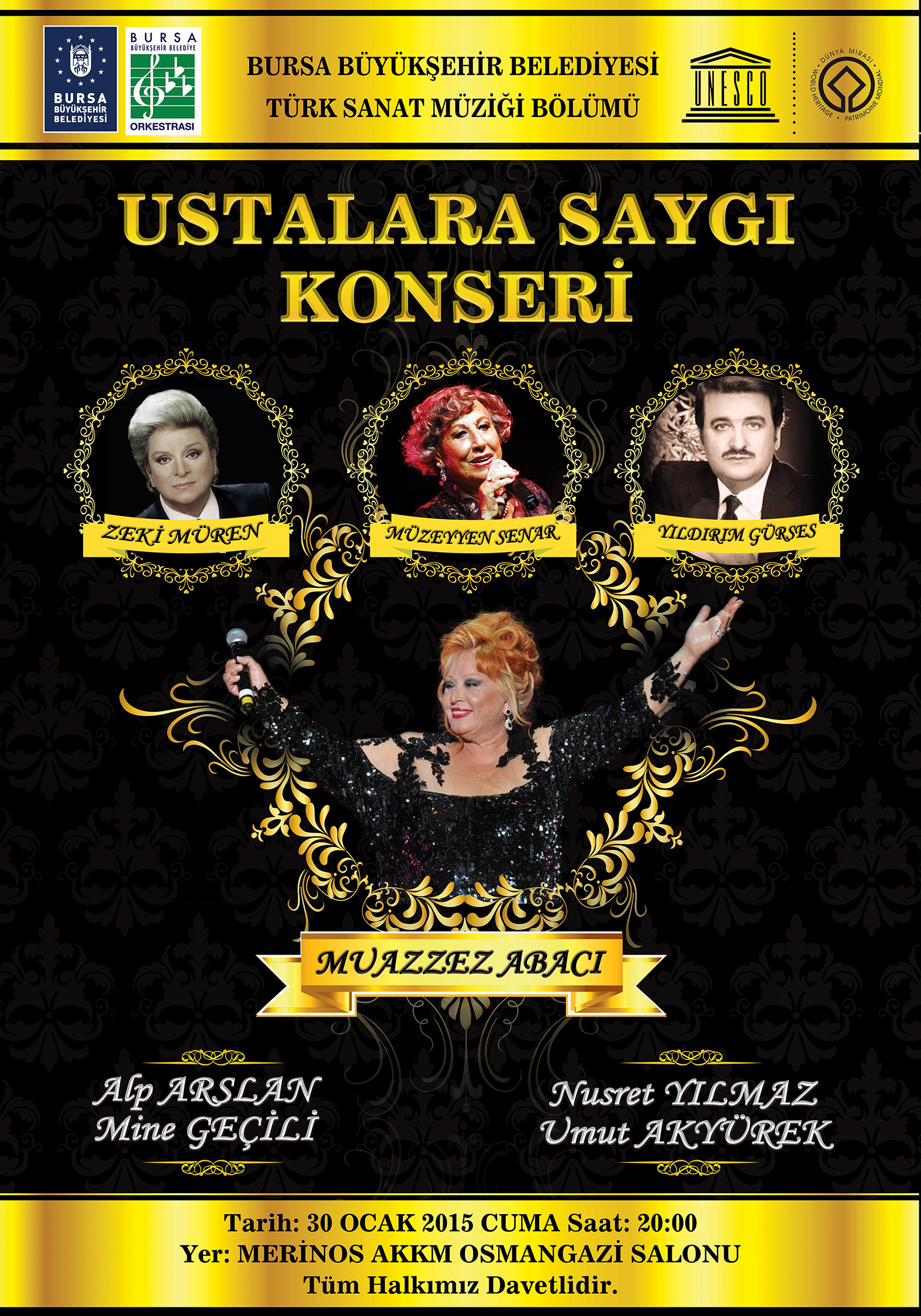 Bursa Büyükşehir Belediyesi Orkestrası Türk Sanat Müziği Bölümü’nün Ocak ayı konserinde ise ünlü sanatçı Muazzez Abacı konuk olacak. ‘Ustalara Saygı’ başlığı altında gerçekleştirilecek olan konserde ilk bölümde ise ünlü sanatçılar Umut Akyürek, Alp Arslan, Mine Geçili ve Nusret Yılmaz ustaların şarkılarını seslendirecek. Konser, 30 Ocak Cuma günü saat 20.00’da Atatürk Kongre Kültür Merkezi (Merinos AKKM) Osmangazi Salonu’nda gerçekleştirilecek.