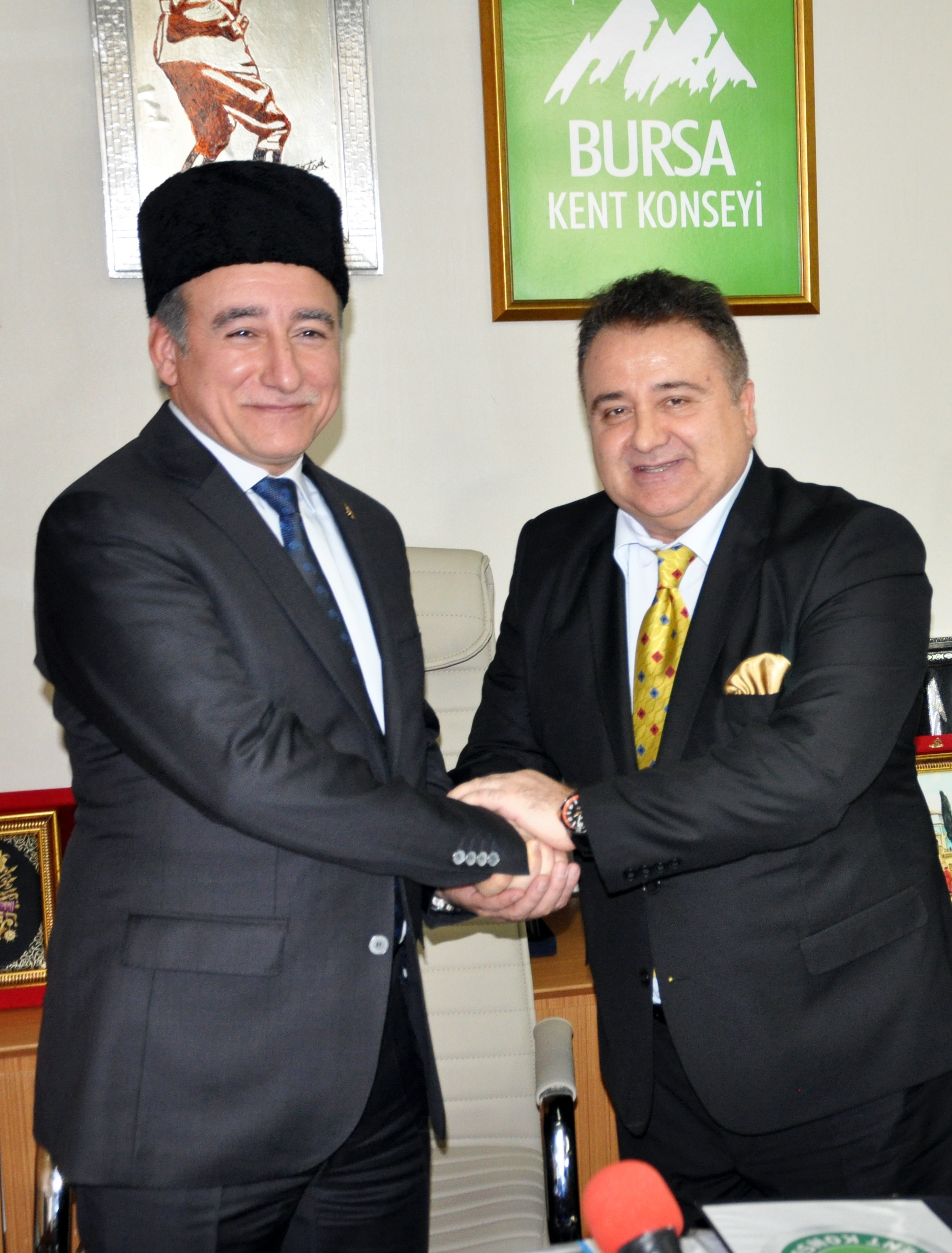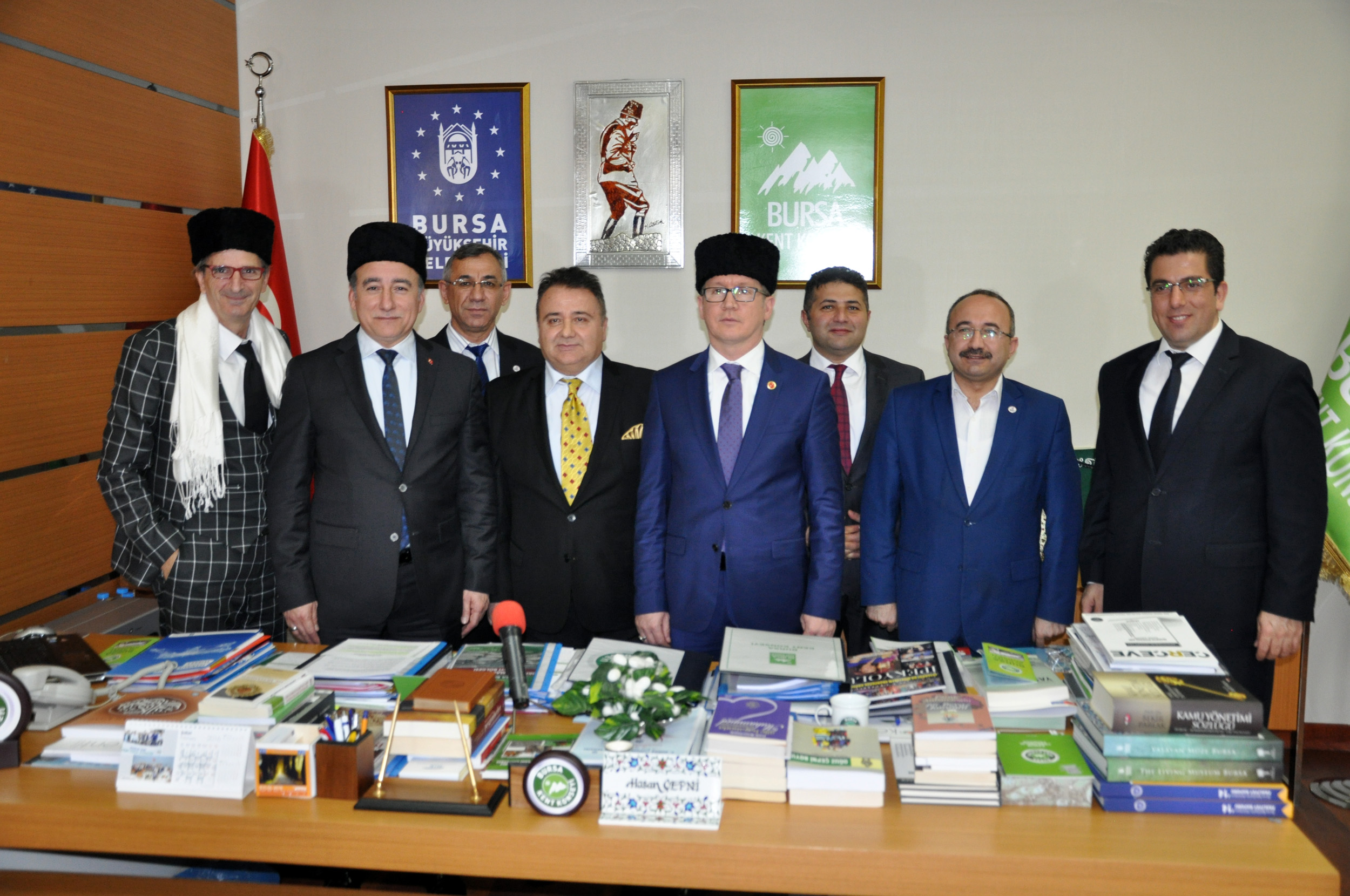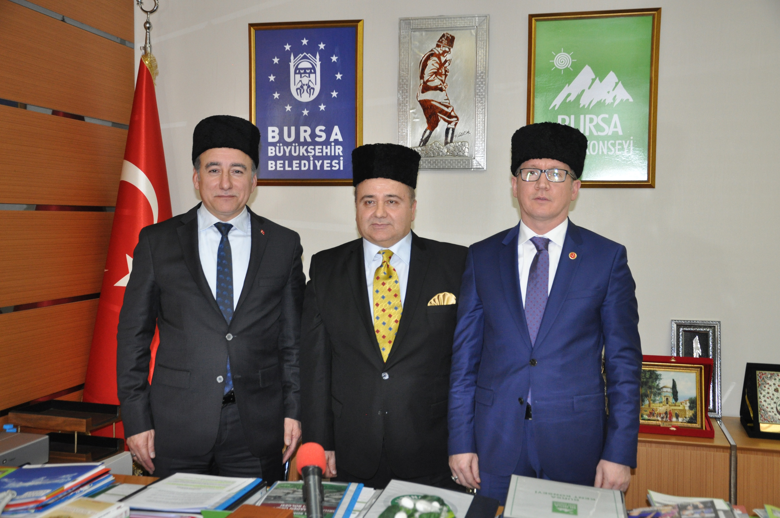 BURSA – Dünya Karapapak Türkleri Birliği Genel Başkanı Seyfullah Türksoy ve yönetim kurulu üyeleri, Bursa Kent Konseyi Başkanı Hasan Çepni ile bir araya geldi.