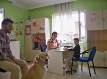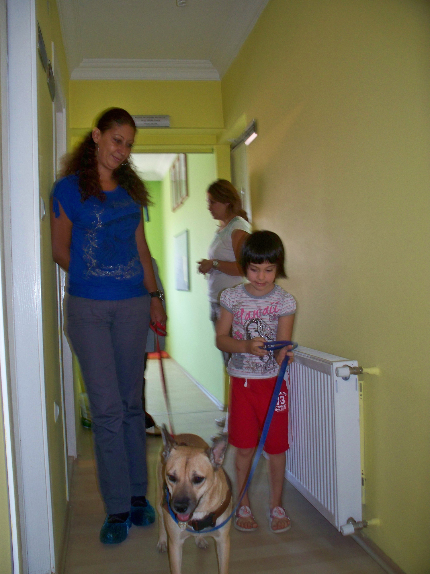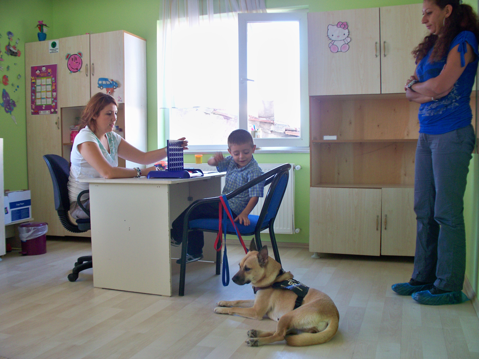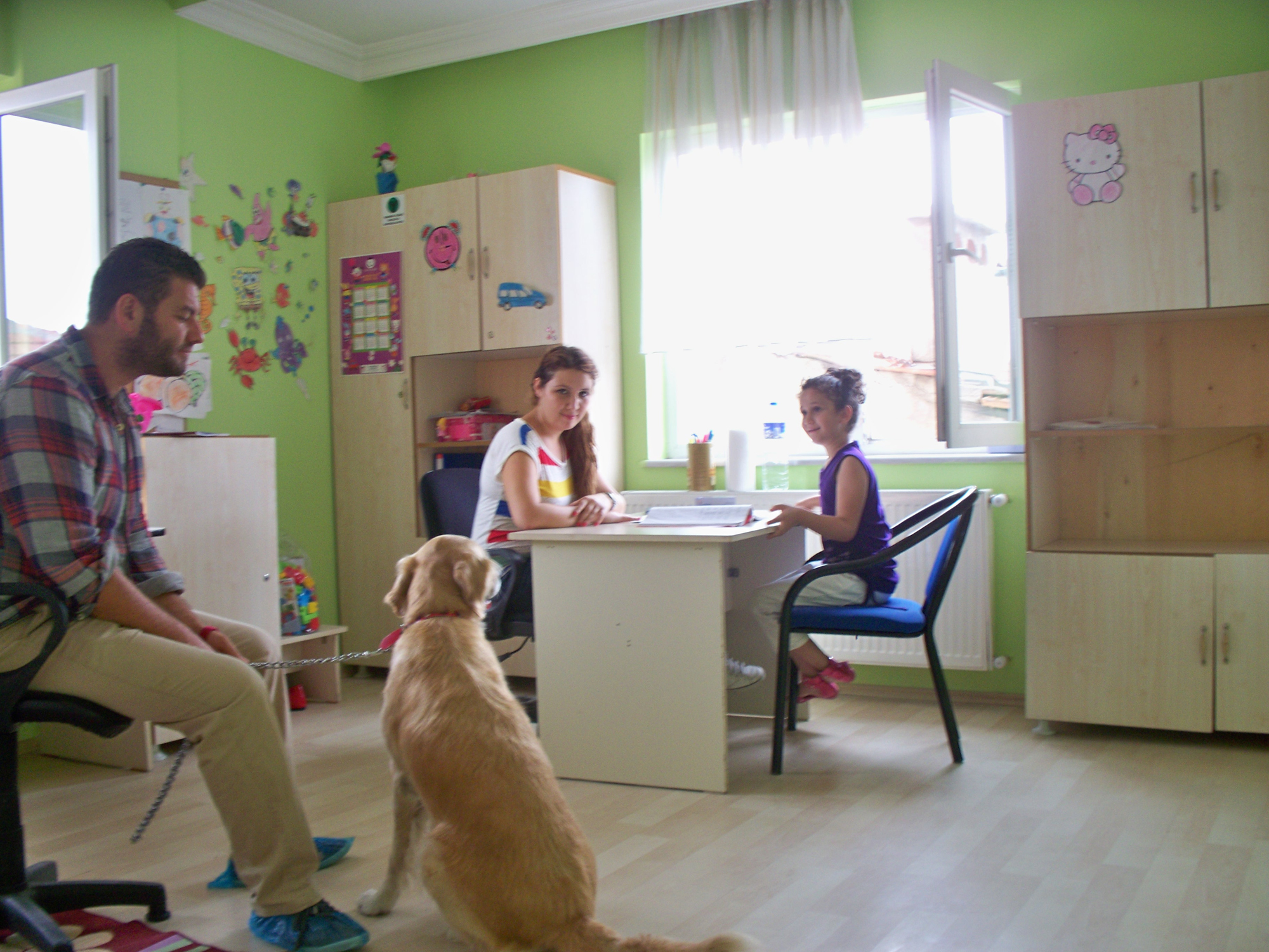 Büyükşehir Belediyesi Sosyal Hizmetler Dairesi Başkanlığına bağlı Engelliler Şube Müdürlüğü çalışanları ile Uludağ Üniversitesi Veteriner Fakültesi öğretim üyesi Doç. Dr. Türel Özkul ve engellilere yönelik hizmet veren sivil toplum kuruluşları yapılan toplantılar sonucunda eğitimlere Yeni Gün Özel Eğitim ve Rehabilitasyon Merkezi’nde başlandı. Finansmanı Büyükşehir Belediyesi Sosyal Hizmetler Dairesi Başkanlığına bağlı Engelliler Şube Müdürlüğü tarafından karşılanan projenin yürütücülüğünü ise Uludağ Üniversitesi Veteriner Fakültesi Öğretim Üyesi Doç. Dr. Türel Özkul üstlendi. Büyükşehir Belediyesi Engelliler Şube Müdürlüğü’nde görevli Evrim İnsel’in de yardımcı araştırıcı olarak görev aldığı proje kapsamında üç ay boyunca her Çarşamba Jale Üntürk ve köpeği Çıtır ve her Perşembe Murat Demir ve köpeği Coffee dil ve konuşma güçlüğü olan çocukları, Dil ve Konuşma Terapisti Esra Emine Özkan gözetiminde bir kişilik özel sınıflarda ziyaret ediyor.