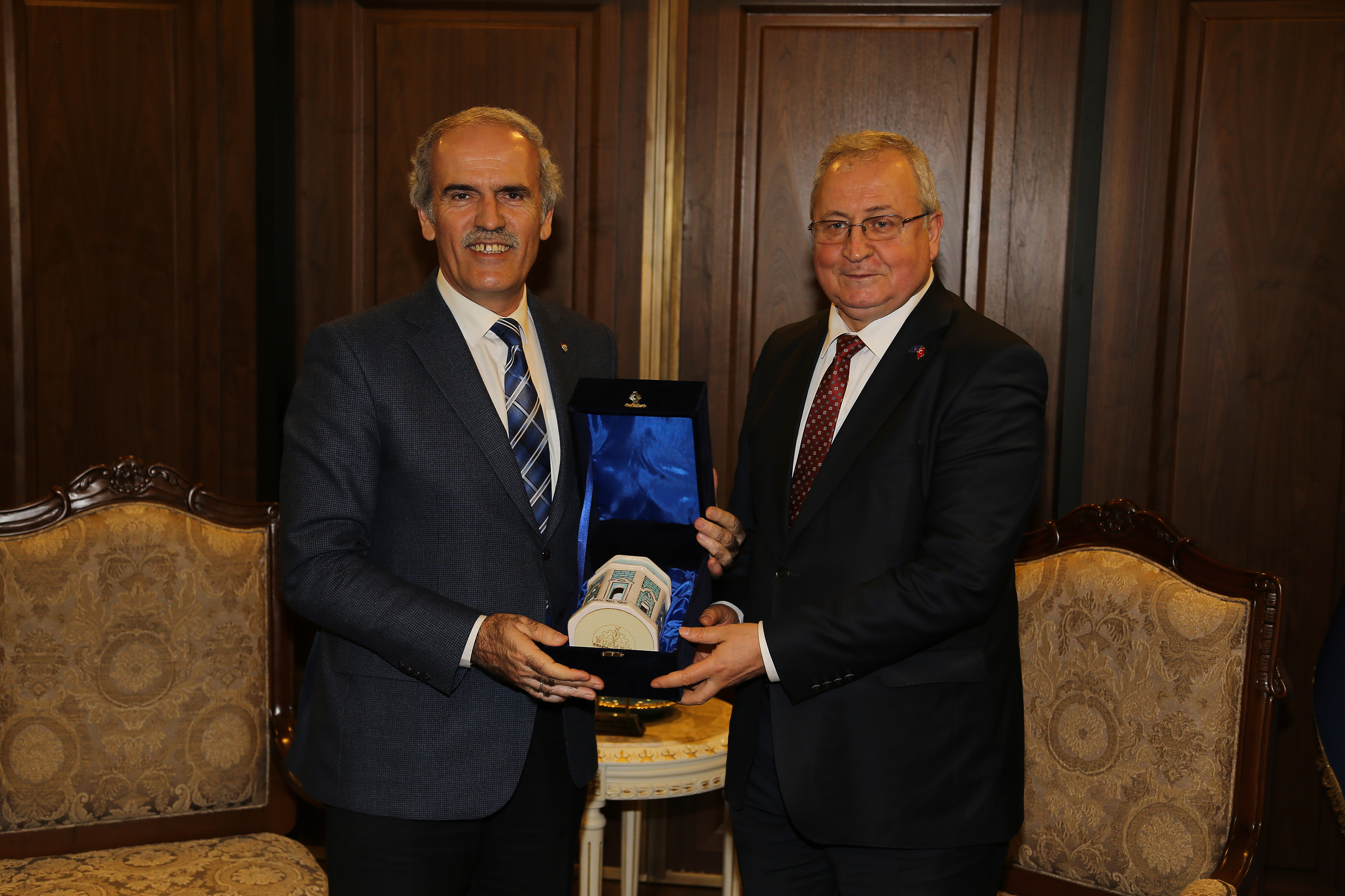 Başkan Altepe, ziyaretin anısına konuğuna çiniden el yapımı Yeşil Türbe maketi hediye etti.
