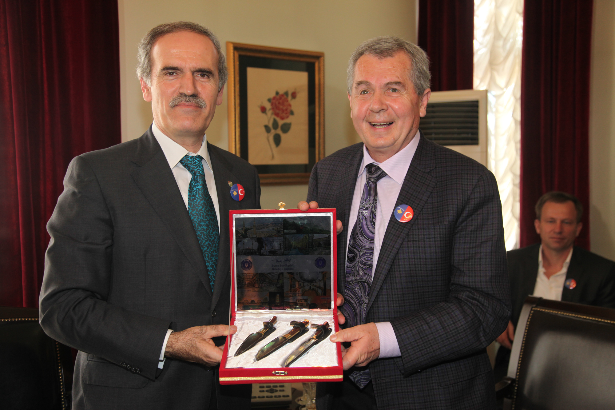 Başkan Altepe, ziyaretin sonunda günün anısına Mitroviça Belediye Başkanı Avni Kastrati’ye el yapımı çakı seti ve Bursa kitabı hediye etti.