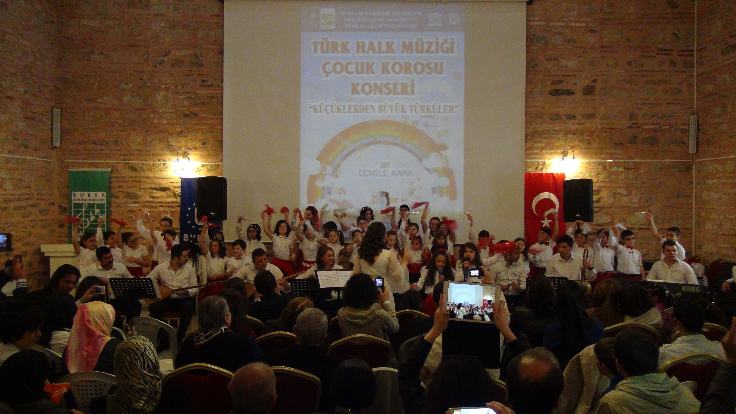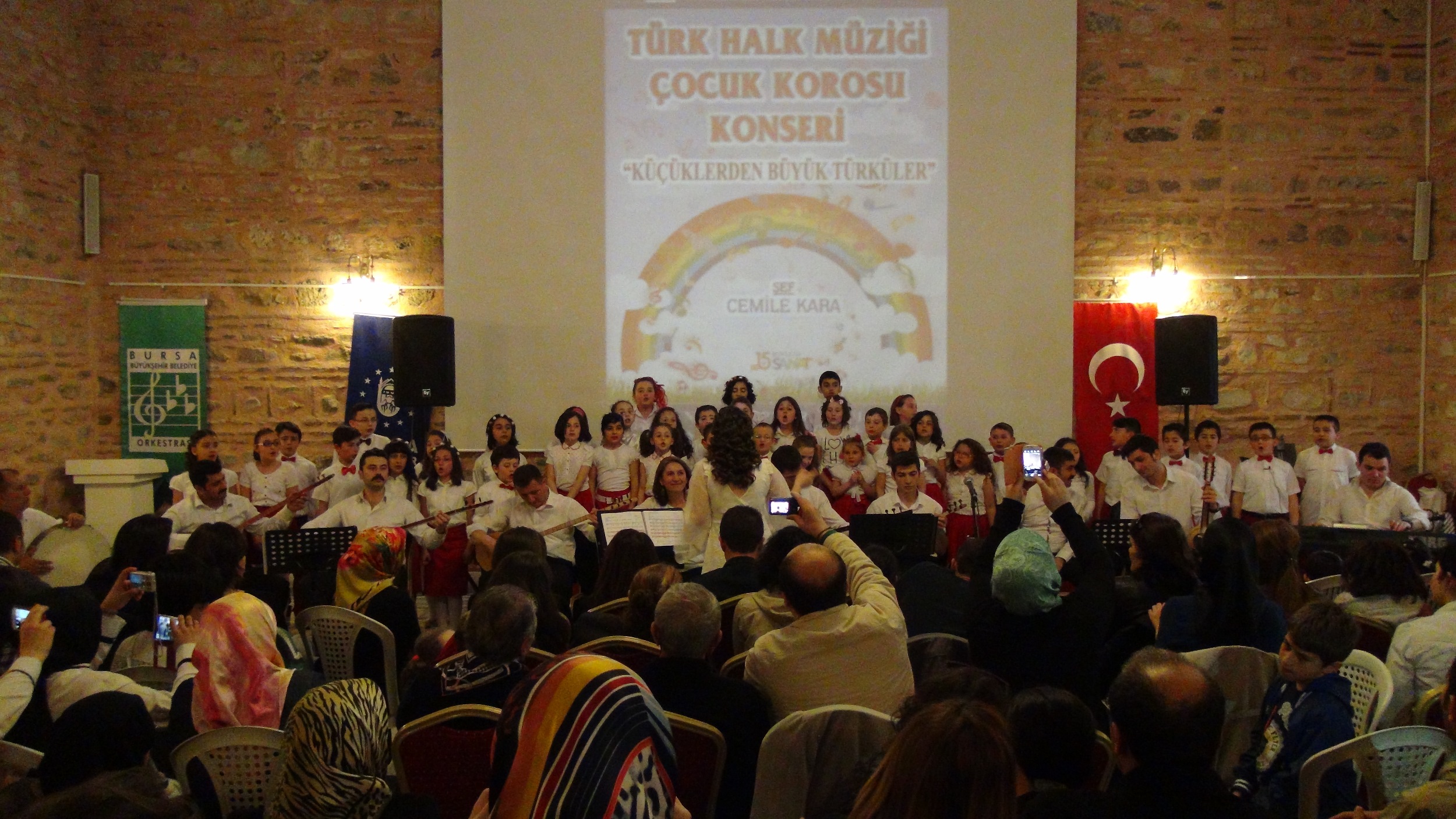 Büyükşehir Belediyesi Orkestrası Türk Halk Müziği Çocuk Korosu Konseri, ‘Küçüklerden Büyük Türküler’ temasıyla Mahkeme Hamamı İbrahimpaşa Kültür Merkezi’nde gerçekleştirildi. ‘23 Nisan Ulusal Egemenlik ve Çocuk Bayramı’ nedeniyle düzenlenen konsere küçük sanatçıların aileleri ve çok sayıda vatandaş katıldı. Yaklaşık elli öğrencinin sahneye çıktığı koro birbirinden güzel türküleri seslendirerek renkli görüntüler oluşturdu. Saz ekibinde birbirinden değerli hocaların ve enstrüman sınıfı öğrencilerinin de sahneye çıktığı programı şef Cemile Kara yönetti. Minik sanatçılar, yetenekleriyle büyüklere adeta taş çıkardı. Coşkulu konserde aileleri de çocuklarının sevincine ve coşkusuna ortak olarak, konserin her güzelliğini kaydetmek için birbirleriyle yarıştı. Programın sonunda Büyükşehir Belediyesi Orkestrası Türk Halk Müziği Bölümü Başkanı Züleyha Savaş, şef Kara ve çocukları keyifli konserden dolayı tebrik ederek çiçek verdi.