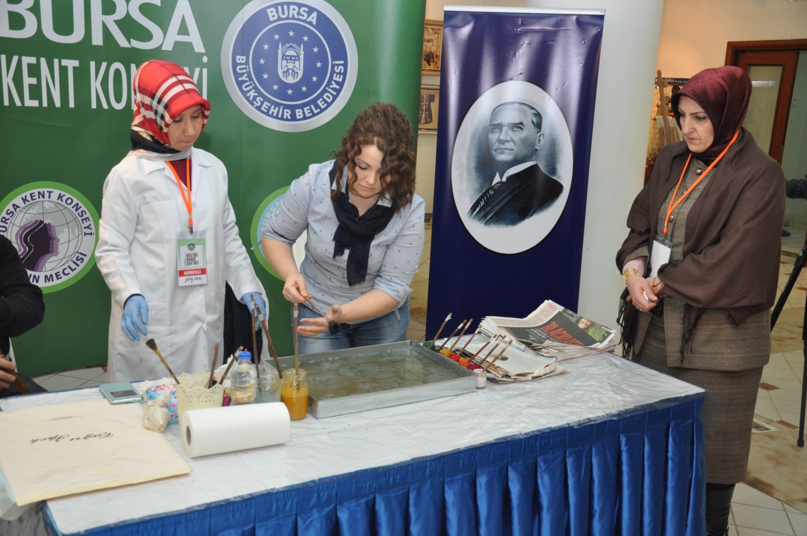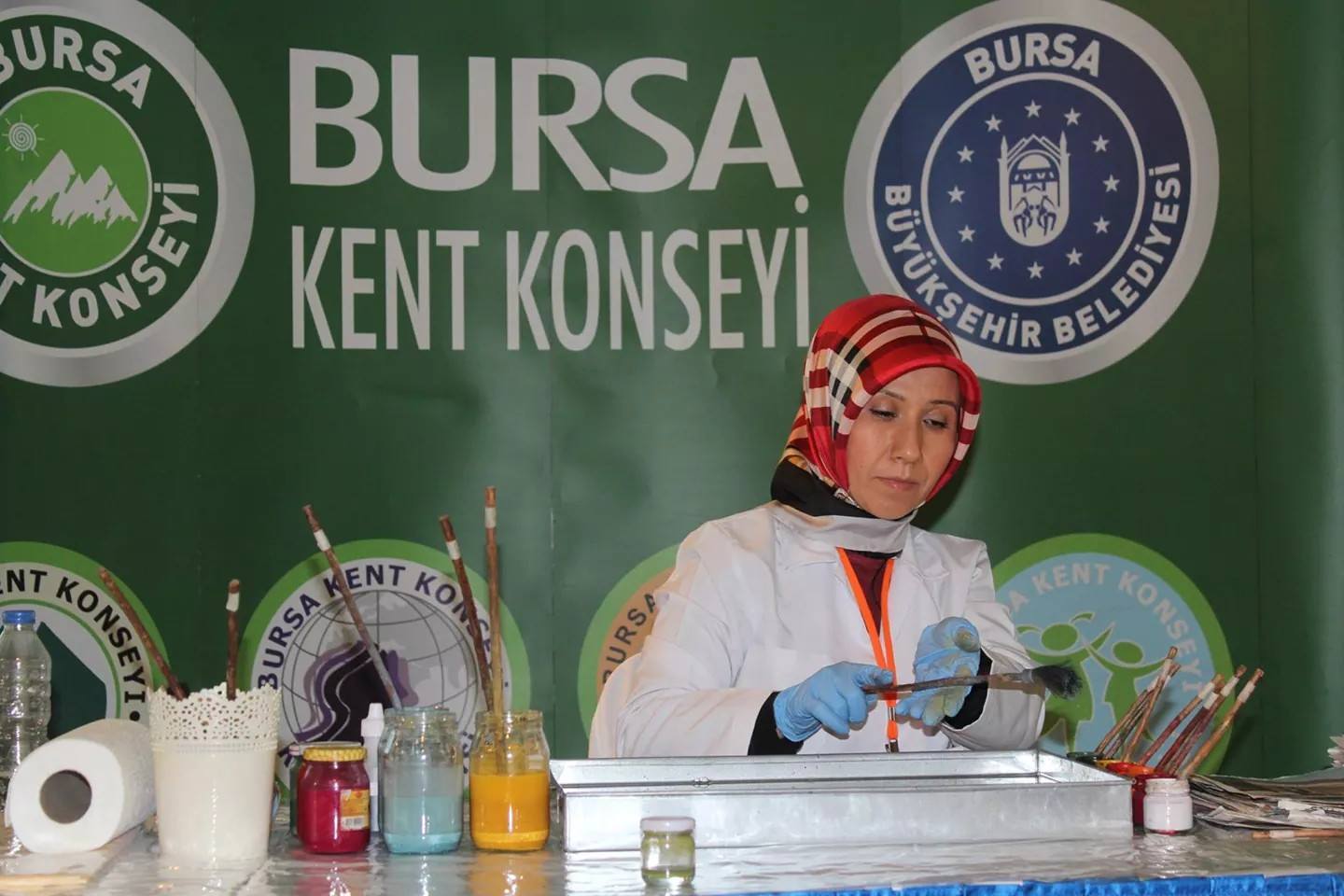 BURSA - Bursa Kent Konseyi (BKK) tarafından düzenlenen ‘Kültür Sanat Haftası’ kapsamında ebru sanatı uygulamalı olarak anlatılırken, ‘Sanat ve Uygarlık’ üzerine hasbihal edildi.
