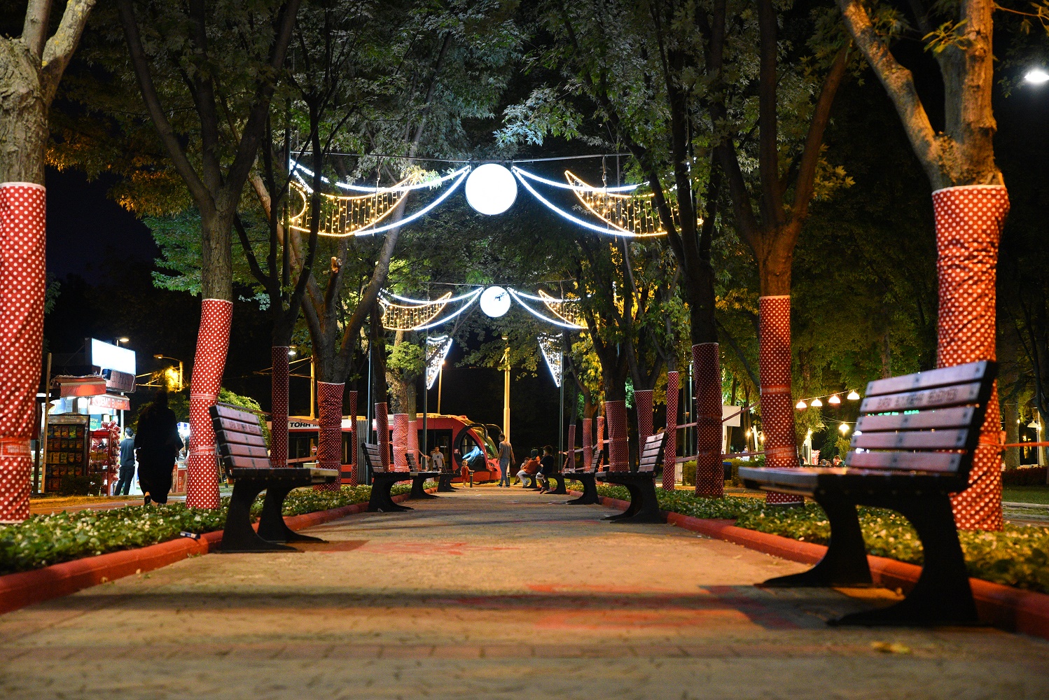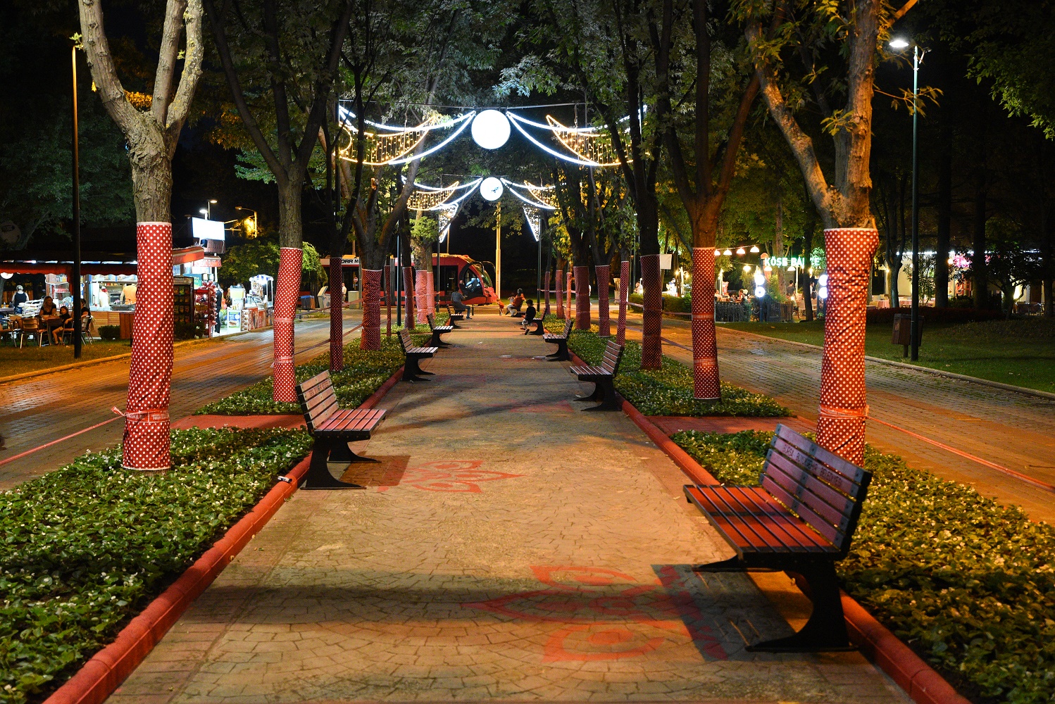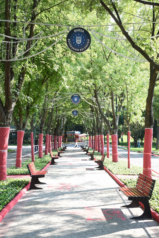 Büyükşehir Belediyesi ekipleri, tematik çalışmalar kapsamında Reşat Oyal Kültür Parkı’nda seçilen proje alanında çalışmalarını tamamladı. 100 metre uzunluğunda, çift tarafı ağaçlarla çevrili proje yolunda bordürler tamir edildi ve özel karışımlarla kırmızı renge boyandı. Parke taşlarına, kültürel öğelerden sonsuza giden görüntüde özel desenler resmedildi. Banklar kırmızı ve siyah olarak renklendirildi. Yeşil alana, temaya uygun sıcak renklerde özel çiçeklendirmeyle peyzaj çalışması yapıldı. Ağaç gövdeleri, özellikli, esneyen ve hava alan kırmızı renk, beyaz puantiyeli renkli kumaşlarla kaplandı. Dört metrelik özel direkler eklenip, 7 adet estetik aydınlatmayla tüm yol geçit haline getirilerek taçlandırıldı ve gece için ışık hüzmeleriyle ışık koridoru oluşturuldu. Temada ağırlıklı olarak siyah ve kırmızı rengin tercih edilme sebebi, sıcak, enerjik ve insanları çeken, etkili kontrast görüntüsünü sağlamak olarak açıklandı. İnşaat ve boya ekipleriyle başlayan çalışma, ressamların hünerli ellerinden çıkan eserlerin ve estetik aydınlatma işlerinin de bitimiyle adeta pozitif bir enerji koridoru halini aldı.