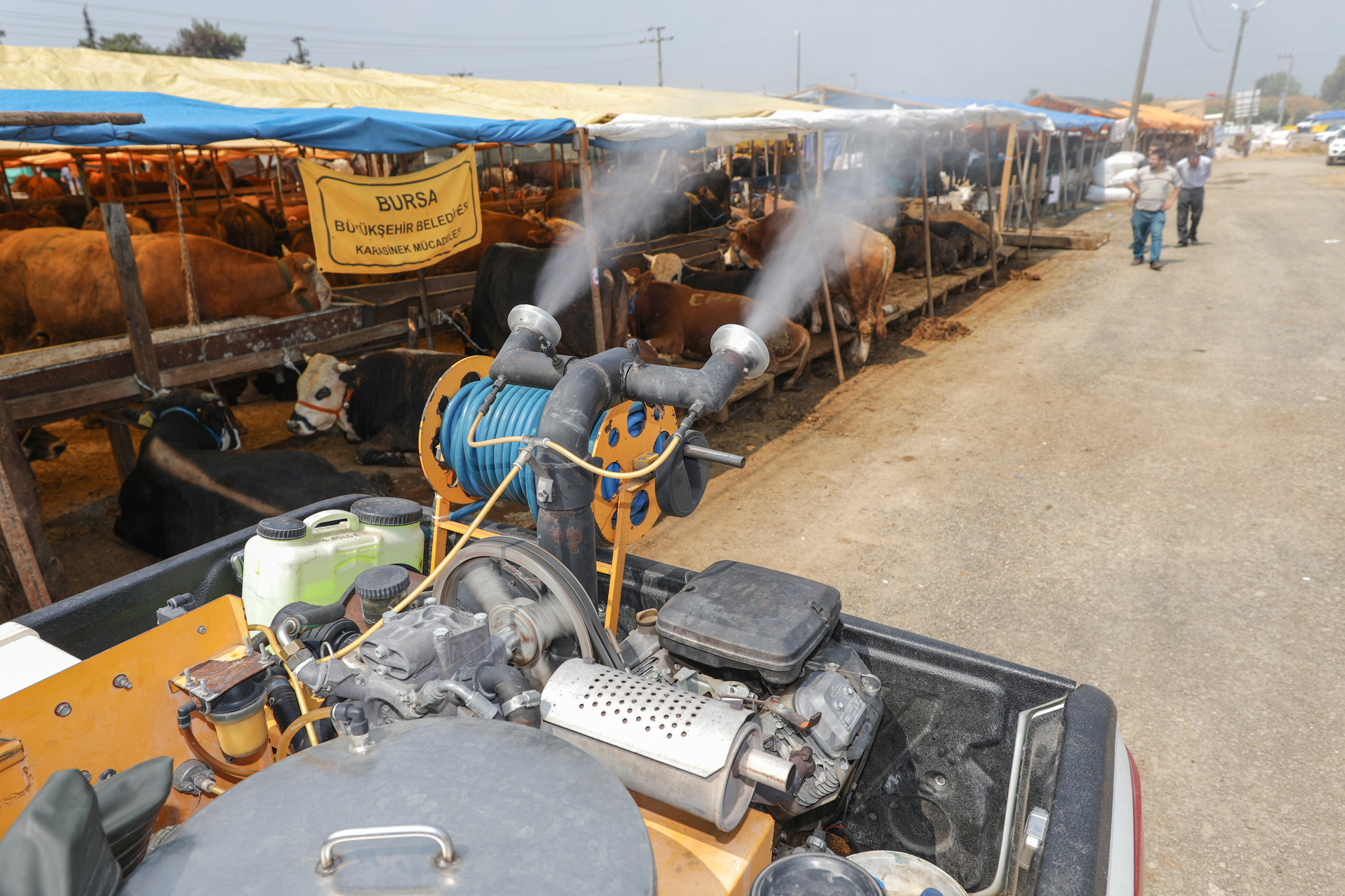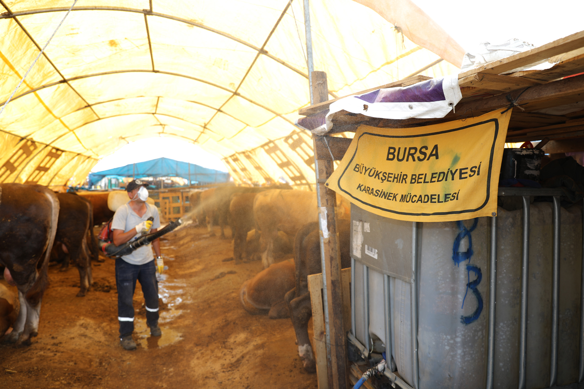 Bursa Büyükşehir Belediyesi Sağlık İşleri Dairesi Başkanlığı Veteriner Hizmetleri Şube Müdürlüğü ekipleri, 90 ilaçlama aracı ve ilaçlama ekipmanlarıyla tüm kurban satış alanları ve karasinek üreme ihtimali olan noktalarda karasinek ve diğer haşerelere karşı aralıksız olarak ilaçlama yapılıyor.