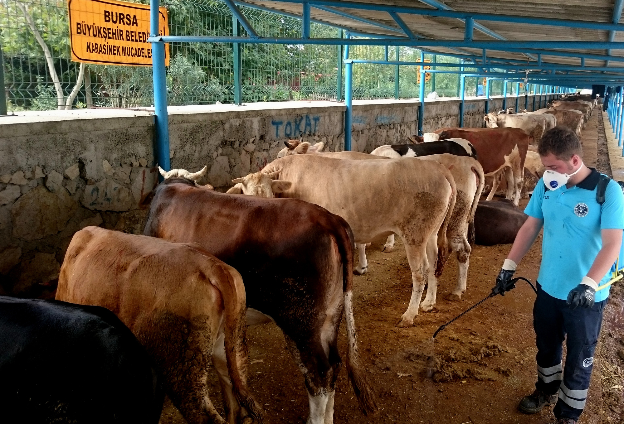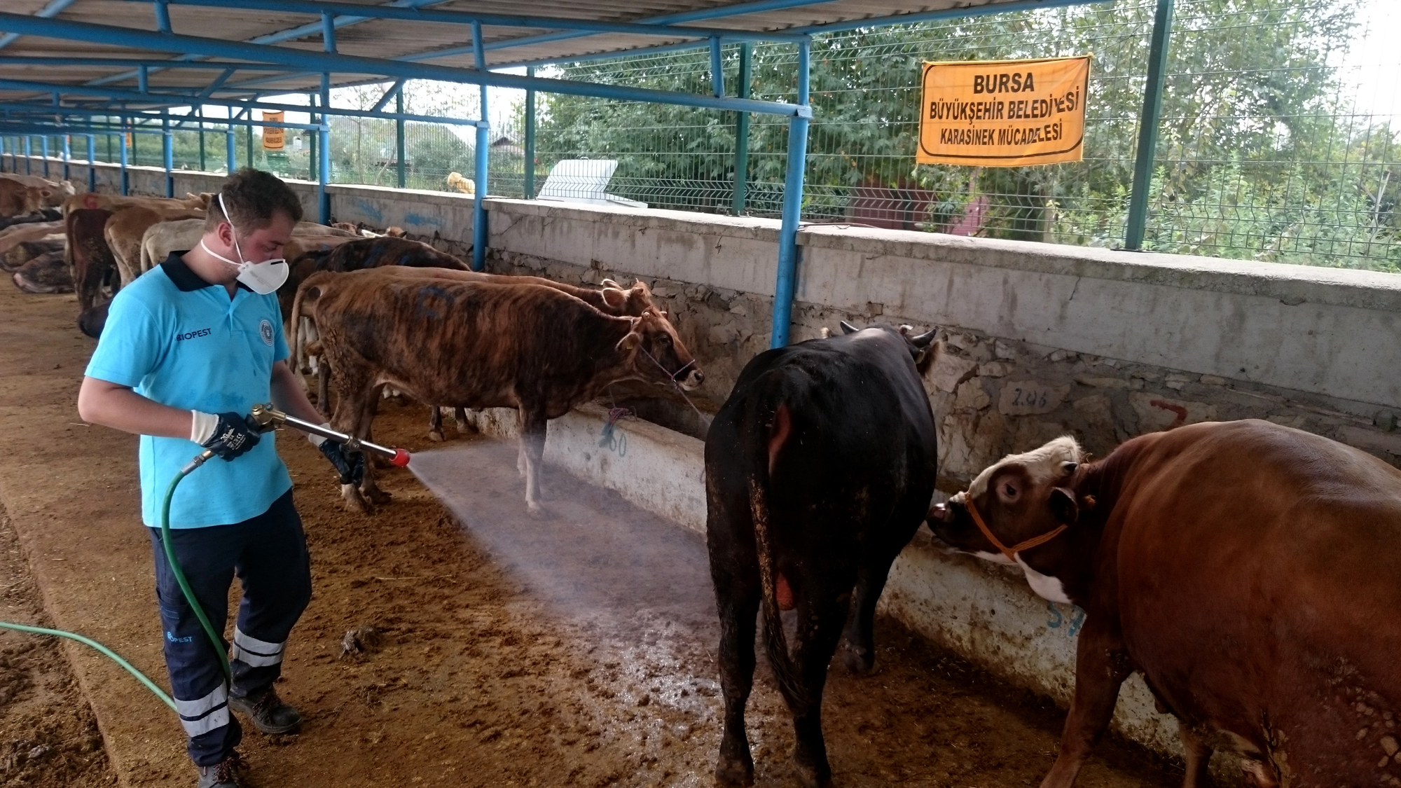 BURSA - Bursa Büyükşehir Belediyesi Sağlık İşleri Dairesi Başkanlığı ekipleri kent merkezinin yanı sıra 17 ilçede kurulan kurbanlık satış alanlarında karasinek ve diğer haşerelere karşı ilaçlama çalışmalarını aralıksız sürdürüyor.