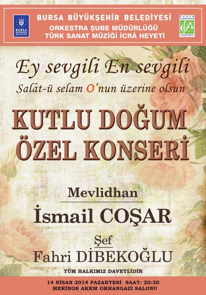 BURSA – Büyükşehir Belediyesi Orkestra Şube Müdürlüğü Türk Sanat Müziği İcra Heyeti´nin ‘Kutlu Doğum Özel Konseri’, 14 Nisan Pazartesi günü saat 20.30’da Atatürk Kongre Kültür Merkezi (Merinos AKKM) Orhangazi Salonu’nda gerçekleştirilecektir.