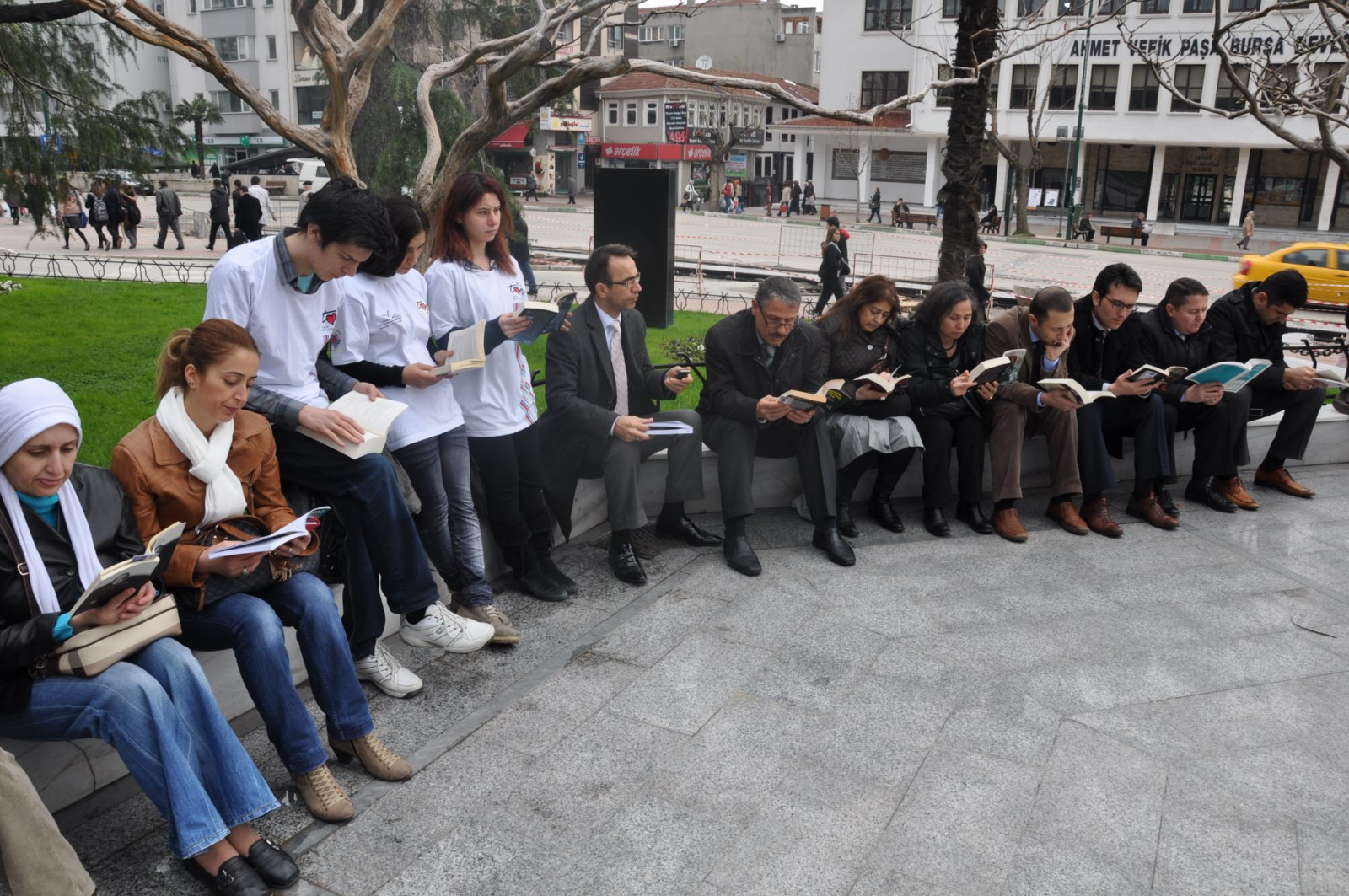 Büyükşehir Belediyesi Kültür ve Sosyal İşler Dairesi Başkanlığı Kütüphane Şube Müdürlüğü personeli, Heykel’deki Atatürk Anıtı önünde öğrencilerle birlikte kitap okudu. Sivil toplum kuruluşlarının da yoğun destek verdiği etkinliğe Bursa Kent Konseyi Gençlik Meclisi, İznik Gençlik Meclisi, Yıldırım Kent Konseyi üyeleri ve Bursa kütüphanecileri katıldı. ‘Kütüphaneler Haftası’ etkinlikleri kapsamında Türkiye’nin 81 ilinde eş zamanlı olarak gerçekleştirilen programda, okuma oranının yükselmesi ve okuma alışkanlığının çocuklara da teşvik edilmesi amaçlandı. Etkinliğe katılanlara kitap ayracı da dağıtıldı.