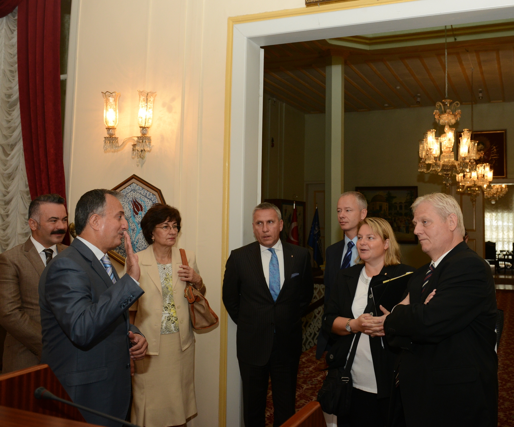 Başkanvekili Karadağ, Bursa´yla ilgili hediyeler takdim ettiği konuklarına 130 yıllık tarihi geçmişe sahip belediye meclis salonunu da gezdirdi.