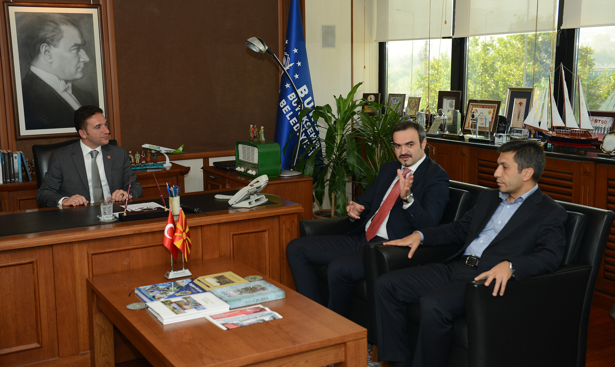 Büyükşehir Belediyesi Başkanvekili Atilla Ödünç, Makedonya Ekonomi Bakanı Valon Saracini ve Cair Belediye Başkanı İzet Meciti ile Acemler’deki Başkanlık makamında bir araya geldi. Bursa’nın her zaman Balkanların yanında olduğunu söyleyen Başkanvekili Ödünç, Büyükşehir Belediyesi’nin Balkanlar konusundaki hassasiyetini ve çalışmalarını anlattı. Ödünç, Balkan kökenli işadamlarının Makedonya’da yatırım yapacağına inandığını belirterek, “Türkiye ve Makedonya arasındaki ticari ilişkilerin güçlendirilmesi önemli. Kentlerin başarısı da ülkelerin başarısıdır. Gerekli diyaloğun kurularak ilişkilerin gelişeceğine inanıyorum” diye konuştu.