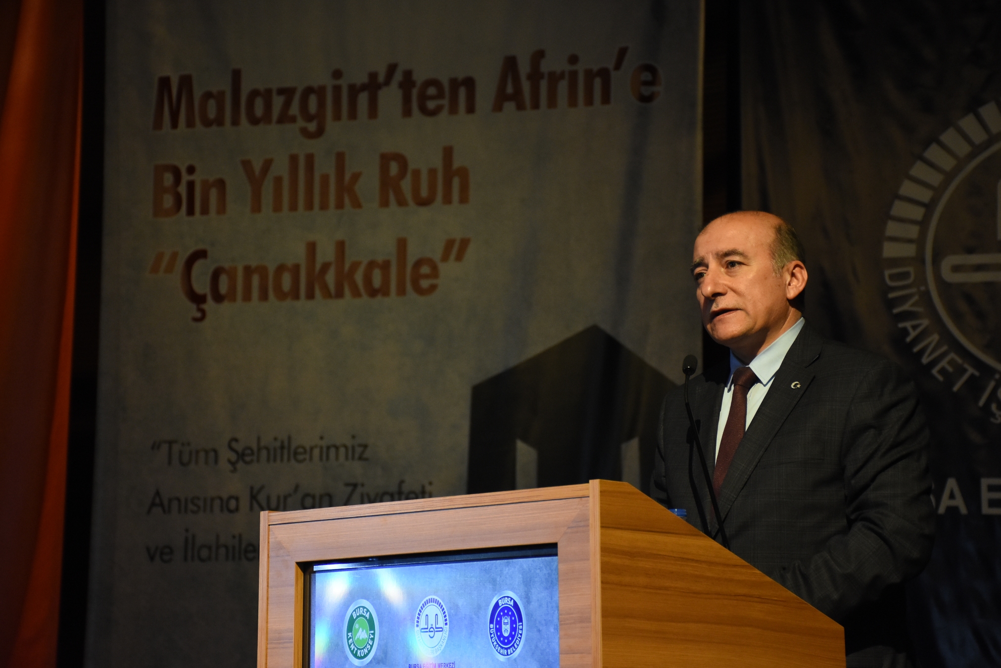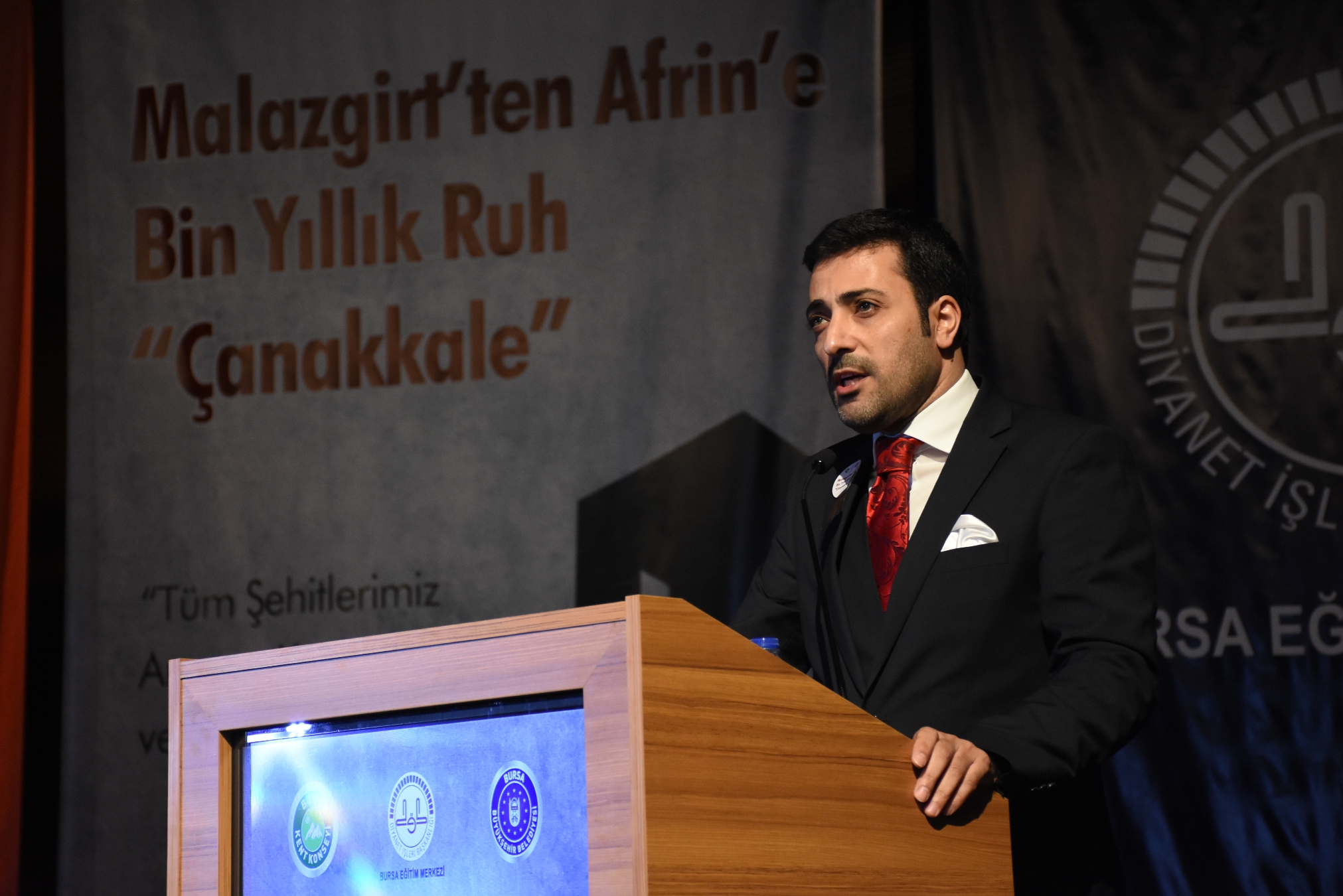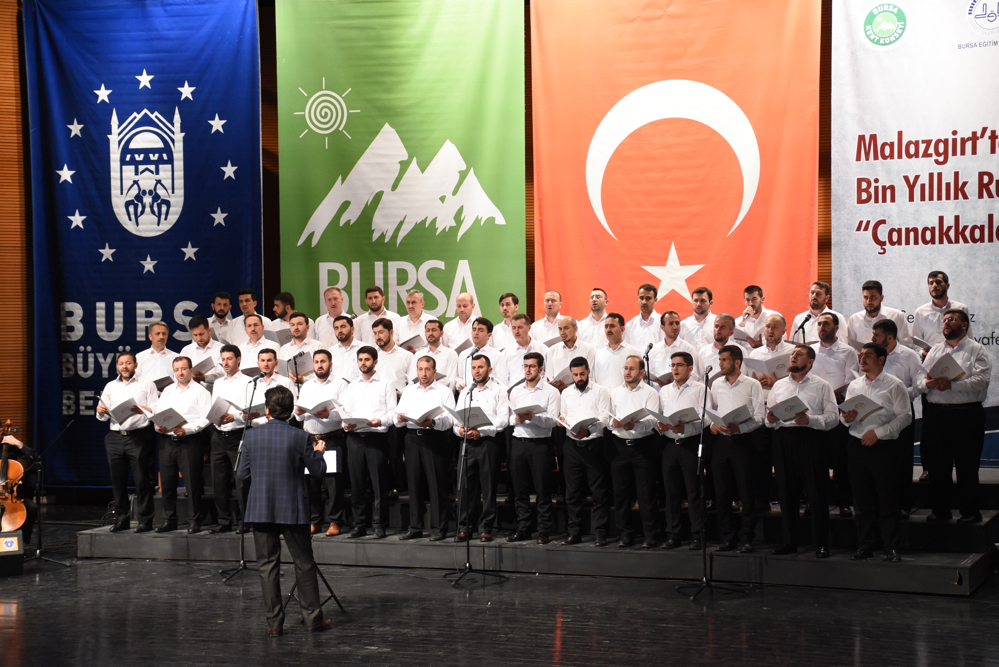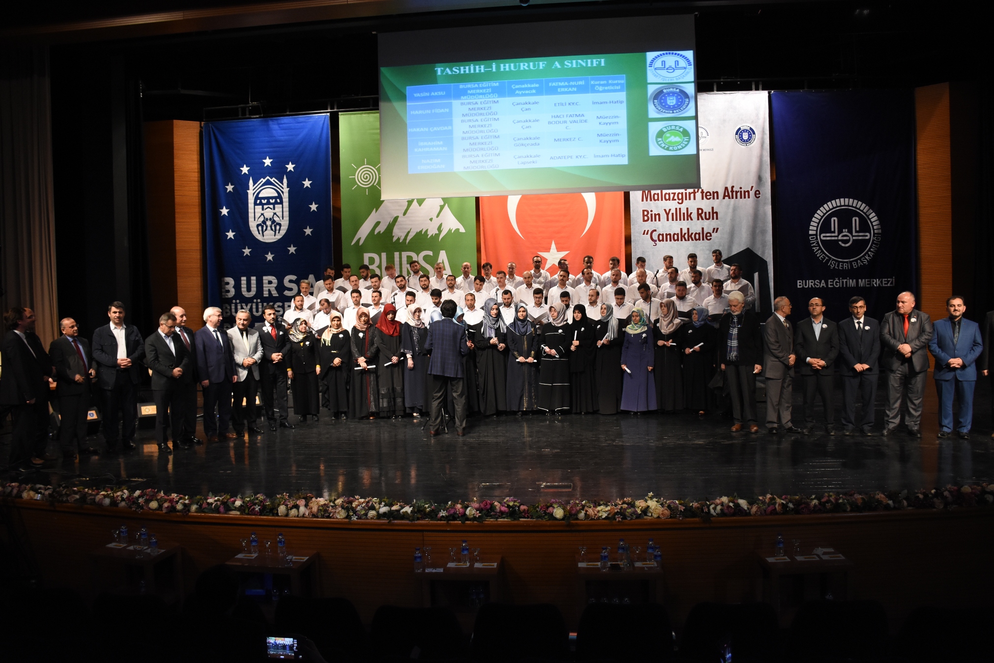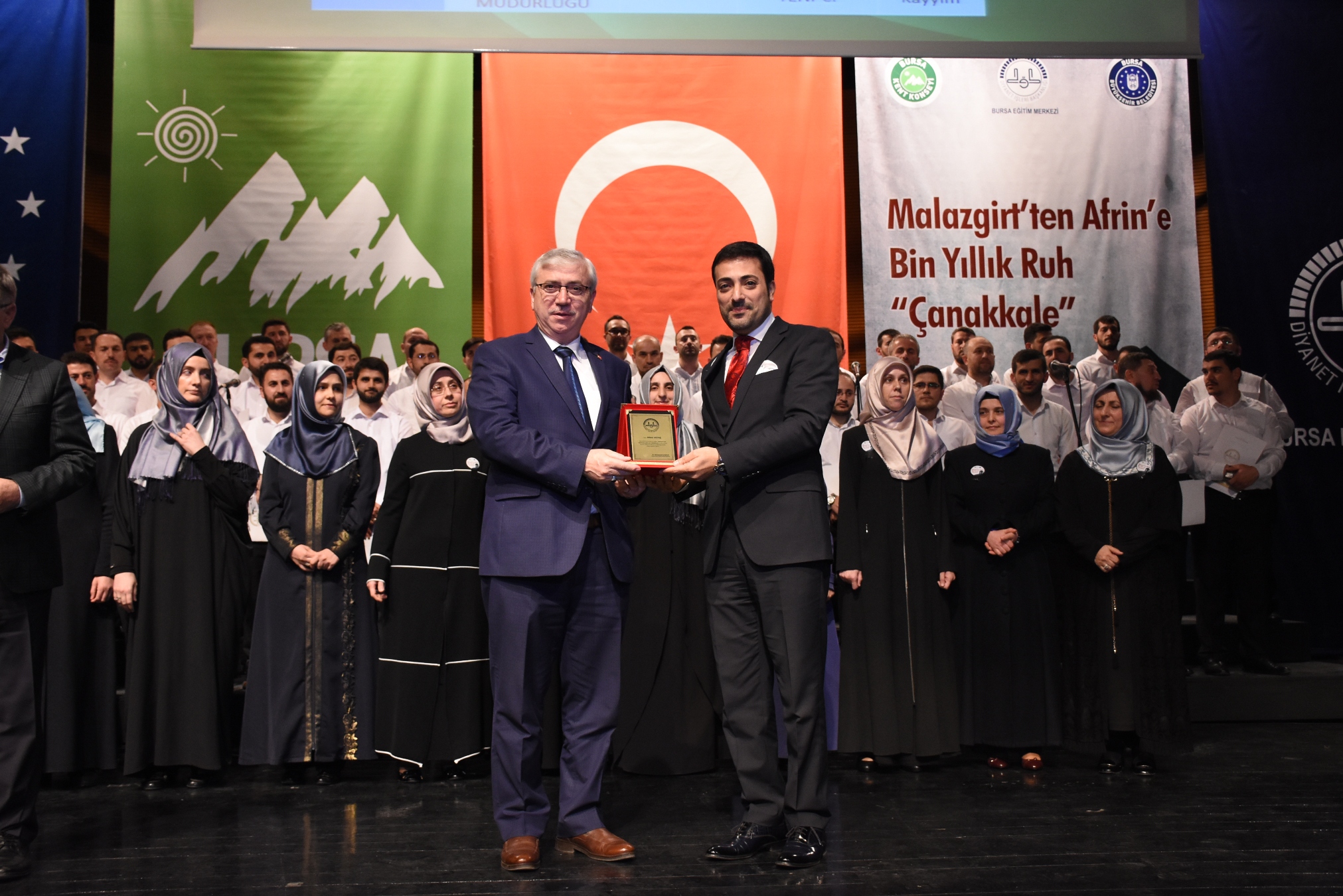 Bursa Kent Konseyi ve DİB Bursa Eğitim Merkezi işbirliğiyle Malazgirt’ten Afrin’e Bin Yıllık Ruh ‘Çanakkale’ adlı program Merinos AKKM Orhangazi Salonu’nda düzenlendi. 23. Dönem Milletvekili Ali Kul, Bursa Büyükşehir Belediyesi Başkanvekili Şükrü Köse, Bursa İl Müftüsü İzani Turan, Bursa Kent Konseyi Başkanı Hasan Çepni, DİB Bursa Eğitim Merkezi Müdürü Dr. Muhammed Coşkun ile ilçe müftüleri ve din görevlilerinin katıldığı programda Bursa Eğitim Merkezi’nde 9. Dönem Tashih-i Huruf Kursu’na katılan kursiyerler hünerlerini sergiledi. ‘Ordu Duası’ ile başlayan program ezan okunması, Kur’an-ı Kerim ziyafeti, saygı duruşu ve İstiklal Marşı ile devam etti. Programın ikinci bölümü ise, kursiyerler tarafından hazırlanan duygu ve coşku yüklü bir sinevizyon gösterisi ile başladı. Ardından Hicaz ve Hüseyni ilahiler, kasideler ve 15 Temmuz Salası ile devam etti.
