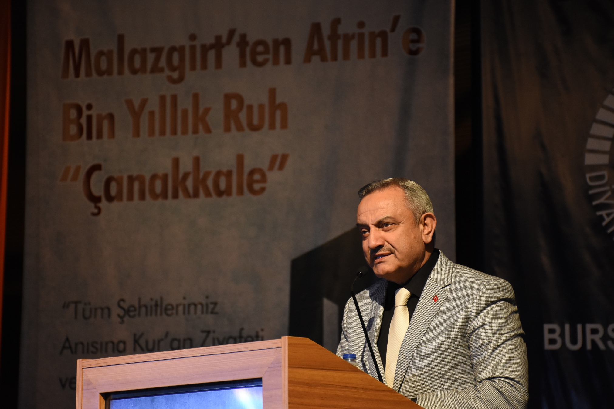 BURSA – Bursa Kent Konseyi ve Diyanet İşleri Başkanlığı Bursa Eğitim Merkezi işbirliğiyle düzenlenen programda Malazgirt’te, Çanakkale’de, Kurtuluş Savaşı’nda, terörle mücadelede, 15 Temmuz’da ve son olarak Afrin’de şehit olan tüm kahramanlarımız anısına Kur’an-ı Kerim ve ilahiler okundu.