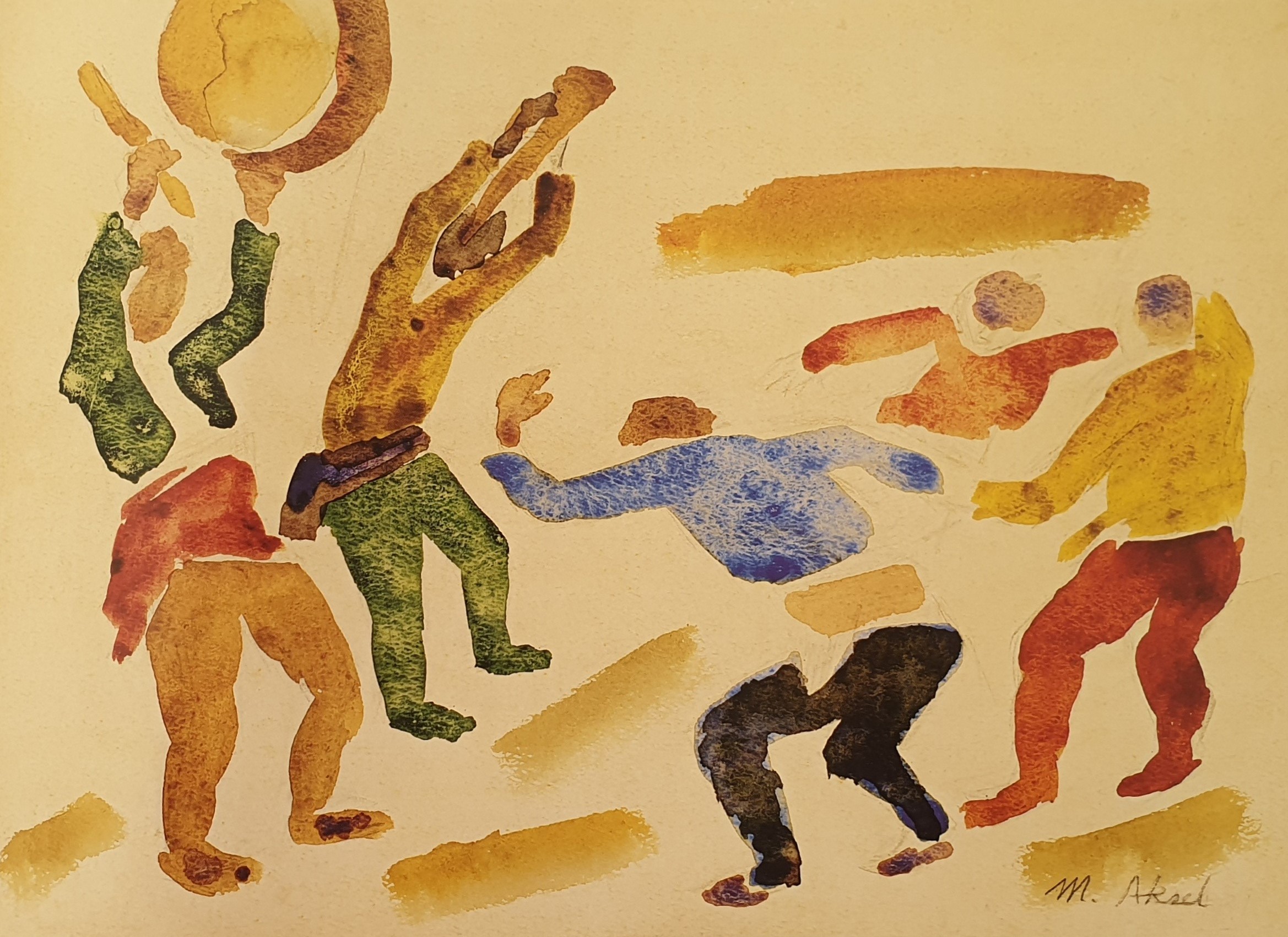 Bursa Kent Müzesi koleksiyonunda bulunan Malik Aksel imzalı tabloda suluboya tekniğinde yapılmış olan tabloda, figürler renk lekeleri şeklinde belirtilmiştir. Resmin sol tarafında elinde davul çalar vaziyette bir kişi ve onun hemen üst tarafında zurna çalan bir figür bulunuyor. Resmin sağ tarafında ise üç kişi halay çeker şekilde betimlenmiştir. Resimde mekan sarı lekelerle belirtilmiştir.