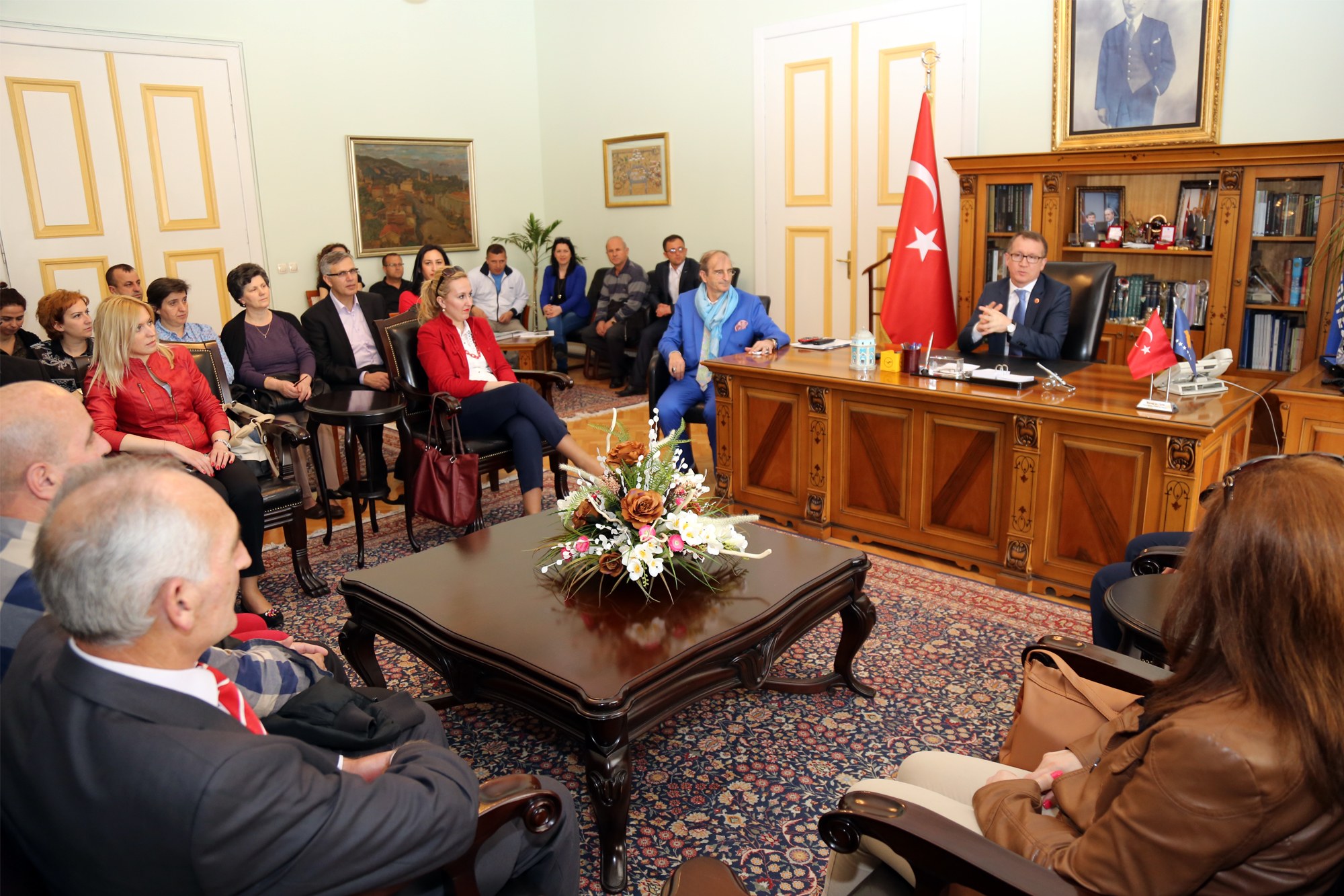 Büyükşehir Belediye Başkanvekili Abdülkadir Karlık, Kosovalı Öğretmenler Grubu Koordinatörü ve Mamuşa Anadolu Ortaokulu Müdürü Milazım Mazrek ile beraberindeki heyeti Heykel’deki tarihi başkanlık binasında ağırladı.