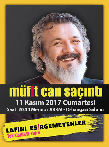 Ünlü oyuncu Müfit Can Saçıntı, “Lafını Esirgemeyenler” adlı tek kişilik oyunuyla Bursa’da izleyicisiyle buluşacak. Merinos Atatürk Kongre ve Kültür Merkezi Orhangazi salonunda 11 Kasım’da gerçekleşecek gösterinin başlama saati 20.30…2 saat süren gösteride Müfit Can Saçıntı, konuk oyuncuların bulunduğu videoları da kullanarak, benzerine daha önce pek rastlanmamış bir performans ile sanatseverlerin karşısına çıkacak. Bursa Kültür A.Ş. tarafından organize edilen etkinliğin biletleri www.bursakultur.com web sitesinden online temin edilebiliyor.