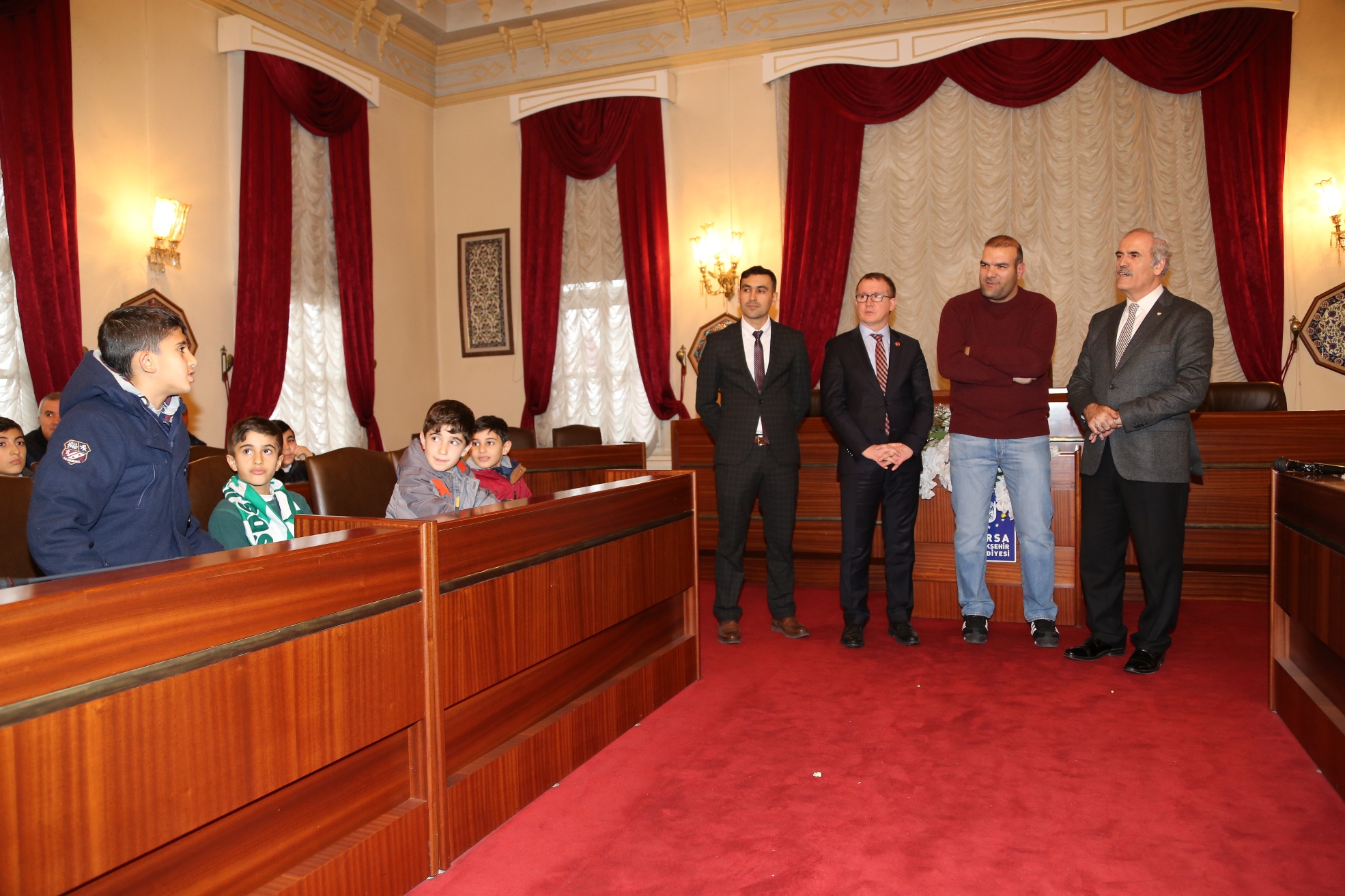 Mardin Nusaybin Çocuk Gelişim Merkezi Doğu-Batı Kardeşlik Platformu Proje Koordinatörü Şeyhmus Ak liderliğinde Bursa’ya gelen çocuklar, belediye binasında Başkan Altepe’ye çiçek takdim etti. Başkan Altepe de konuk ekibe çiniden el yapımı Büyükşehir Stadyumu maketi hediye etti.