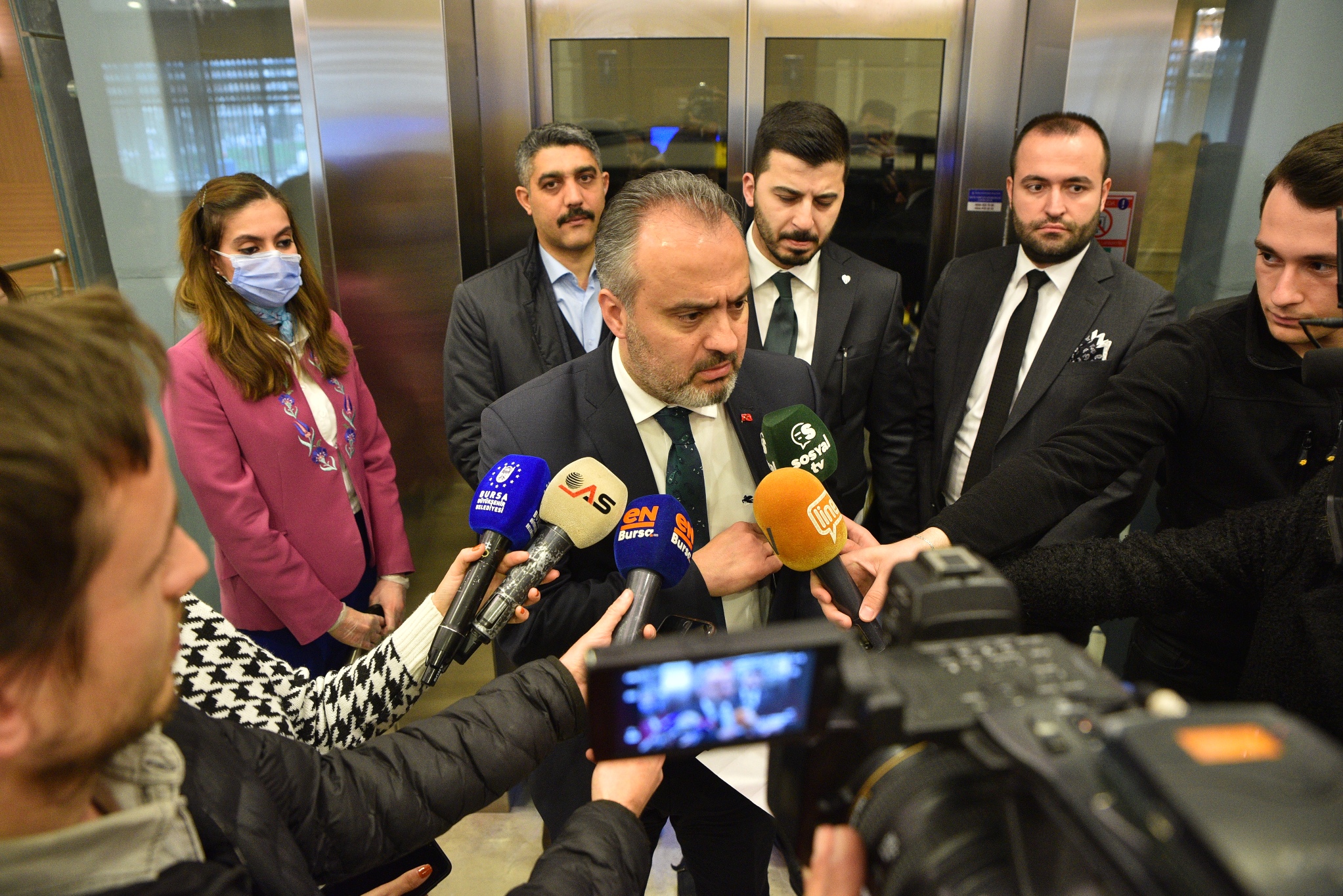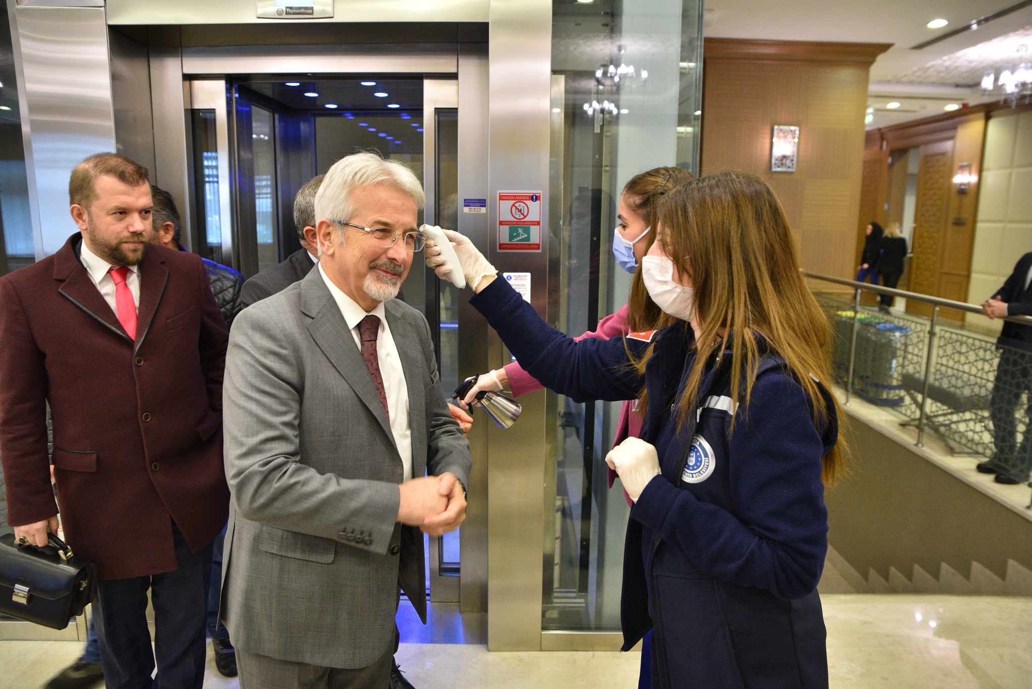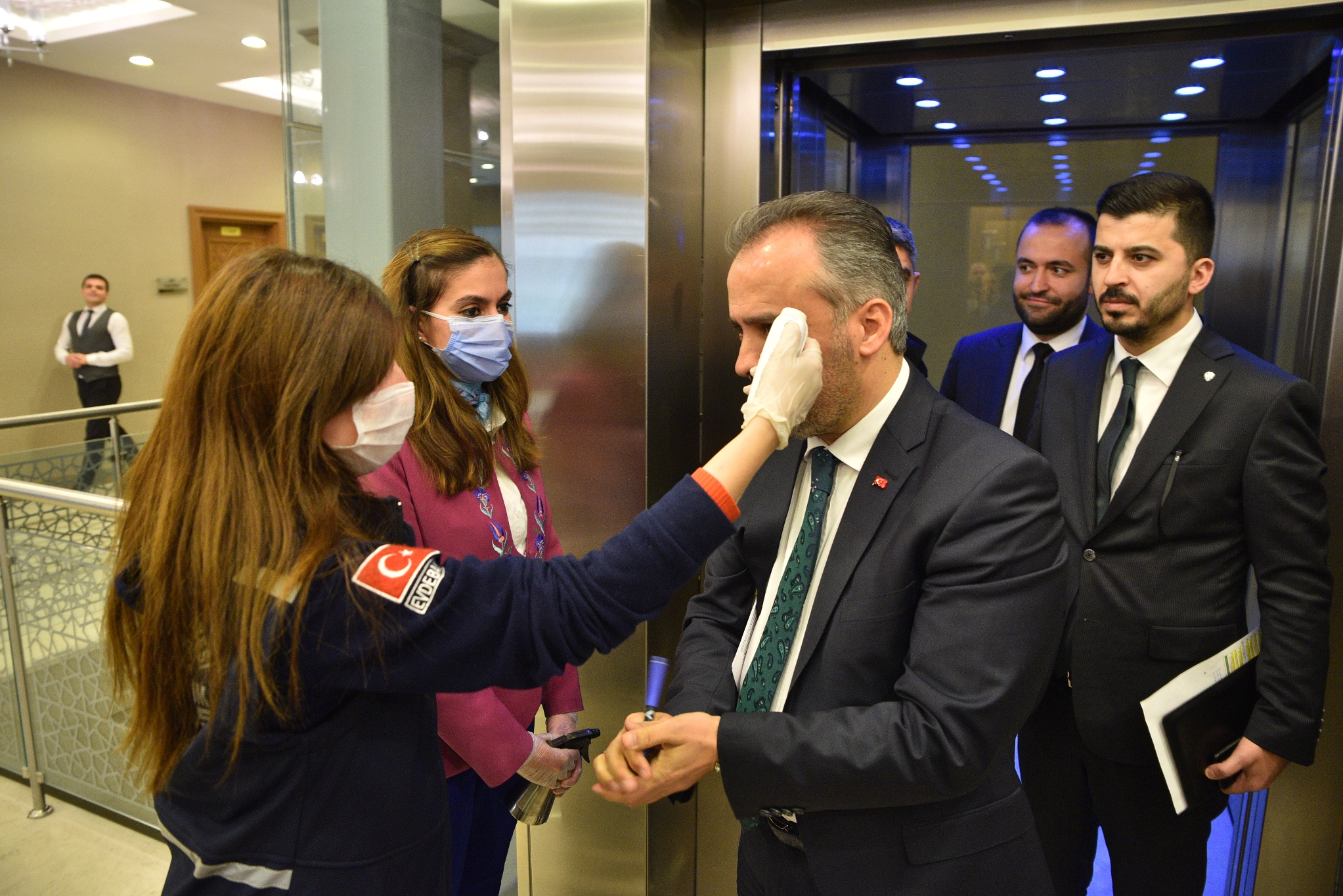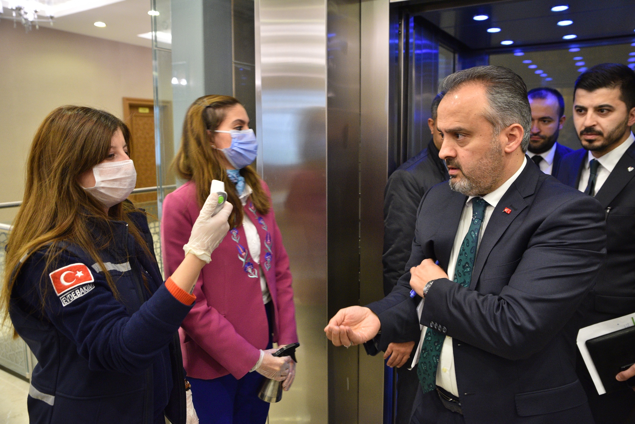 Bursa Büyükşehir Belediye Başkanı Alinur Aktaş da meclis salonunun bulunduğu kattan iner inmez, görevlilere ateşini ölçtürdü ve ellerini dezenfekte etti. Meclis toplantısının yapılmasıyla alakalı olarak Ankara ile irtibata geçtiklerini ve bu doğrultuda toplantıyı yaptıklarını belirten Başkan Aktaş, “Genel anlamda devletimizin koyduğu kural ve kaideler çerçevesinde bu sürecin sevk ve idaresiyle alakalı belirlenmiş uygulamalar var. Biz de Sayın Cumhurbaşkanımızın, ilgili kurumların hassasiyetini gözeterek, meclis üyesi arkadaşlarımızın arasına mesafeler koyduk. En ince detayına kadar tedbirli olacağız. Ayrıca bu uygulamalarla ilgili dün grup sözcüsü arkadaşlarımızla telefon görüşmesi yaptım. Sağ olsun bütün gruplar da bu konuda anlayış gösterdiler. İnşallah seri bir şekilde toparlanıp, toplantımızı gerçekleştirip, bu güncel süreci de değerlendireceğiz. Akabinde de 17 belediye başkanımızla bir değerlendirme toplantımız var. Hem Bursa olarak hem ülke olarak bu süreci en az sıkıntıyla, en az sorunla halletmek istiyoruz. Temennimiz Allah herkese sağlık sıhhat versin ama vatandaşlar olarak tedbirler almak da bizim vazifemiz. Biz de idare olarak onu yapmaya çalışıyoruz. Özellikle gösterdikleri hassasiyet nedeniyle tüm meclis üyesi arkadaşlarımıza teşekkür ediyorum. Mesafeli oturma sürecinden dolayı da takdir edersiniz ki sadece basın mensuplarını kabul edeceğiz. Diğer misafirlerimizi ve bürokratlarımızı dışarıda hazırladığımız sinevizyonlu ortamlarda misafir edeceğiz. Arzu edenler oradan canlı olarak takip edebilecekler” diye konuştu.