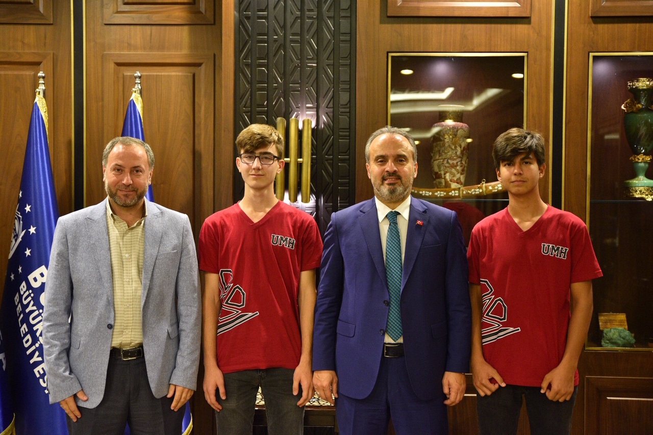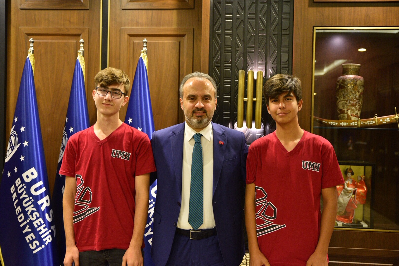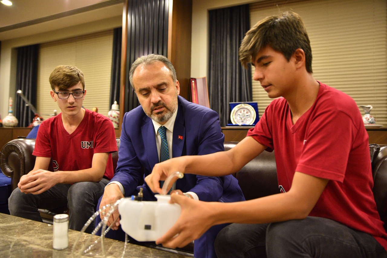 BURSA - Bursa Büyükşehir Belediye Başkanı Alinur Aktaş, otomobillerde yüzde 40 yakıt tasarrufu sağlayan buluşları ile Uluslararası Bilim Proje Olimpiyatının çevre kategorisinde birinci olan ve Meksika’da yapılacak Bilim Olimpiyatlarında Türkiye’yi temsil edecek liseli Abdülkerim Karabulut ve Serdar Aşkın’ı ağırladı.