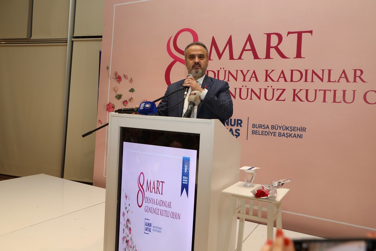 Büyükşehir Belediye Başkanı Alinur Aktaş, yaptığı konuşmada, Türk toplum tarihinin geleneksel yapısının babaya güçlü, anneye de duyarlı olmayı yüklediğini söyledi. Aynı geleneksel yapıda ağabeyin otoriteyi, ablanın fedakarlığı, dedenin hükmetmeyi ve ninenin de hoşgörüyü temsil ettiğini vurgulayan Başkan Aktaş, “Bugün nasıl algılanırsa algılansın, kadının Türk toplumunda daima saygın bir yeri olmuştur. Baktığımızda, tarihte devlet başkanlığı yapan kadınlar ‘ilk defa’ Türklerden çıkmıştır. Seçme ve seçilme hakkını, tüm ülkelerden önce ‘kadınlarımıza’ biz verdik. Kadınlarımız; fedakârlıkları, emekleri, sevgileri ve mücadeleleriyle insanlığın umudunu yeşertmektedir. İstiklal ve istikbal mücadelemizde daima ön safta oldular” dedi. Günümüz eğitim, ekonomi, siyaset dünyasında kadınların daha güçlü bir pozisyonunun olduğunu vurgulayan Başkan Aktaş, “Cumhurbaşkanımızın deyimiyle; ülkemize hizmetleriyle değer katan, tüm kadınlarımıza örnek olacak başarılarıyla adından söz ettiren, genç nesillere ışık tutan, geleceğimize yönelik tehditler karşısında dimdik duran, cesur ve özgüveni yüksek kadınlarımız, geleceğe yürüyüşümüzde de en önemli güvencemizdir. Bu vesileyle, tüm kadınlarımızın 8 Mart Dünya Kadınlar Günü’nü kutluyorum” diye konuştu.