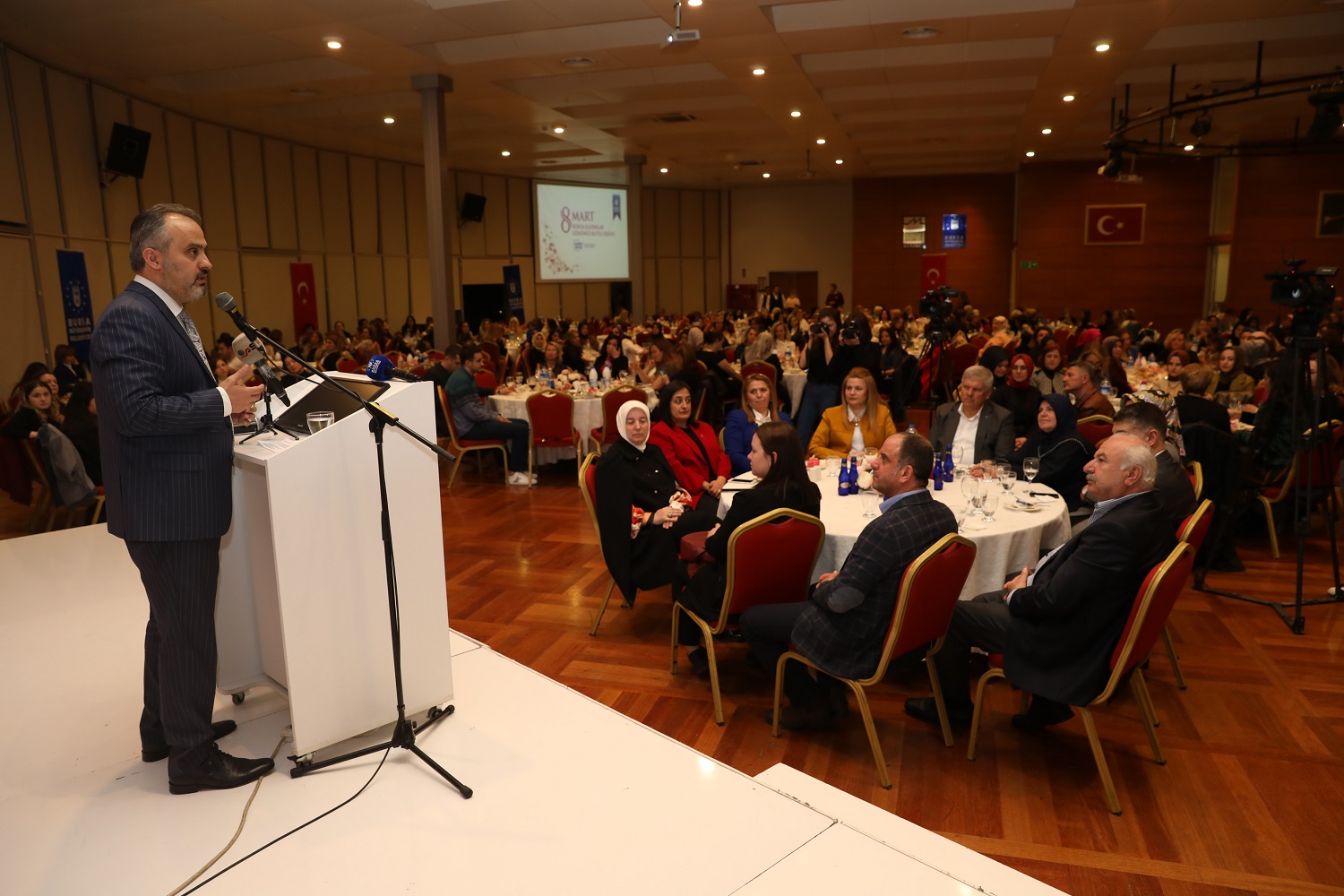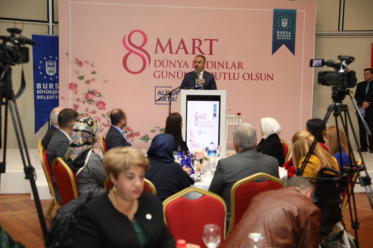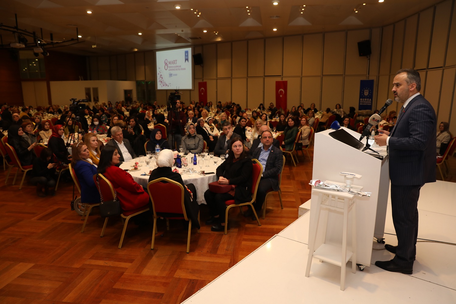 BURSA - Bursa’da çeşitli kurum ve STK’larda görev yapan kadınlar, Büyükşehir Belediyesi’nin organize ettiği etkinlikte bir araya geldi. 8 Mart Dünya Kadınlar Günü nedeniyle gerçekleştirilen organizasyona, Büyükşehir Belediye Başkanı Alinur Aktaş da katıldı.