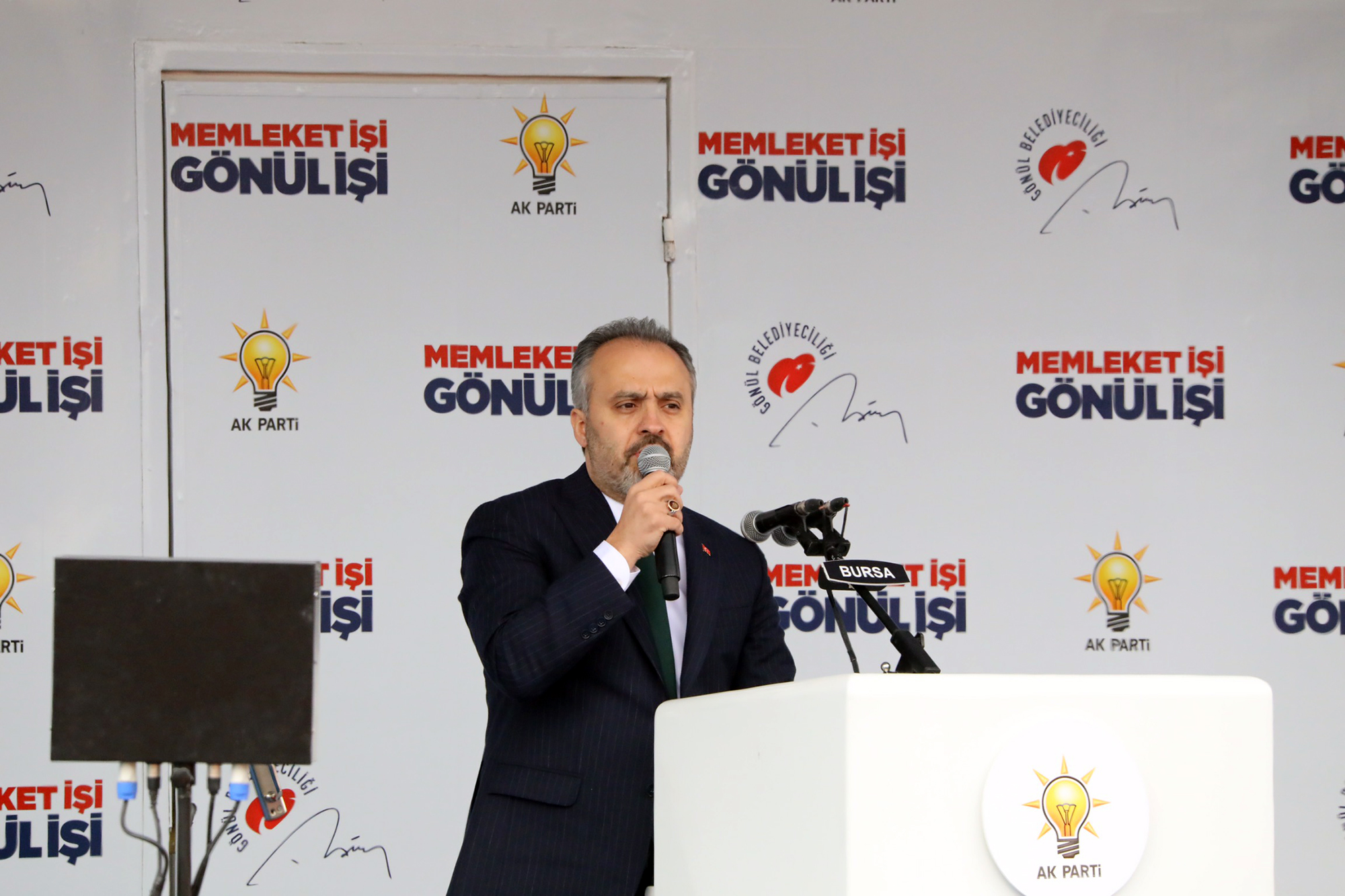 Bursa Büyükşehir Belediye Başkanı Alinur Aktaş da miting alanında Bursalılara seslendi ve hem son 15 ayda hayata geçirdikleri çalışmaları hem de seçim sonrası yapacakları projelerin bir kısmını anlattı. Bursa’nın geleneksel dokusunu bozmadan, modern ama etkili dokunuşlarla, Bursa'yı daha yaşanabilir hale getirmenin derdiyle gece gündüz çalıştıklarını ifade eden Başkan Aktaş, “Bursa’mızı, sivil toplum kuruluşlarından siyasi partilerine kadar bu şehrin tüm dinamikleriyle birlikte yönetmek üzere yola çıktık. Görevi devralmamızın üzerinden yaklaşık 16 ay geçti. Bu sürede, kah sabah erken saatlerde, kah gece yarılarına kadar, yapılanları ve yapılması gerekenleri en ince detayına kadar planlayarak yol haritamızı belirledik. Fırsat bulduğumuz tüm vakitlerde sizlerle buluşarak, sizlerin Bursa’ya dair düşüncelerini aldık. Bursa’yı ortak akılla yönetirsek, Bursa’yı Bursalılarla yönetirsek bu şehir yaşanılır hale gelir dedik. Hani, Yunus Emre’miz diyor ya: Dostun evi gönüllerdir, gönüller yapmaya geldim!... Bizler Bursa’ya gönül verenler olarak, gönüller kazanma niyetimizi her ortamda dillendirdik. Ulaşım başta olmak üzere birçok soruna çözümler üretmeye çalıştık. Ak kadrolar eliyle başlayan şehirlerimizi ihya ve inşa hareketinde işimiz çok, sorumluluğumuz ağır. Niyetimiz geriden gelecek nesillere ilham olacak eserler bırakmak. Bu süreçte, cumhurbaşkanımız sayın Recep Tayyip Erdoğan başta olmak üzere, siz değerli hemşehrilerimin desteği hizmetlerimize güç verecek. Bizim Bursa için derdimiz, heyecanız var. Bunun için kapı kapı dolaşıp, herkese heyecanımızı anlatacağız. 20 senedir tek bir proje üretmeyenlere ders vermek için hep birlikte çalışacağız” diye konuştu.
