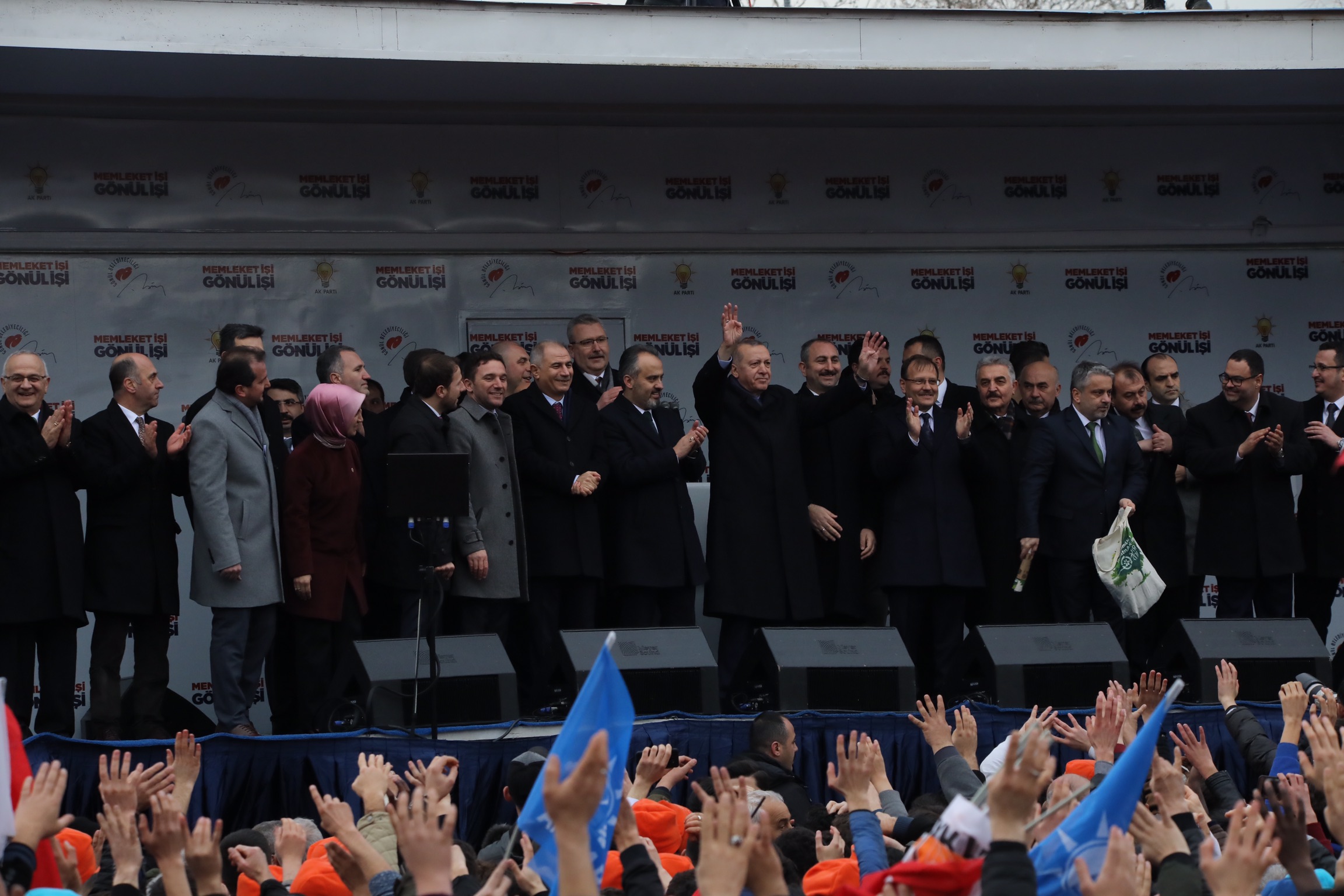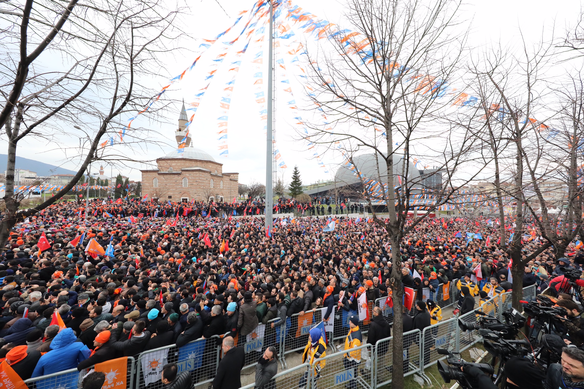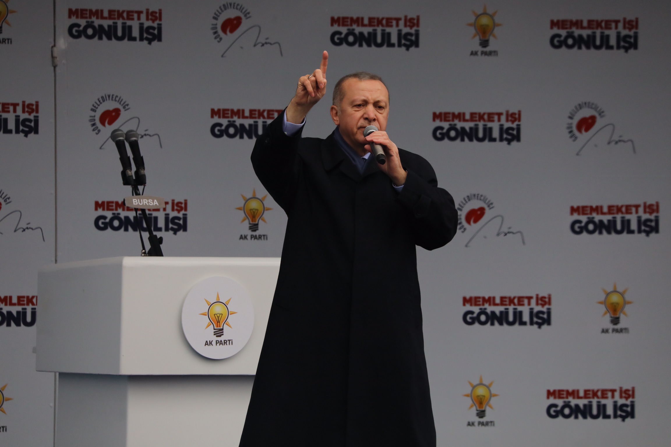 Cumhurbaşkanı Recep Tayyip Erdoğan, Gökdere Meydanı’nda düzenlenen mitingde soğuk havaya rağmen alanı hınca hınç dolduran Bursalılara seslendi. Sözlerine, “Osmanlı’yı beylikten cihan devletine taşıyan Bursa” diyerek başlayan Cumhurbaşkanı Erdoğan, “Toprağı verimli, havası temiz, denizi sakin, sanayisi üretken, ticareti bereketli, insanı çalışkan bu güzel, yeşil Bursa’yı selamlıyorum. Sokakları huzurlu, dağı ulu, tarihi köklü, geleceği aydınlık Bursa’yı selamlıyorum. Sizleri her biri Bursa’mızın alametifarikası olan kestane şekeri tadıyla, zeytin ve şeftali lezzetiyle, termal su sıcaklığıyla, çini güzelliğiyle selamlıyorum” dedi. Bursa çınarlarının sadece dibinde oturanlara değil, bölgeye de huzur verdiğini ifade eden Erdoğan, “Üretimle büyüyen bu ulu şehirde bir kez daha sizlerle birlikte olmanın, kucaklaşmanın mutluluğunu yaşıyorum. Coğrafyanın dört bir yanından gelip Bursa’da kök salan kardeşlerimiz için bu topraklar ebedi yurttur. Bunun için Bursa şehirlerden bir şehir değil, adına nice şiirler yazılan, eserler verilen bir yerdir. Bursa işte böyle bir rüyalar şehridir. Yüreğin ve emeğin şehri Bursa’nın 31 Mart’ta tercihini bir kez daha gelişme, kalkınma ve büyümeden yana kullanacağına inanıyorum” dedi.
