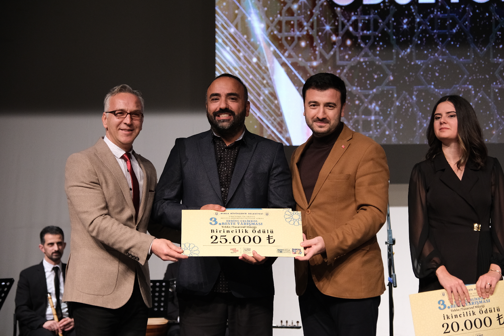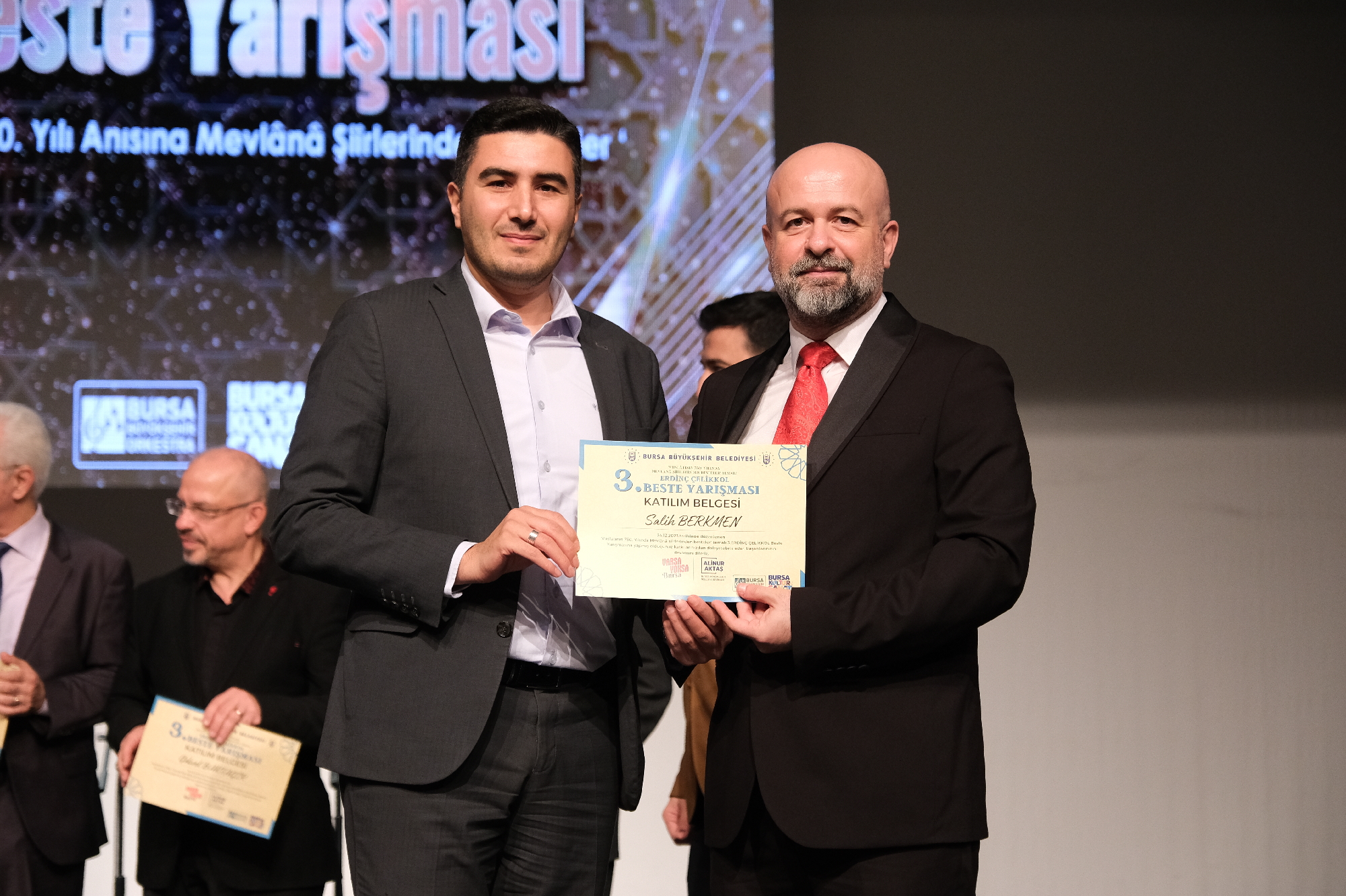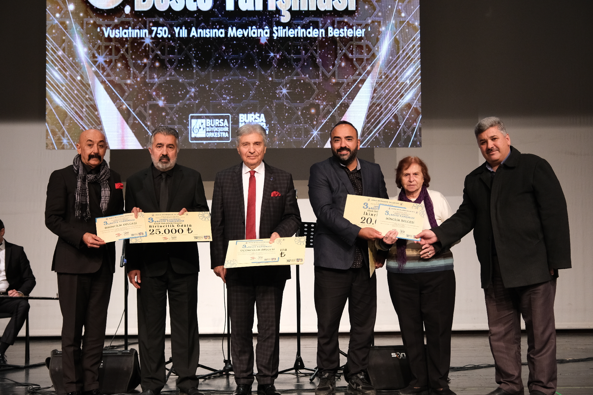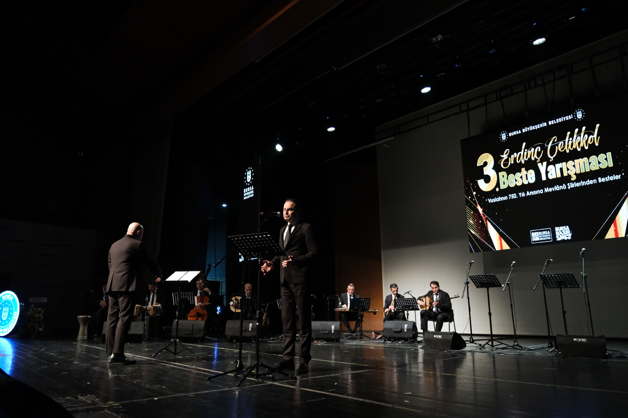 BURSA - Bursa Büyükşehir Belediyesi tarafından bu yıl “Vuslatın 750. Yılında Mevlâna Şiirlerinden Besteler” temasıyla düzenlenen 3. Erdinç Çelikkol Beste Yarışması’nda kazanan eserler, sanatseverlerin yoğun ilgi gösterdiği müzik dolu gecede belli oldu.