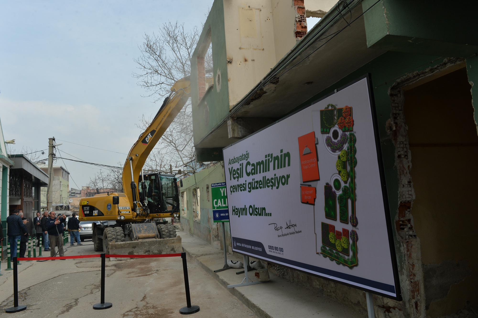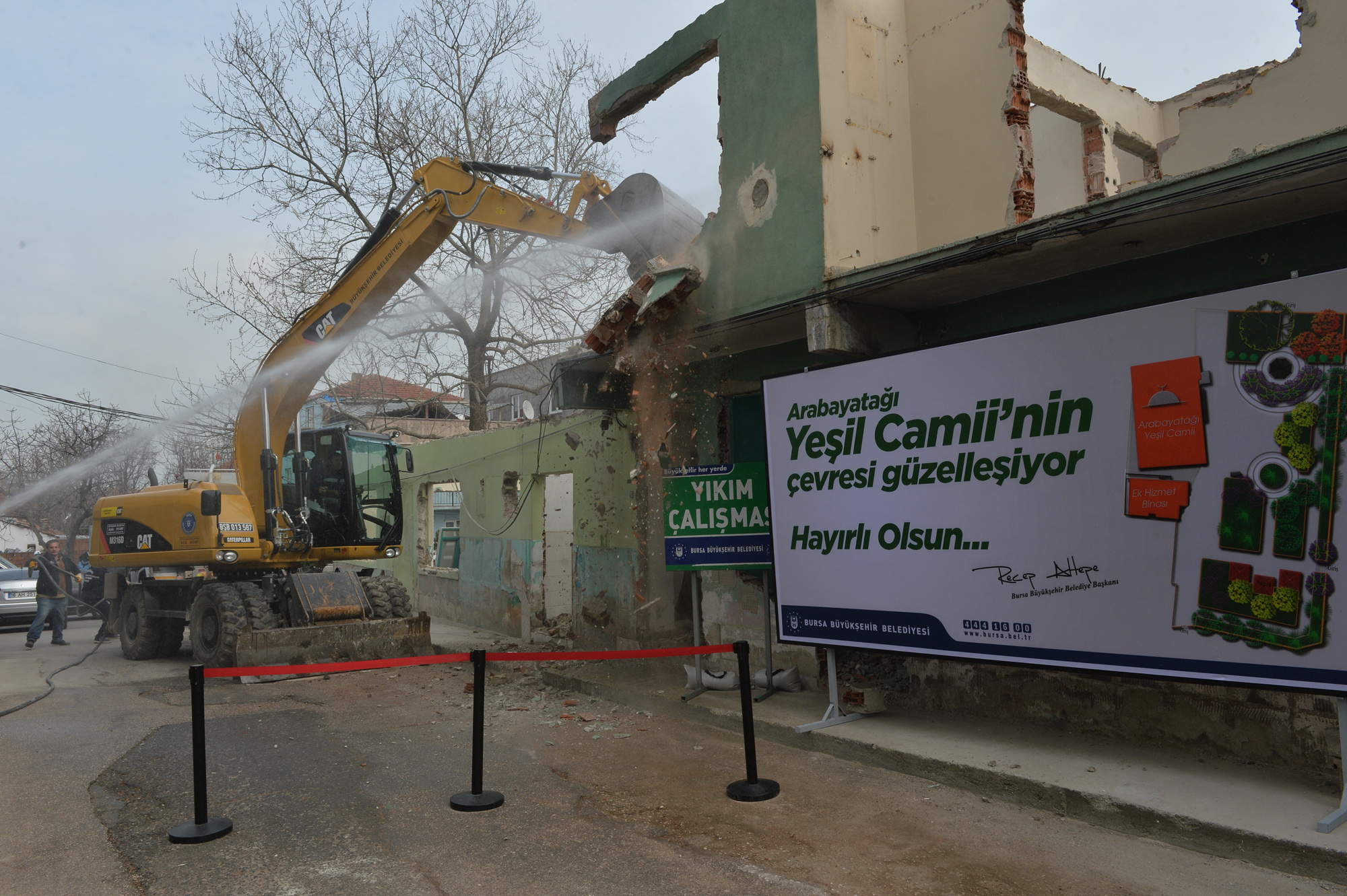 - BURSA’NIN EN ESKİ MAHALLELERİNDEN ARABAYATAĞI’NA MODERN BİR MEYDAN KAZANDIRMAK İÇİN ÇALIŞMALARA 5 YIL ÖNCE BAŞLAYAN BÜYÜKŞEHİR BELEDİYESİ YEŞİL CAMİ EK HİZMET BİNASINI HİZMETE AÇTI, ARDINDAN PROJE ALANI ÜZERİNDE YER ALAN BİNALARIN YIKIMINI BAŞLATTI.