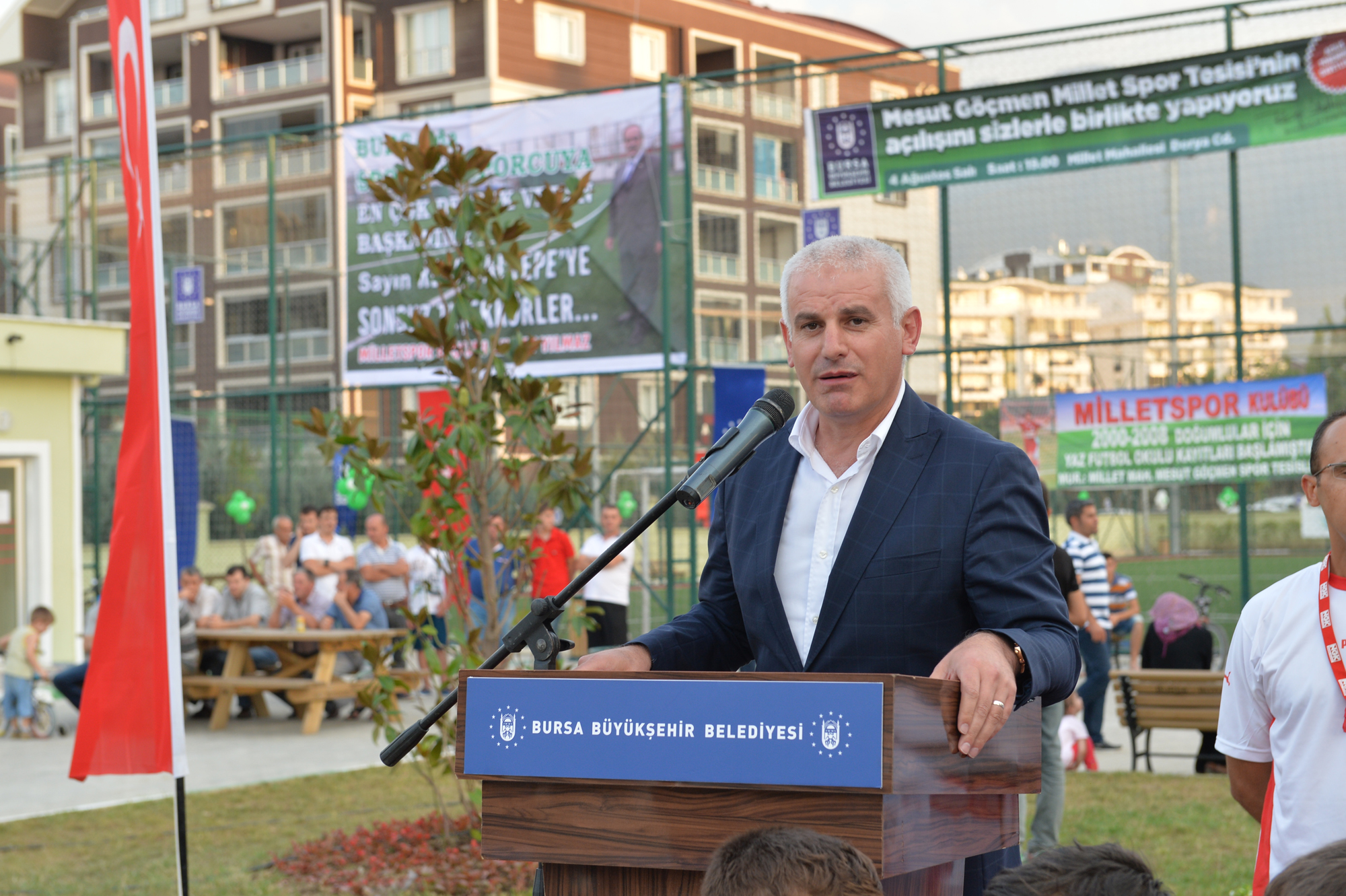 Binlerce yıllık geleneksel değerleriyle geleceğe yürüyen Bursa, Büyükşehir Belediyesinin ‘yeniden inşa’ projesi kapsamında değişerek gelişimini sürdürüyor. Bursa’ya hizmette sürekli yükselttiği kalite anlayışıyla şehrin yaşanılabilirliğini artıran Büyükşehir Belediyesi, Millet Mahallesi’nde bir spor tesisini daha hizmete aldı. Millet Mahallesi Spor Kulübü Başkanı Ahmet Yılmaz’ın trafik kazasında vefat eden oğlu Mesut’un isminin verildiği Mesut Göçmen Spor Tesisleri: Bursa Valisi Münir Karaloğlu, Büyükşehir Belediye Başkanı Recep Altepe, AK Parti İl Başkanı Cemalettin Torun, Bursa Milletvekili Hüseyin Şahin, Yıldırım Belediye Başkan Yardımcısı Şenol Şimşek, BASKF Başkanı Cemal Vardar, Millet Mahallesi Spor Kulübü Başkanı Ahmet Yılmaz, belediye bürokratları ve vatandaşların katıldığı törenle sporcuların hizmetine sunuldu.