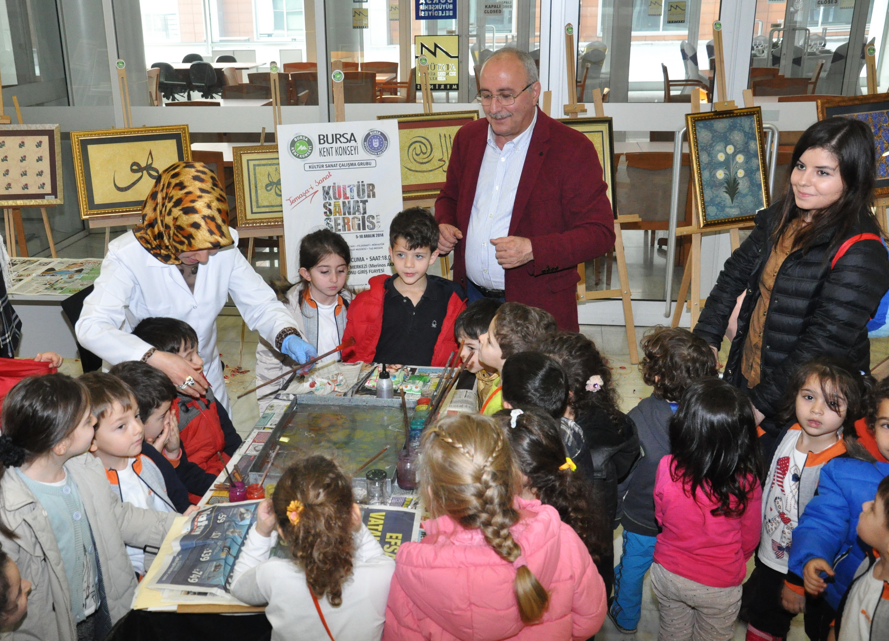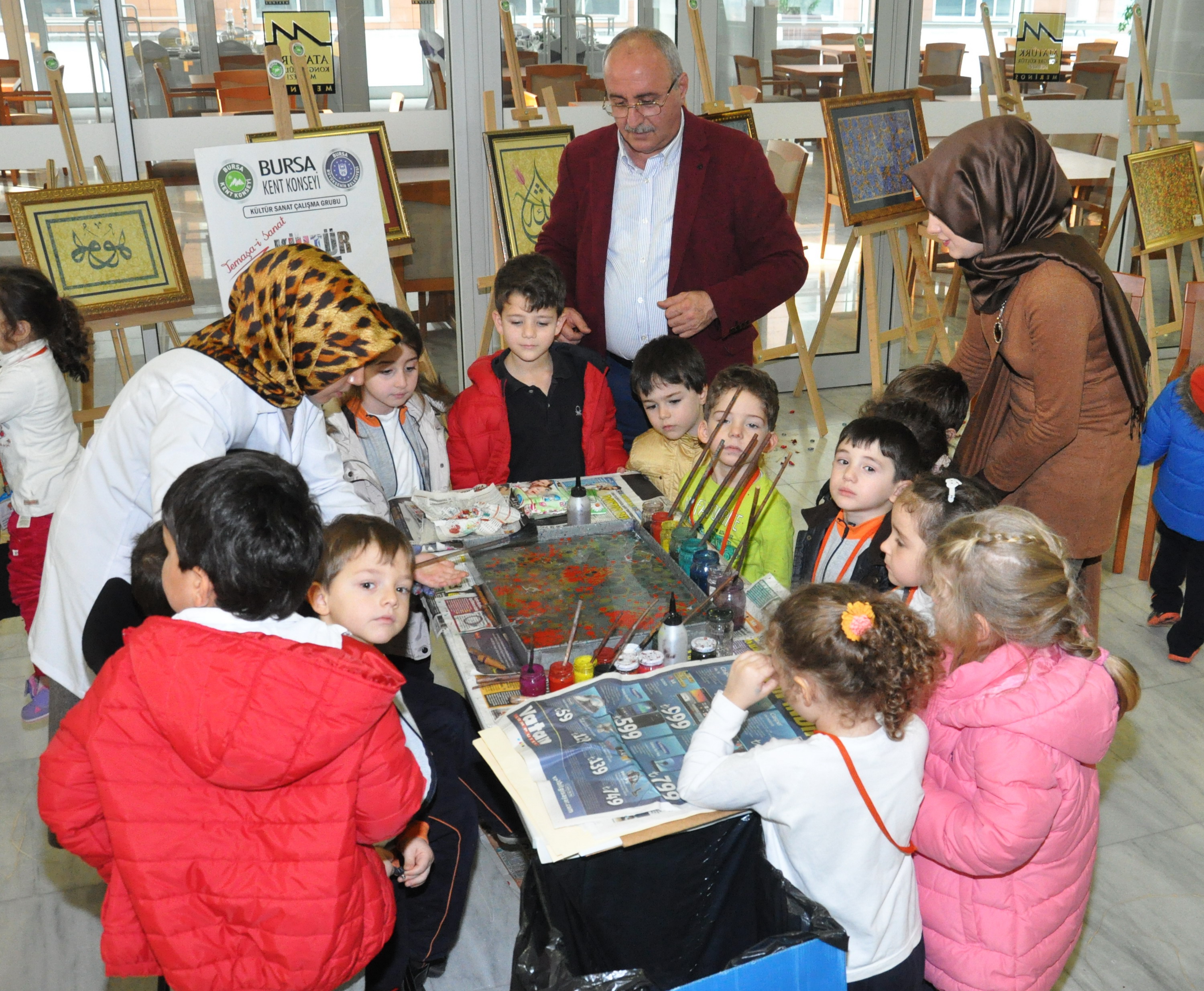 BKK Kültür Sanat Çalışma Grubu üyeleri tarafından Atatürk Kongre Kültür Merkezi (Merinos AKKM) Orhangazi Giriş fuayesinde açılan ‘Temaşa-i Sanat’ konulu kültür sanat sergisi, Mandalina Montessori Anaokulu öğrencileri tarafından ziyaret edildi. BKK Başkanı Semih Pala ve BKK Kültür Sanat Çalışma Grubu Temsilcisi Gülay Ünal tarafından karşılanan minikler, kent konseyinin gönüllü katılımcıları tarafından yapılan el emeği ürünleri öğretmenleri eşliğinde gezdi. Ebru, filografi, rolyef, koza, naht, çini, minyatür, hüsni-i hat, dokuma, takı ve tezhip gibi sanatlara ait 60 eserin yer aldığı sergi alanında, miniklere Gülay Ünal tarafından uygulamalı Ebru sanatı anlatıldı. Ellerine fırçaları alarak suya desen çizen öğrencilere, ortaya çıkan tablolar günün hatırası olarak hediye edildi.