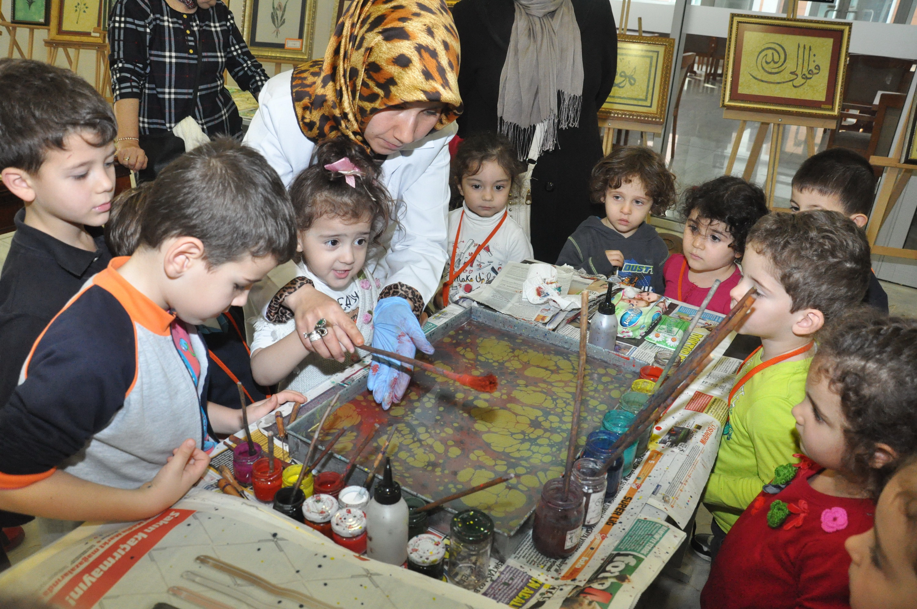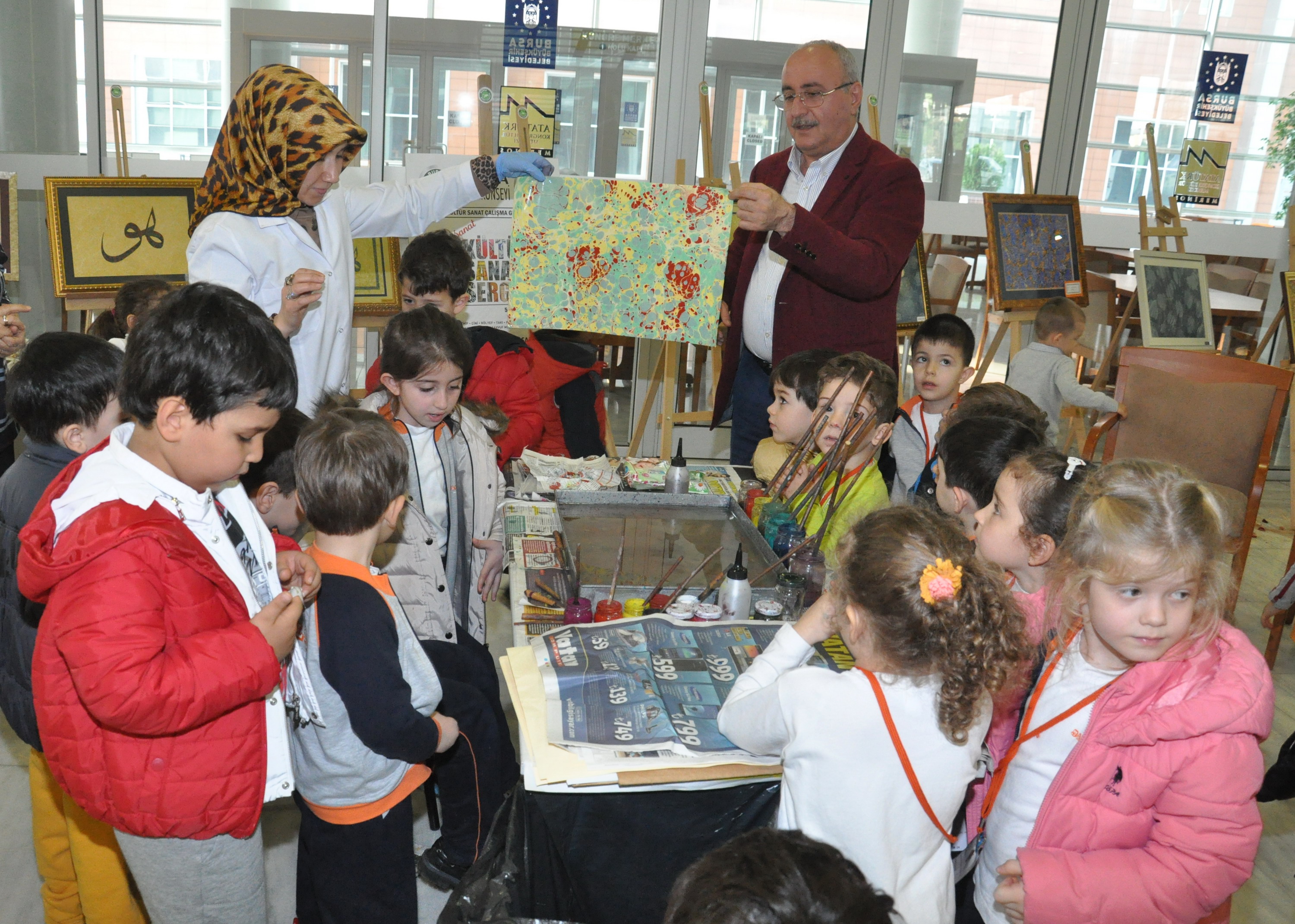 BURSA – Bursa Kent Konseyi (BKK) Kültür Sanat Çalışma Grubu tarafından hazırlanan ‘Temaşa-i Sanat’ temalı kültür sanat sergisini, anaokulu çocukları ziyaret ederek uygulamalı ebru sanatı eğitim aldı.