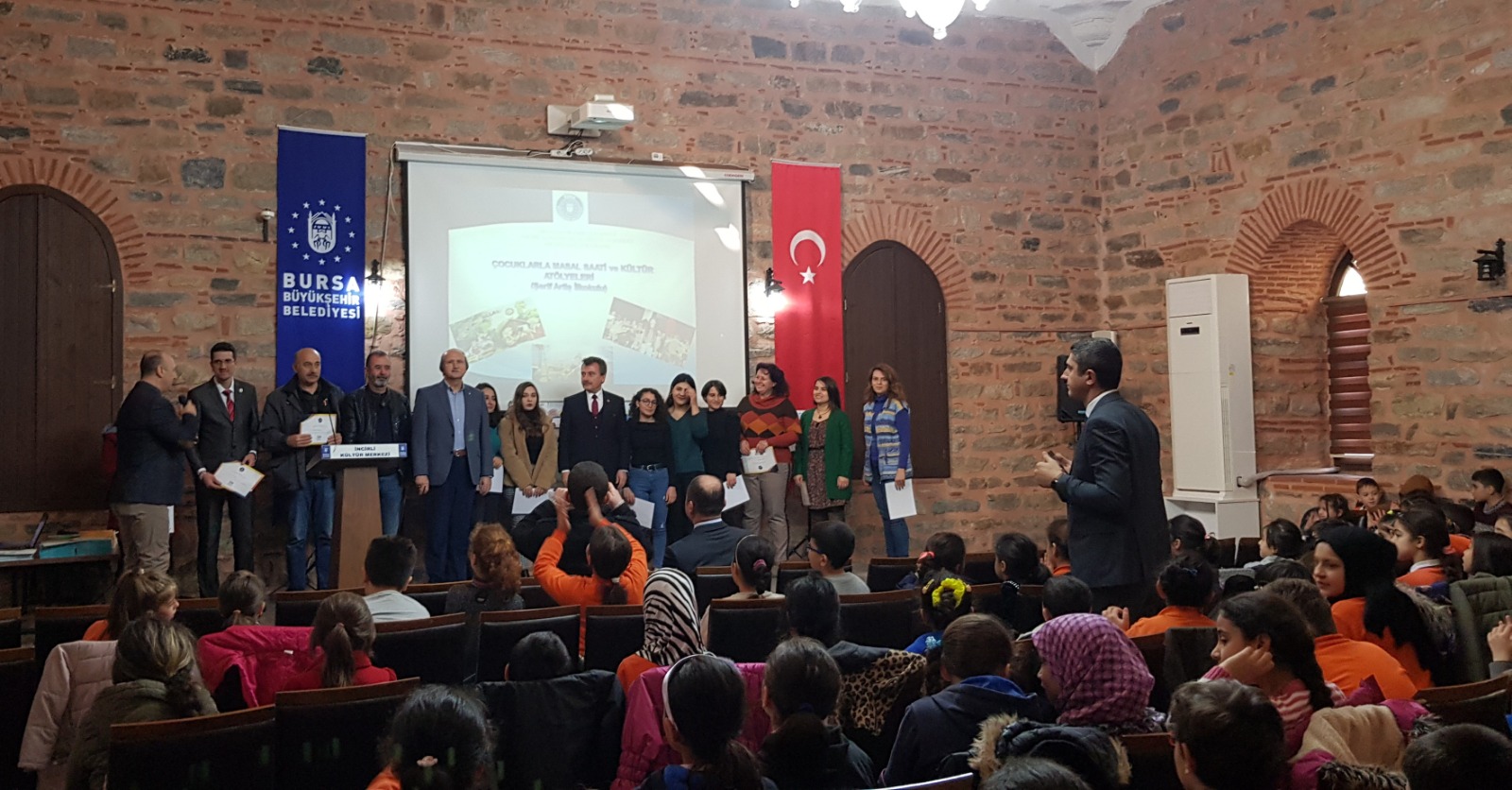 BURSA - Bursa Büyükşehir Belediyesi Kültür ve Sosyal İşler Dairesi Başkanlığı Kültür Şube Müdürlüğü tarafından pilot proje olarak uygulamaya konulan ‘Çocuklarla Masal Saati ve Kültür Atölyeleri Projesi’nin ilk kuru başarılı minik yeteneklere için İncirli Kültür Merkezinde düzenlene belge töreniyle sona erdi.