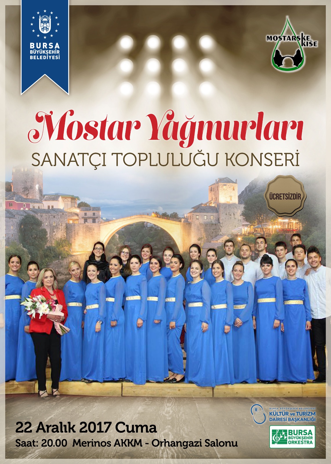 BURSA – Bursa Büyükşehir Belediyesi tarafından organize edilen ‘Mostar Yağmurları Sanatçı Topluluğu Konseri’, 22 Aralık Cuma günü (YARIN) saat 20.00’da Atatürk Kongre Kültür Merkezi (Merinos AKKM) Orhangazi Salonu’nda gerçekleştirilecektir.