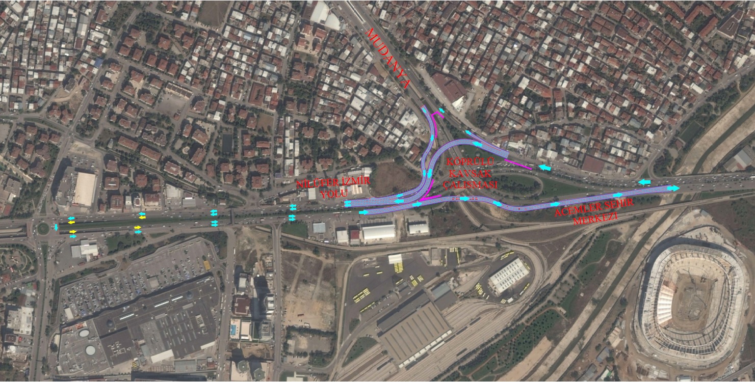 Bursa’da ulaşımı sorun olmaktan çıkarmak amacıyla raylı sistem, yeni yol açma, köprü ve kavşak yapımı çalışmalarına hız veren Büyükşehir Belediyesi, ihtiyacı karşılamakta zorlanan eski köprülerin yenilenmesi için çalışmalarını sürdürüyor. Bursa İzmir yolu ile Mudanya yolunun kesişim noktasında bulunan, yükseklik ve genişlik olarak ihtiyacı karşılamakta zorlanan Mudanya Kavşağı da Büyükşehir Belediyesi ve Karayolları Bölge Müdürlüğü işbirliğinde yenileniyor. Bursa-İzmir D200 Karayolu üzerinde yer alan Mudanya Sapağı Köprülü Kavşağı’nın Stadyum bağlantı yolları ile birlikte bölge trafiğine hizmet edecek şekilde yeniden projelendirilerek yenilenmesi kapsamında inşaat çalışmalarına başlandı. Birinci etap çalışmalarda, köprülü kavşağın yıkımı ve yapımı sırasında alternatif yol olarak kullanılacak olan servis yolları ile bu yollar üzerinde yer alan köprünün inşaat imalatları tamamlanıyor. Büyükşehir Belediyesi tarafından yapılan servis yolları her iki yönde de 3’er şeritli olacak ve inşaat süresince trafikte bir sorun yaşanmayacak.