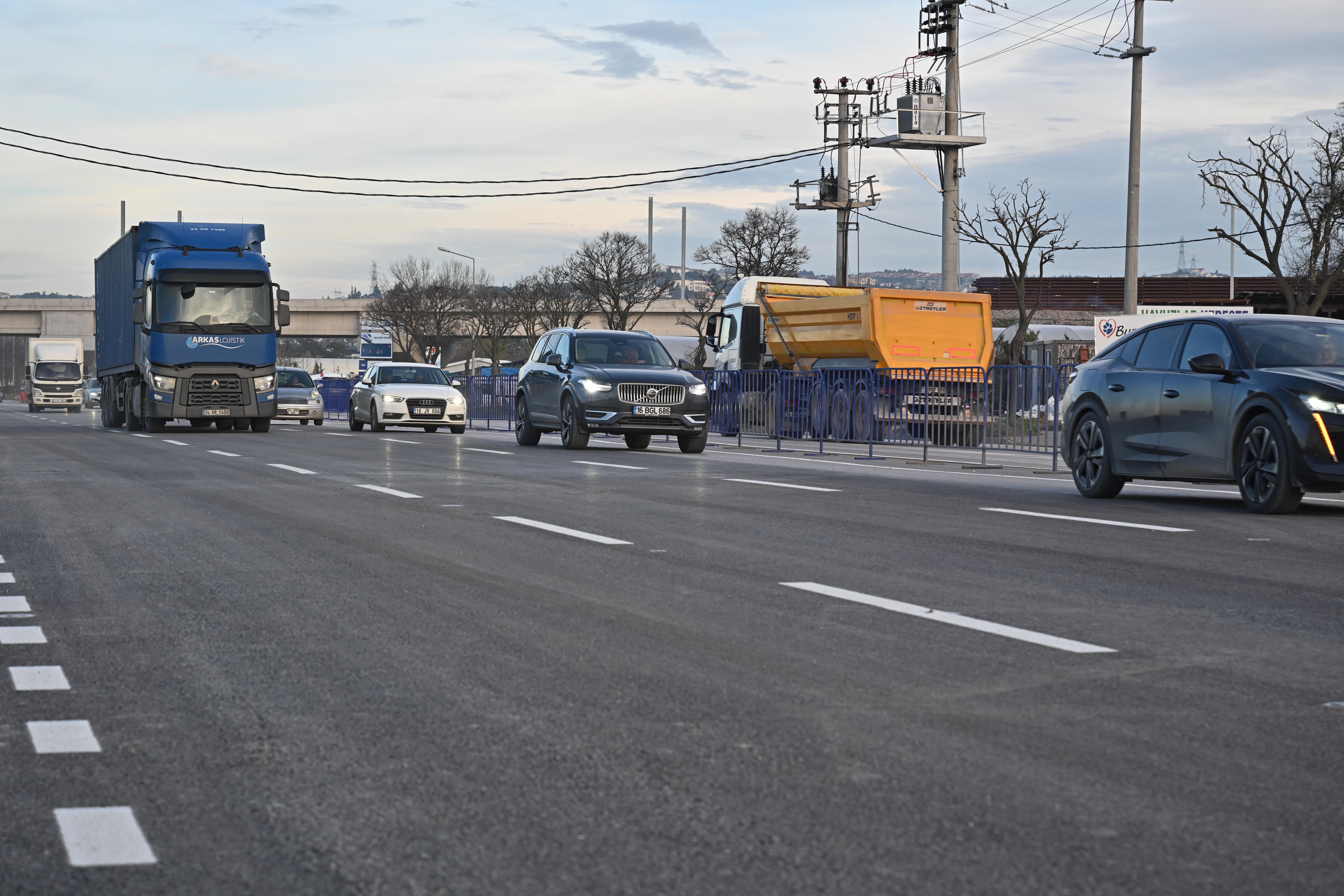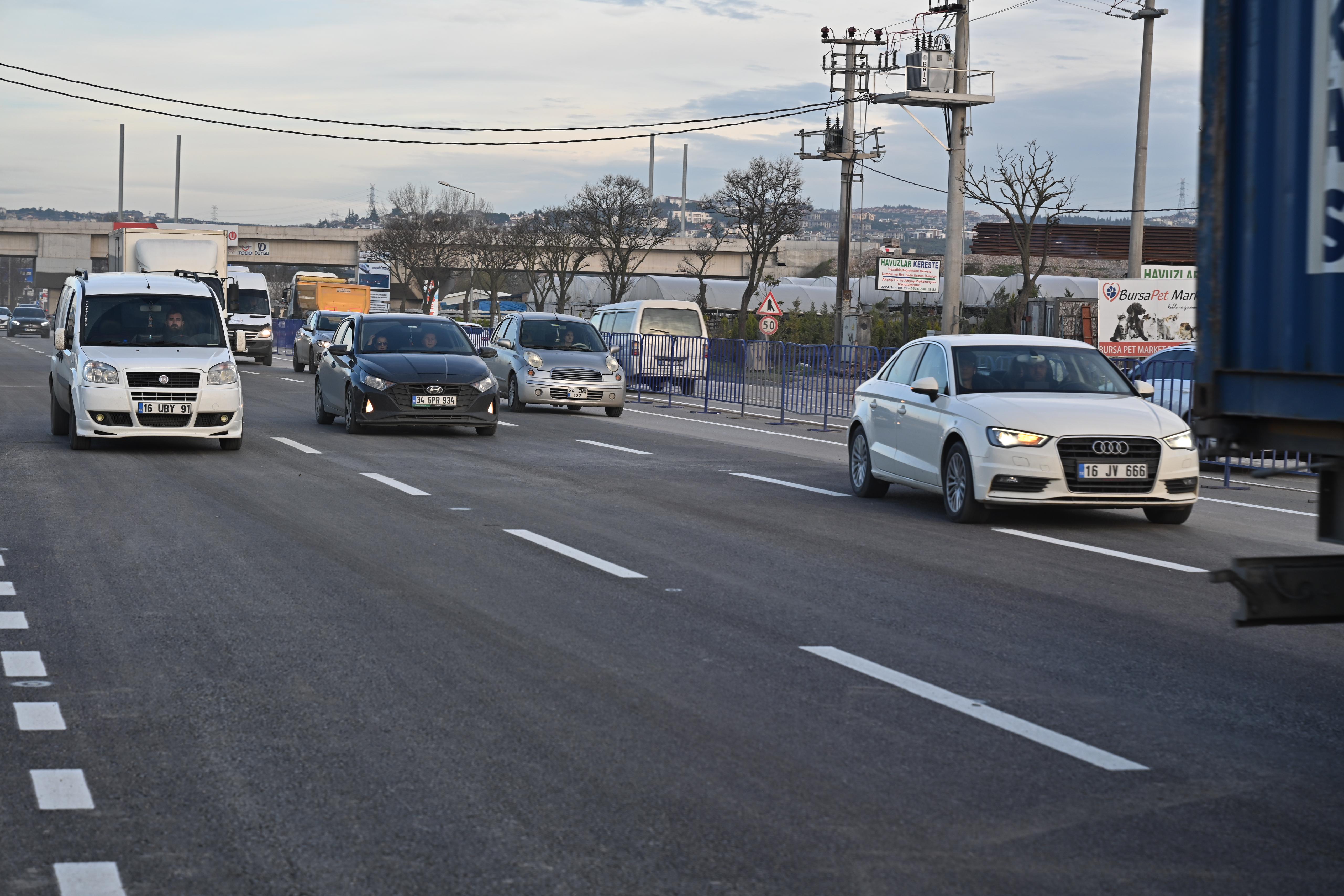 BURSA - Bursa'da Şehir Hastanesi'ne kesintisiz ulaşım için projelendirilen Emek - Şehir Hastanesi Raylı Sistem Hattının karayolu üzerinde devam çalışmaları nedeniyle Mudanya yolu üzerinde yapılan trafik aktarması sona erdi. İlk olarak 11 Eylül 2023'te her iki yönde de 2'şer şerit olarak açılan yol, Geçit bölgesindeki çalışmaların tamamlanmasıyla her iki yönde de 3'er şerit olarak normal seyrine döndü.