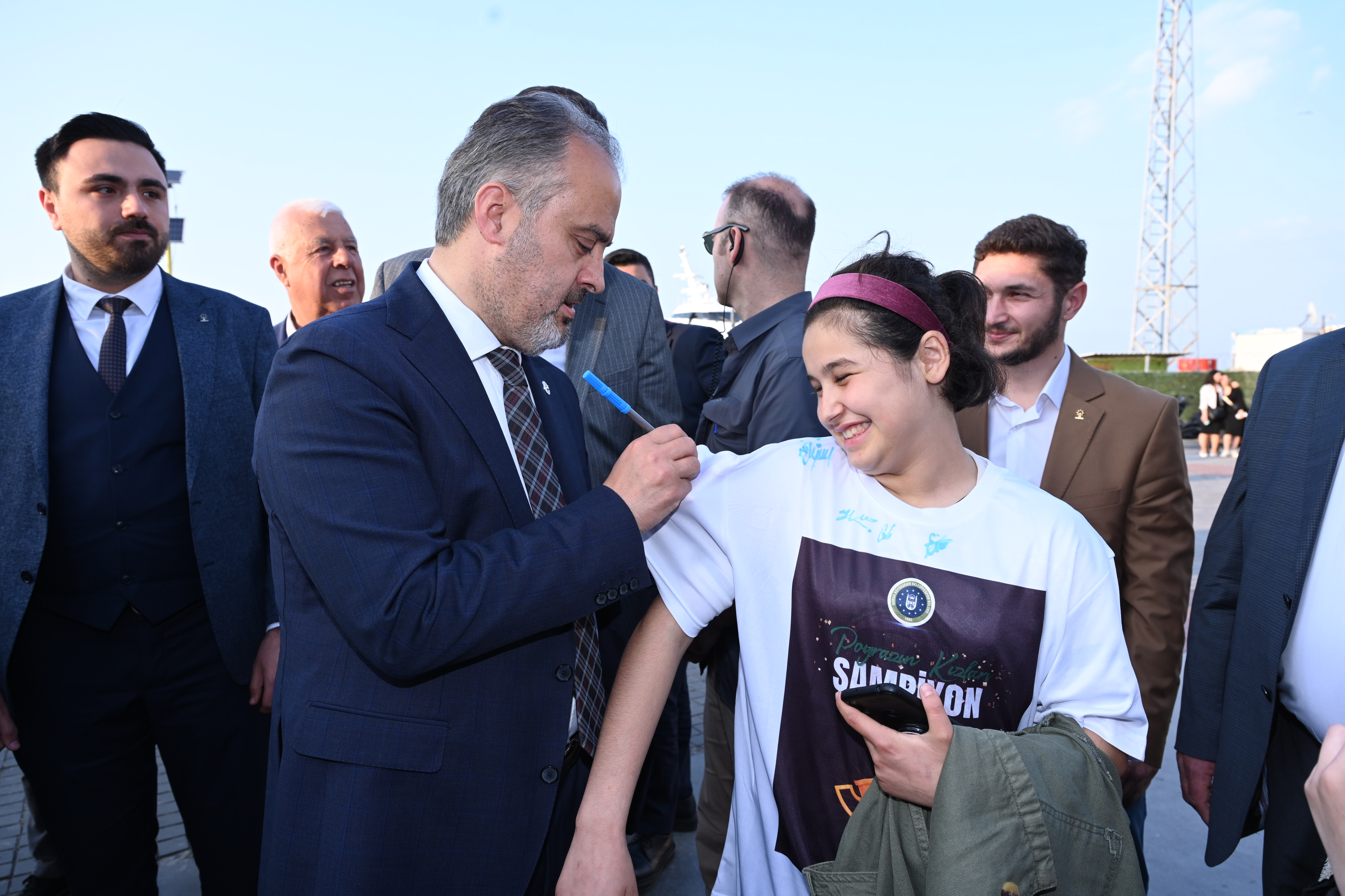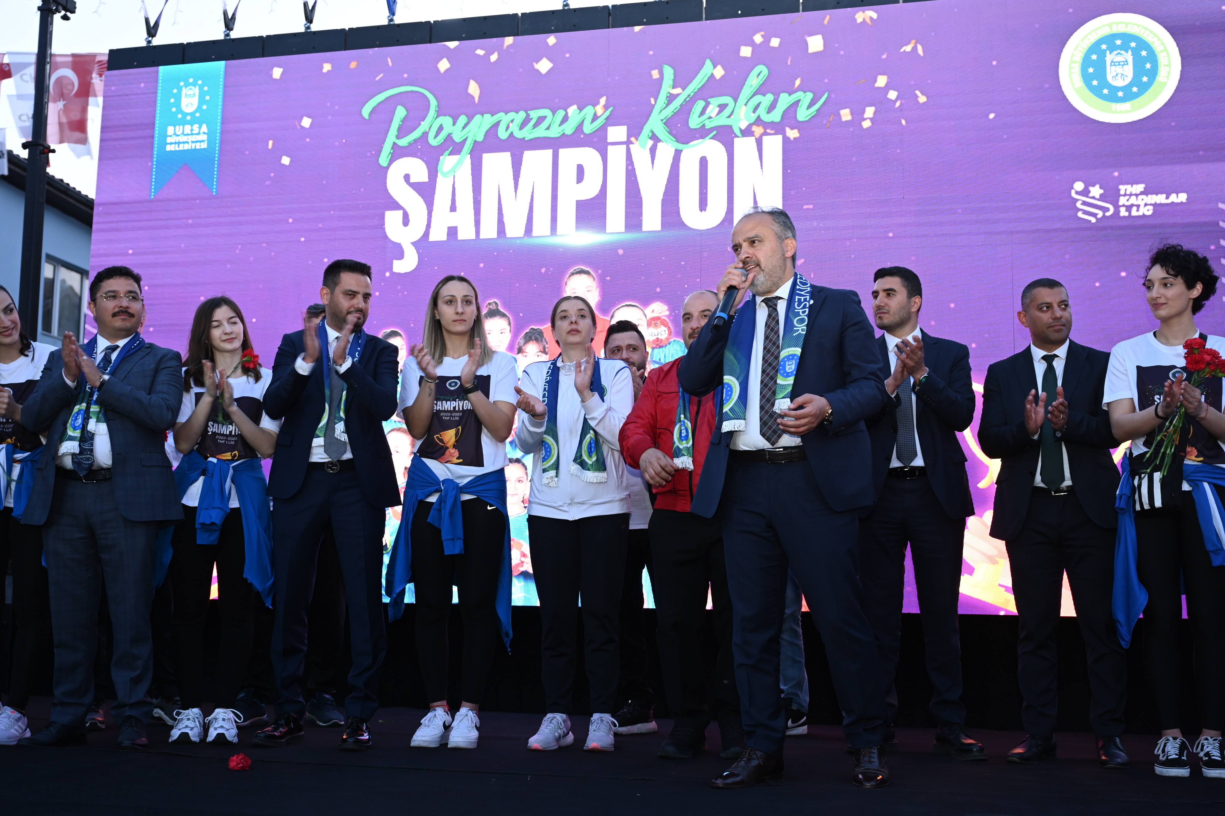 Poyrazın Kızları projesinin kendisine 3 yıl önce geldiğini hatırlatan Bursa Büyükşehir Belediye Başkanı Alinur Aktaş ise, “’Poyrazın Kızları sıkıntılı durumda. Mudanya Belediyesi ilgileniyor ama durumları belli değil’ dediler. Ben de ‘bünyemize almak ayıp olur. Böyle bir şeyi yapmayalım ama destek anlamında üzerimize düşeni yapalım’ dedim. Ancak 2 sene içinde bir arpa boyu yol alınmadı ve daha da geriye gitti süreç. Geçen sene bardak taşmak üzereydi ve devir teslimi yaptık. Kendimize bir hedef koyduk ve 2 yıl içinde Süper Lige çıkaracağız dedik. Ama bizim kızlar felaket. Daha birinci senenin sonunda çıktılar. Her bir kardeşimizi gözlerinden öpüyorum. 18 sporcumuzun 14 tanesinin Bursa orjinli olması bizim ayrıca gururumuz. Artık Süper Ligdeyiz. İnanıyorum ki Poyrazın Kızları Türkiye’de de Avrupa’da da çok daha sert esecek” diye konuştu.