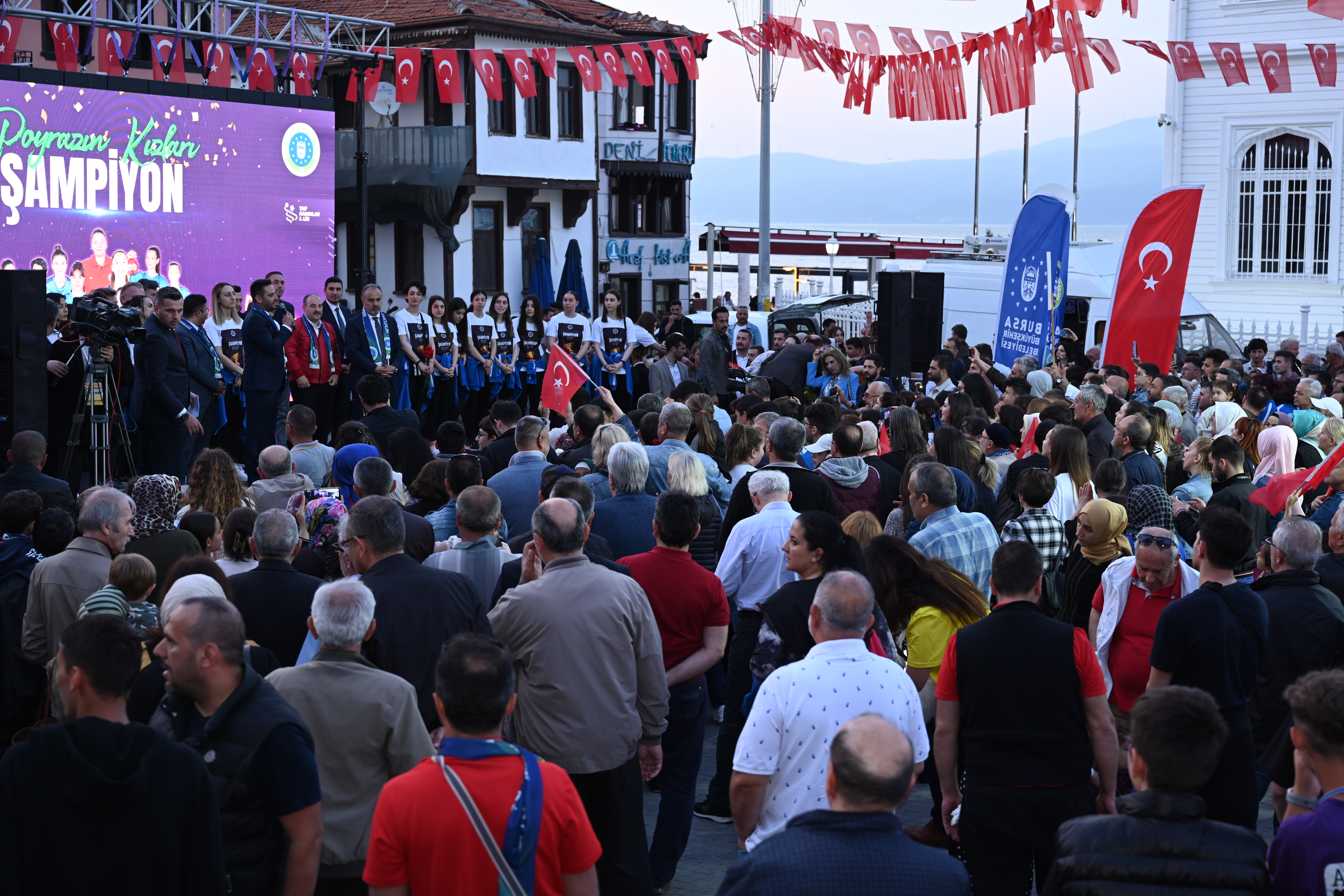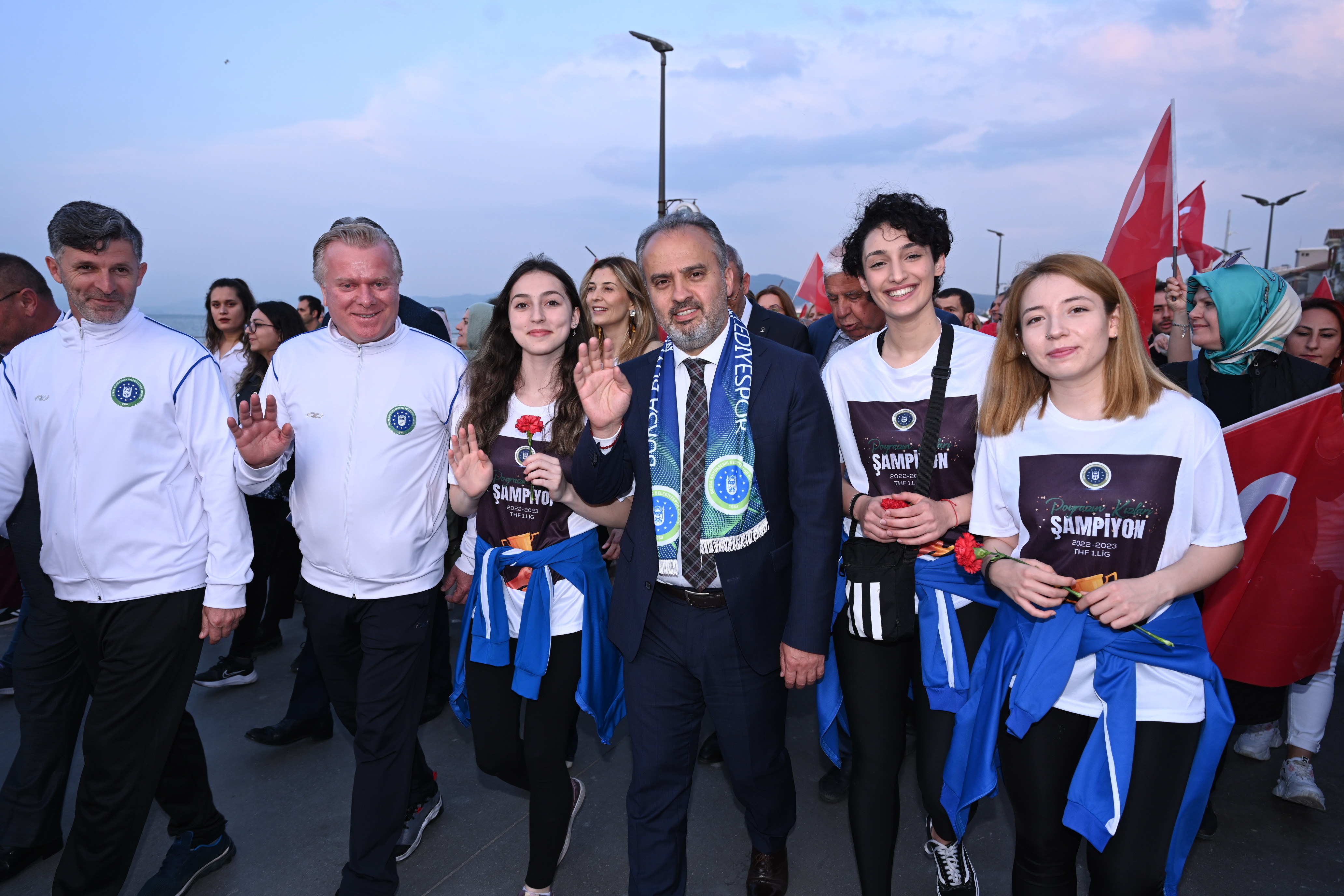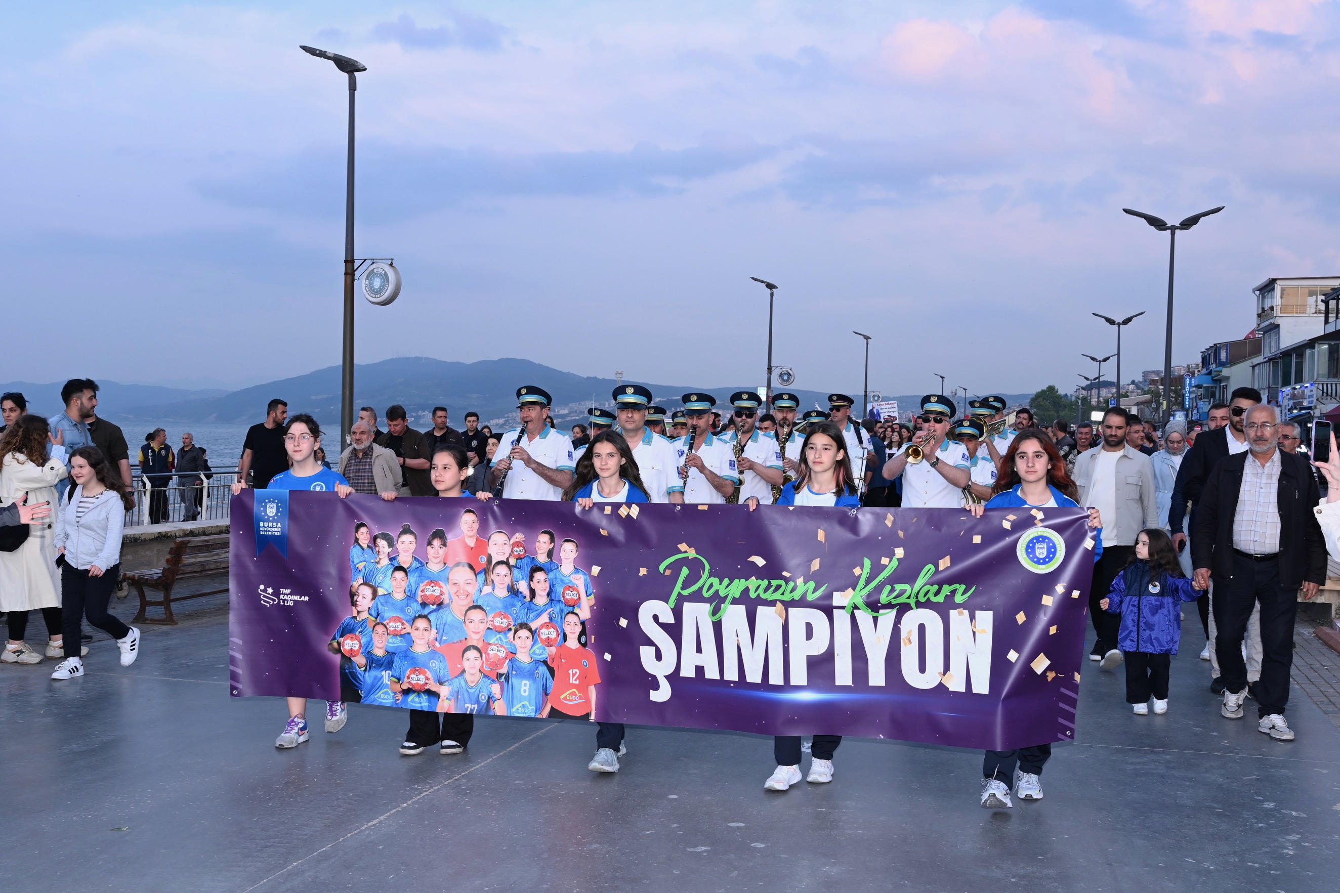 Zonguldak'ta düzenlenen Kadınlar Hentbol 1'inci Ligi play-off maçlarında şampiyon olan, 'Poyrazın Kızları' olarak anılan Bursa Büyükşehir Belediyespor Kulübü Kadın Hentbol Takımı için Mudanya'da coşkulu bir kutlama yapıldı. Bursa Büyükşehir Belediye Başkanı Alinur Aktaş ile Sanayi ve Teknoloji Bakanı Mustafa Varank’ın da katıldığı etkinlikte BUDO İskelesi'nden Mudanya Mütareke Meydanı'na kadar kortej yürüyüşü düzenlendi. Mudanyalıların alkışları arasında yapılan kortejin ardından Mütareke Meydanı’nda kutlamalar başladı.