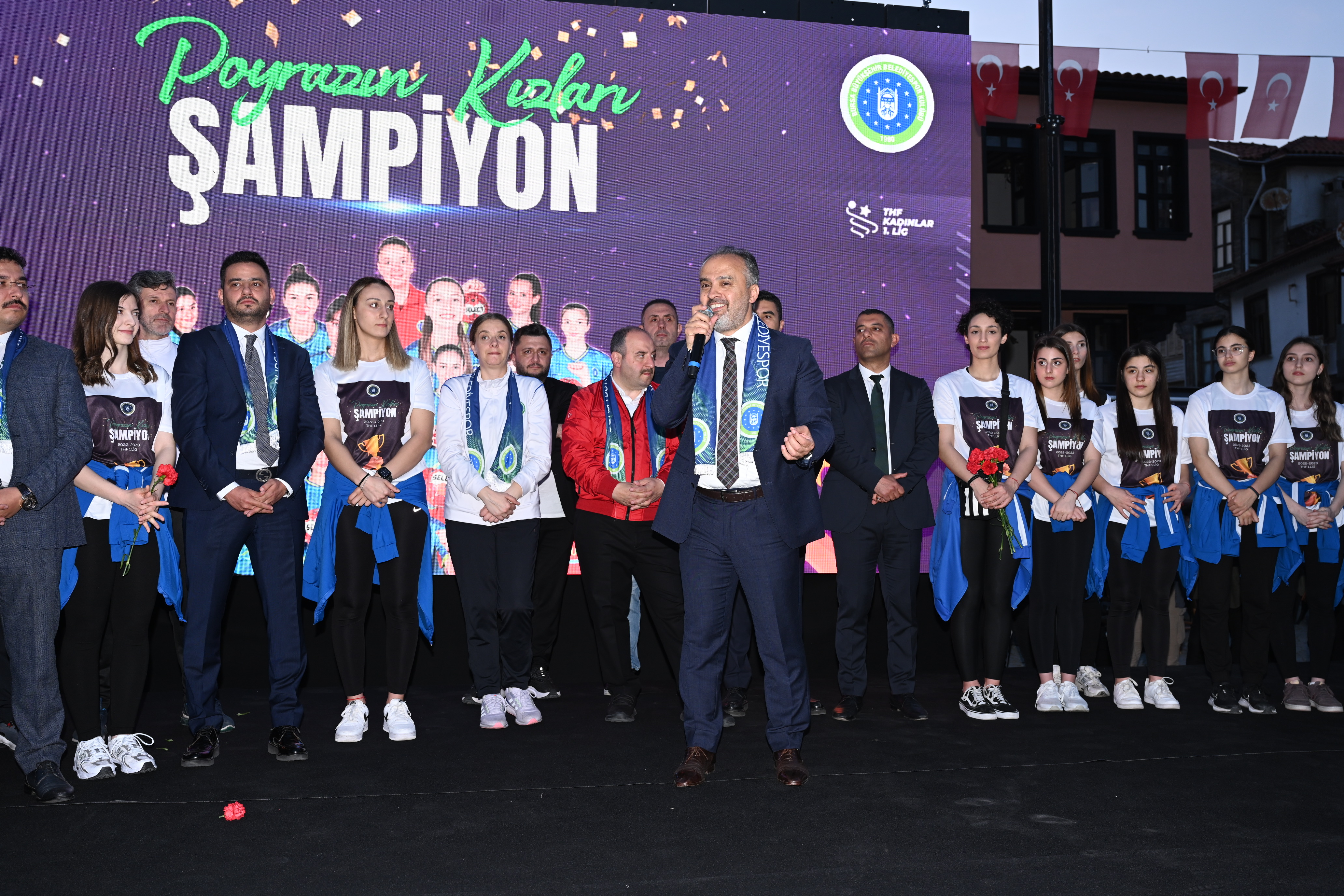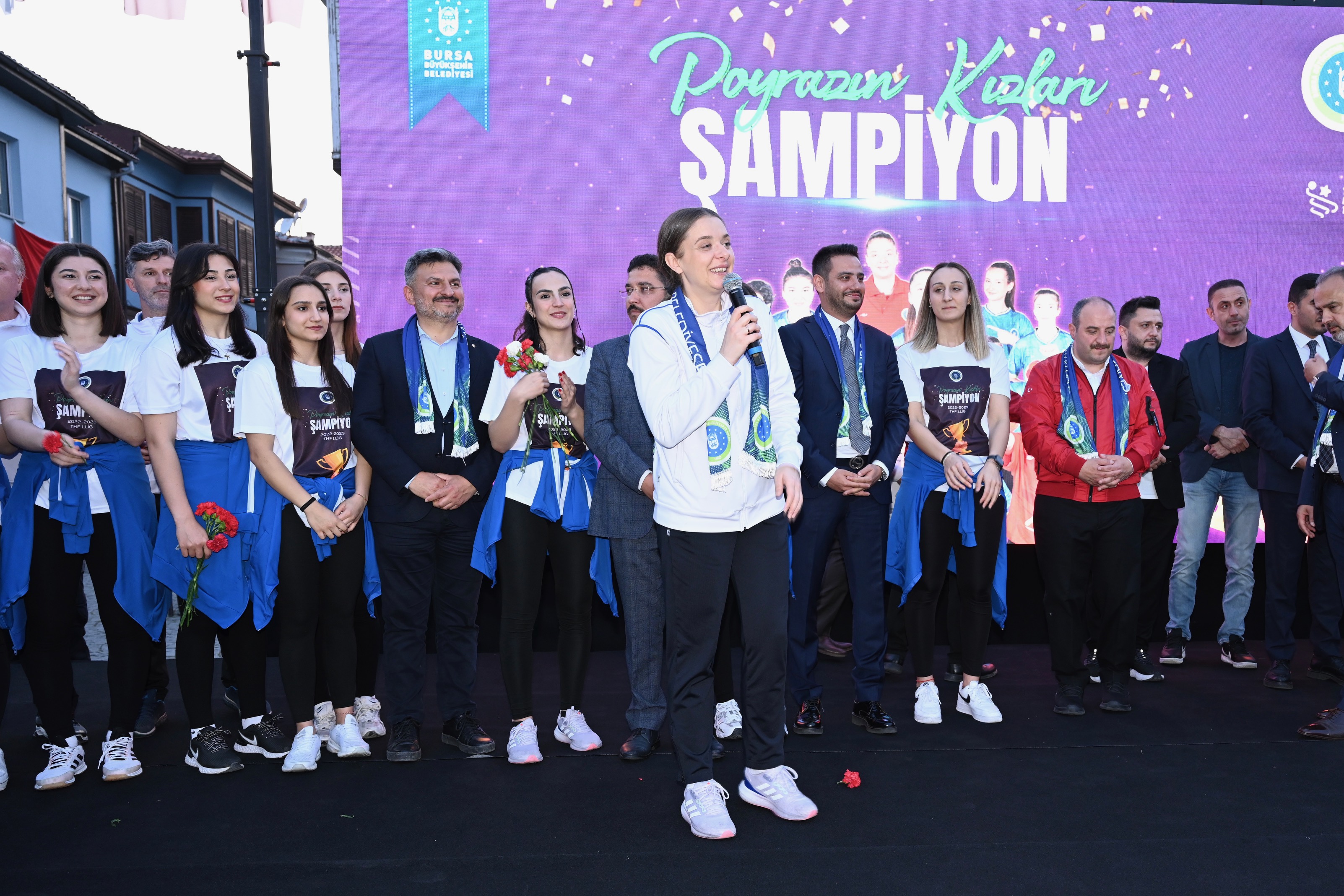 BURSA - Kadınlar Hentbol 1'inci Ligi'ni şampiyon tamamlayıp Süper Lig'e çıkan Bursa Büyükşehir Belediyespor Kulübü Kadın Hentbol Takımı Poyrazın Kızları, Mudanya’da şampiyonluğu kutladı. Sanayi ve Teknoloji Bakanı Mustafa Varank’ın da katıldığı kutlamada konuşan Bursa Büyükşehir Belediye Başkanı Alinur Aktaş, ‘Poyrazın’ artık Türkiye’de ve Avrupa’da da çok sert eseceğini söyledi.