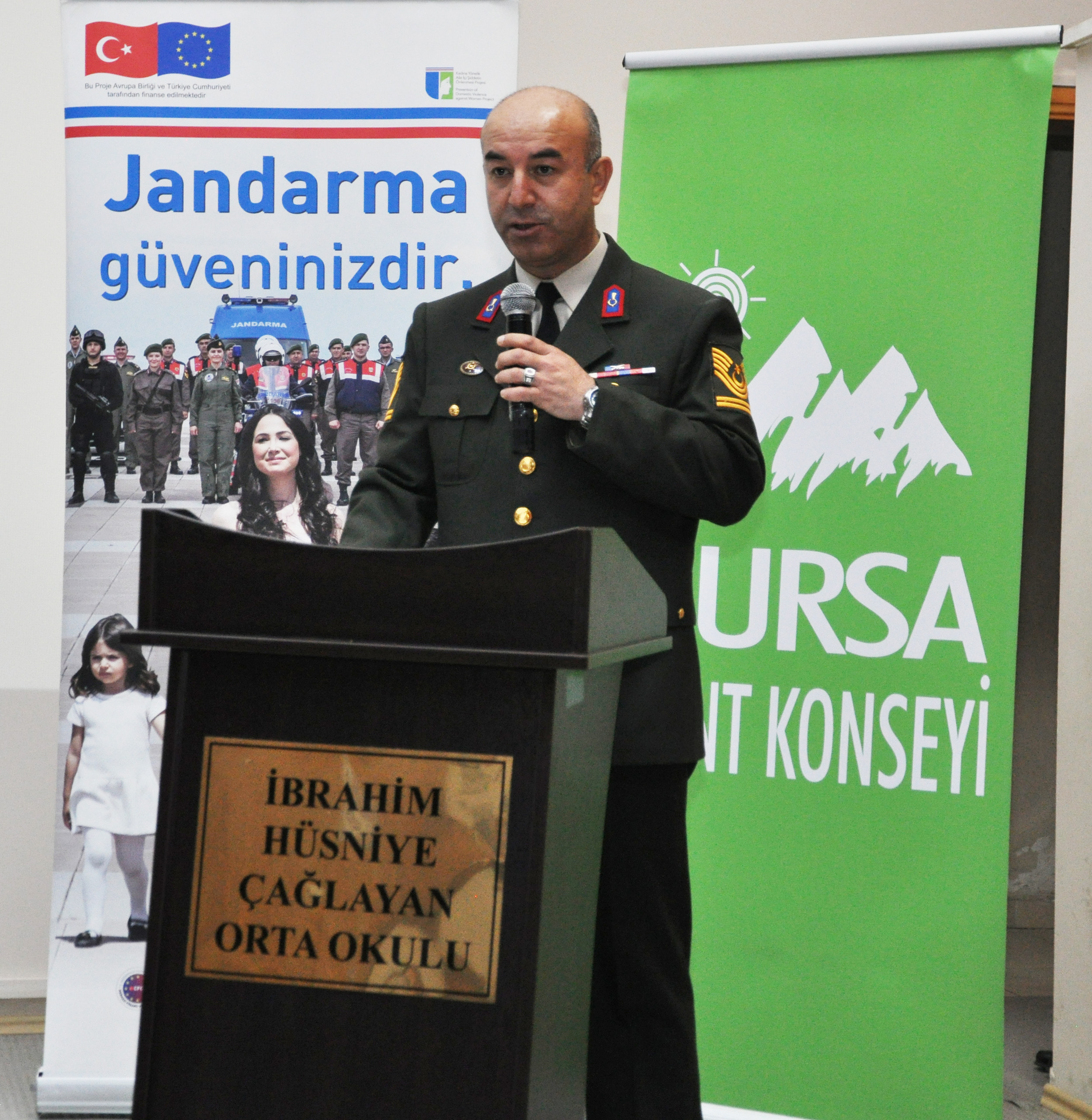 Evlilik Kurumunu Tanıyorum Projesi’nin Bursa Kent Konseyi ve İl Jandarma Komutanlığı arasındaki ilk ortak çalışma olduğunu söyleyen Orhaneli İlçe Jandarma Komutanı Vekili Kd. Bçvş. Murtaza Sümer, çalışmanın muhtarlara yönelik olması sebebiyle ayrıca önem taşıdığını söyledi. Projenin hayata geçirilmesinde katkı sunan Bursa Valiliği, İl Jandarma Komutanlığı’na, Büyükşehir Belediyesi’ne, Bursa Kent Konseyi’ne ile Aile ve Sosyal Politikalar İl Müdürlüğü’ne teşekkür eden Sümer, kadına yönelik şiddetin kadının maddi ve manevi varlığına büyük hasar verdiğini ve anayasal bir suç olduğunu hatırlattı. Şiddetin sadece kadın sorunu olmadığını belirten Sümer, jandarmanın her türlü şiddetin karşısında olduğunu vurguladı.